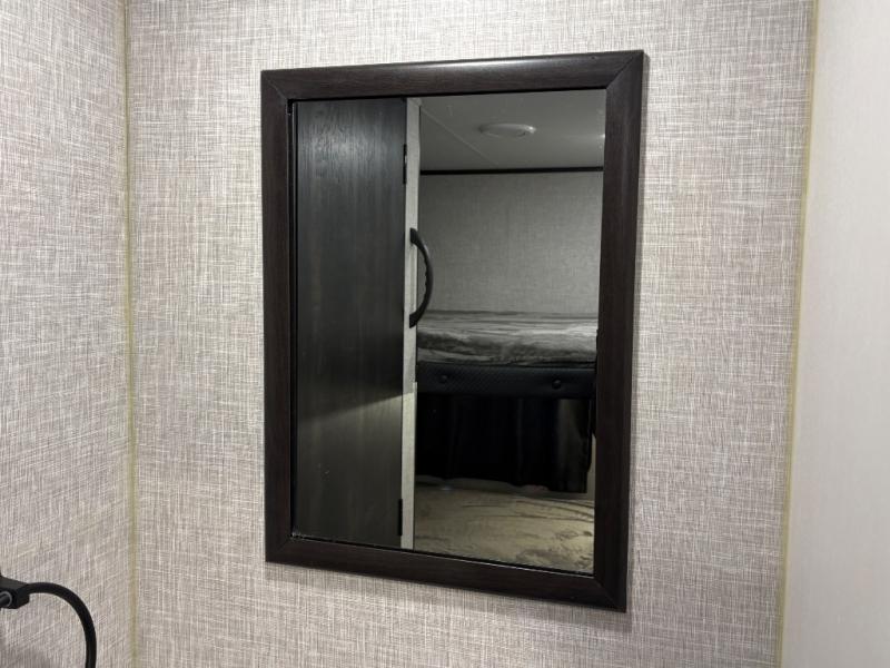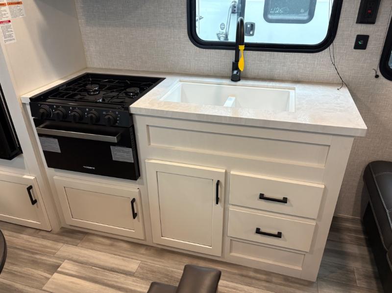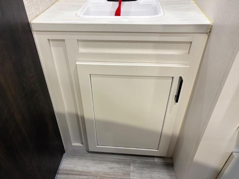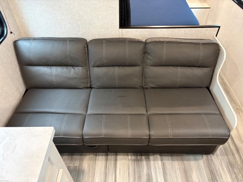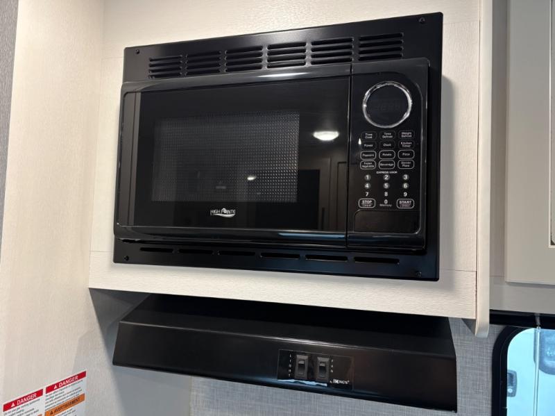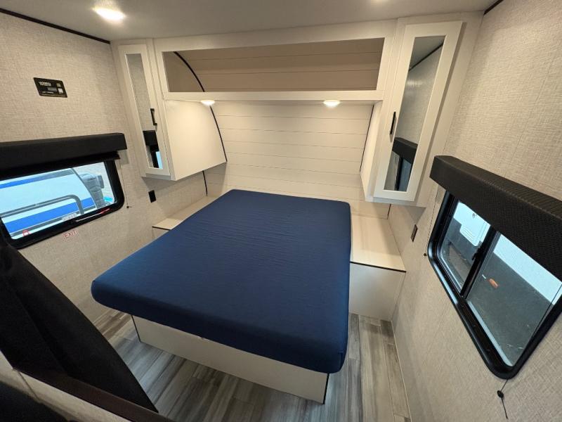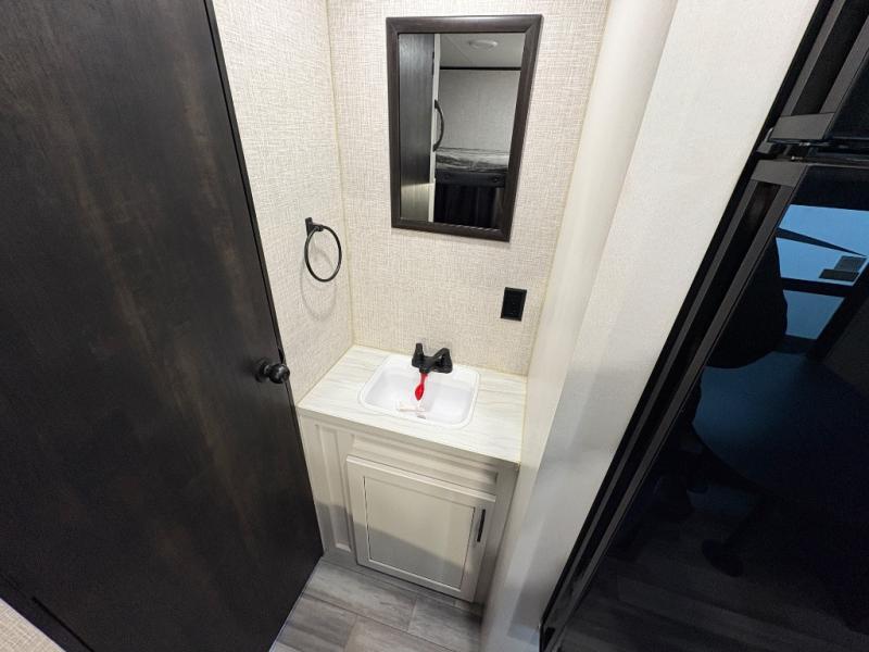 Get ready for family fun or a friend's weekend at the campgrounds in this trailer! This trailer offers full kitchen amenities including a pantry for snacks and such, plus a full rear corner bathroom for privacy and includes a shower. When you need a break, the semi-private bedroom up front offers a queen bed, dual wardrobes and a curtain to close, and the double size bunks offer a curtain to close as well. There is a 13' power awing with LED lights for you to enjoy this outdoor space into the night, plus exterior storage for your outdoor games and gear.