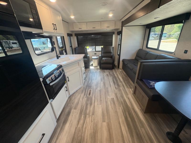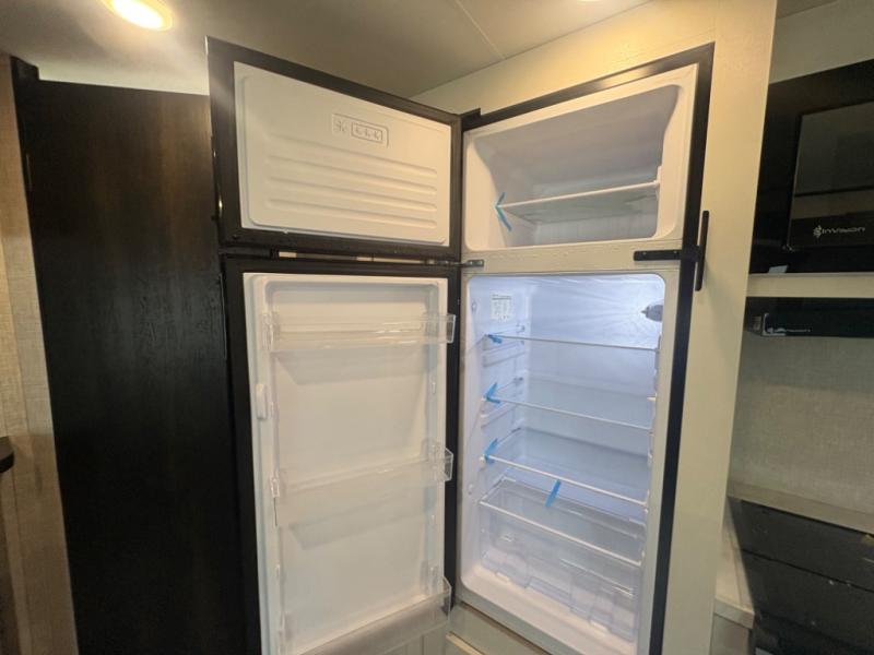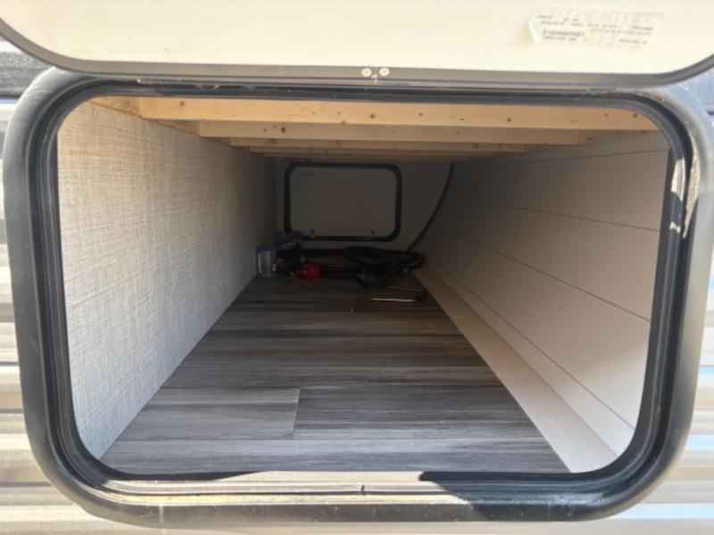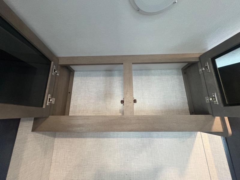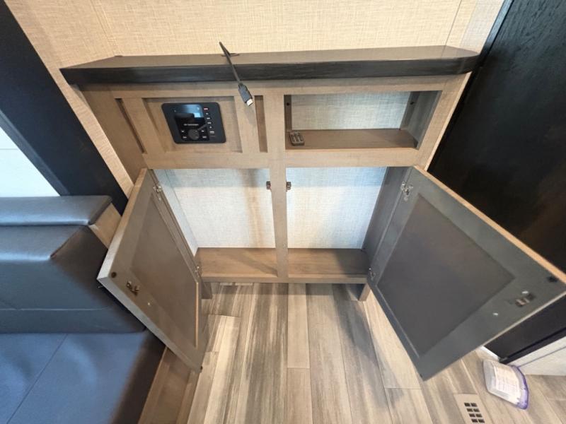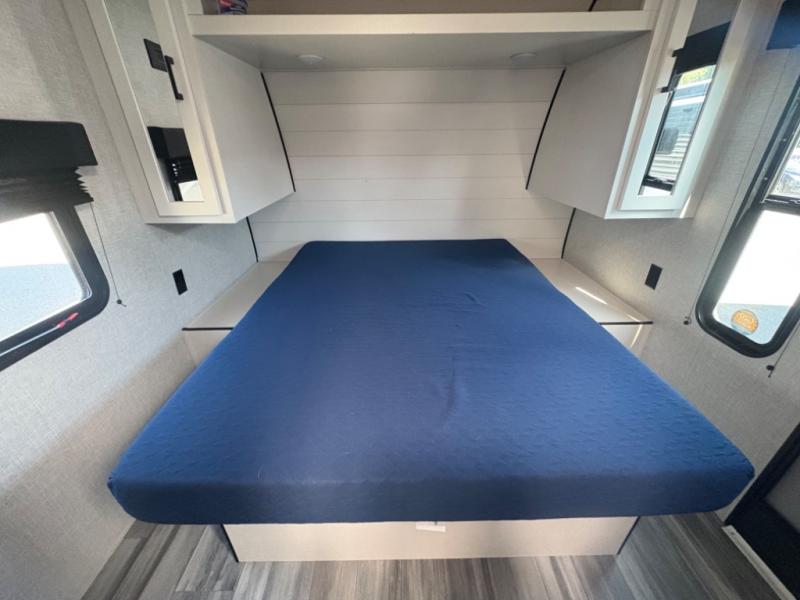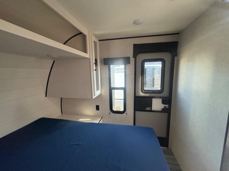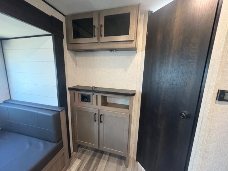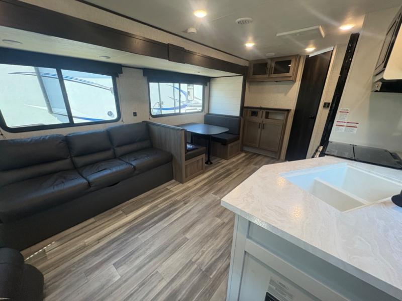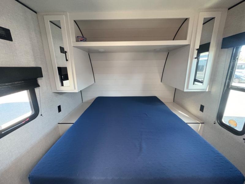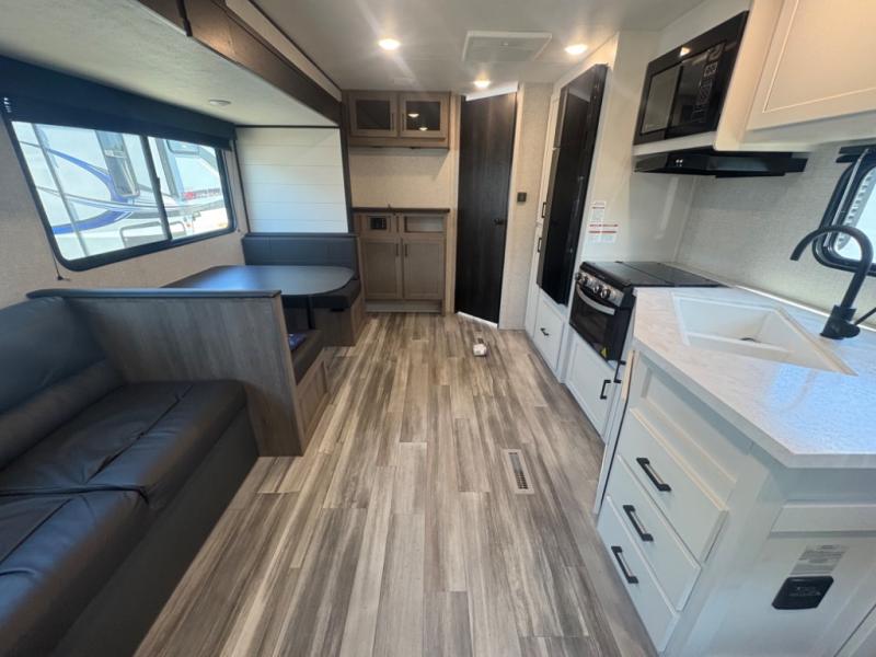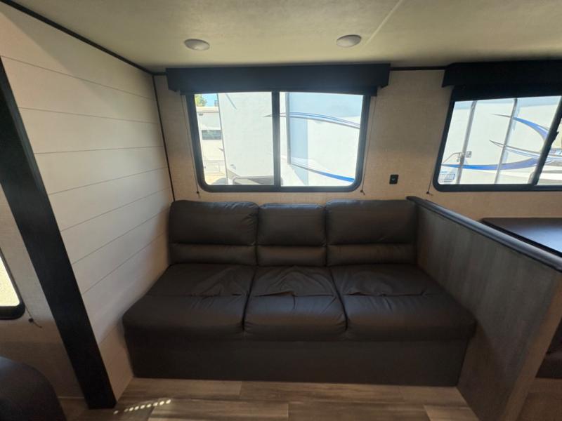 You can comfortably sleep up to six people in this trailer thanks to the RV queen bed in the front bedroom, plus the booth dinette and jack-knife sofa in the main living area! The chef of your crew will have a three burner cooktop and microwave oven to prepare meals, and everyone can store their favorite drinks in the 8 cu. ft. 12V refrigerator. The walk-through bath is spacious and includes a radius shower, toilet, a sink, and linen closet and is the full width of the unit. The outside storage will let you bring along camp chairs and games, fishing poles and more, plus the 18' power awning with LED lights will create a nice place to gather in the evenings!