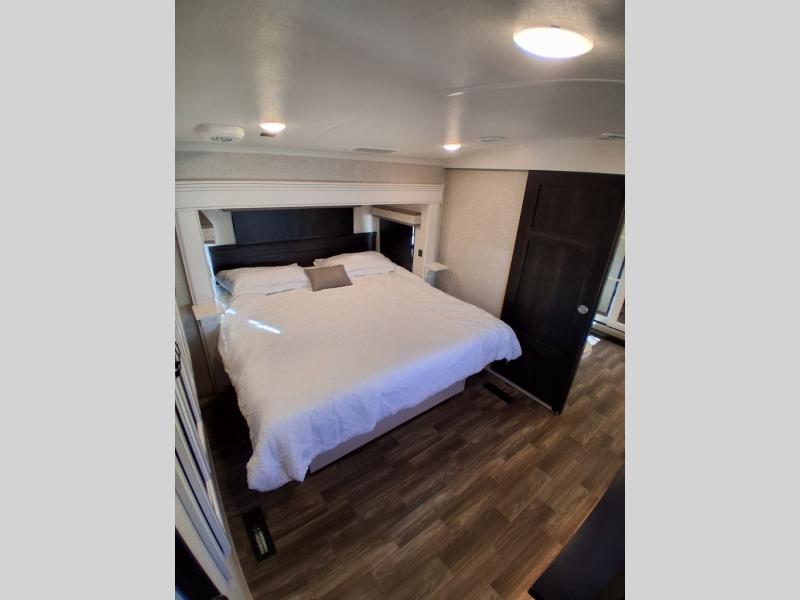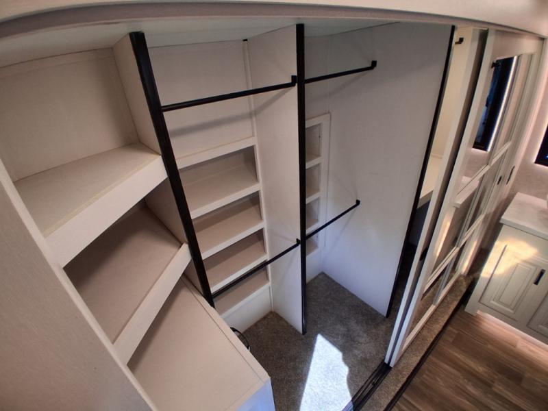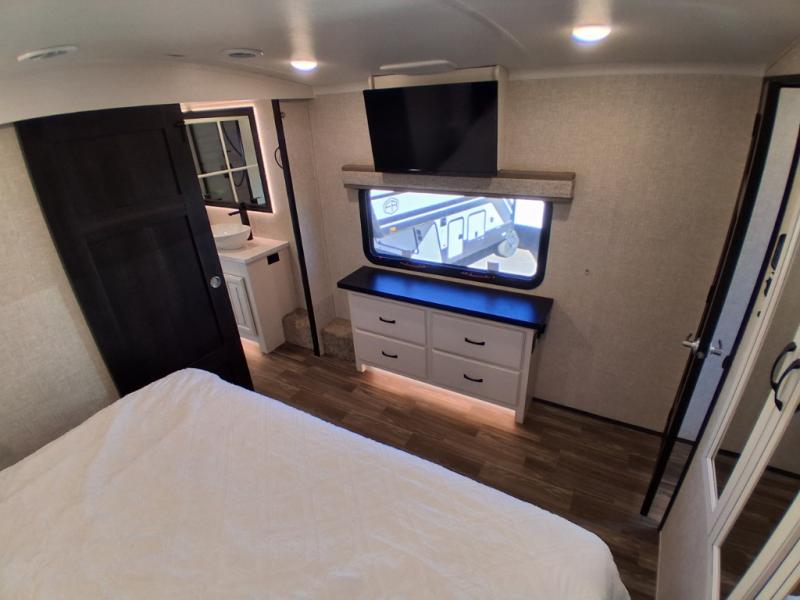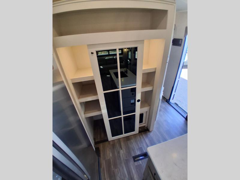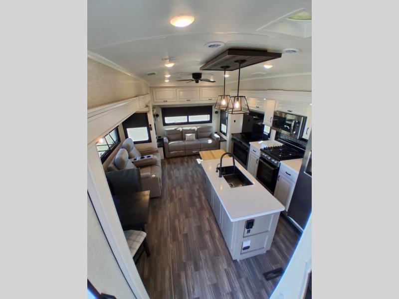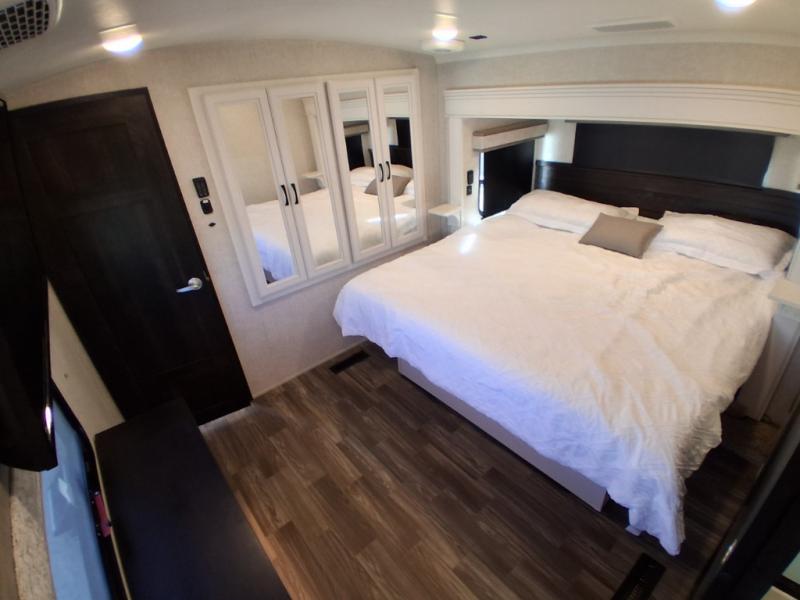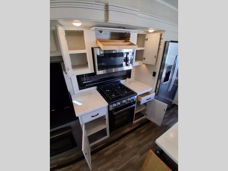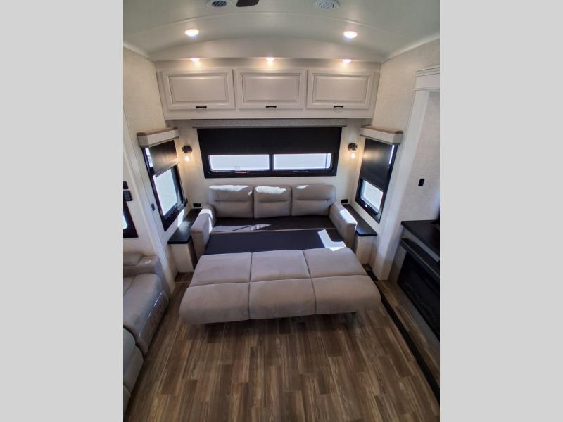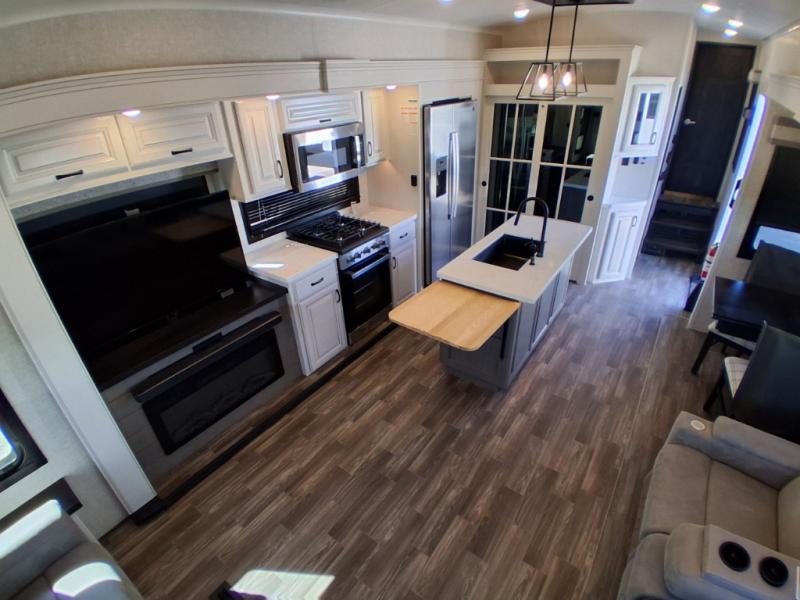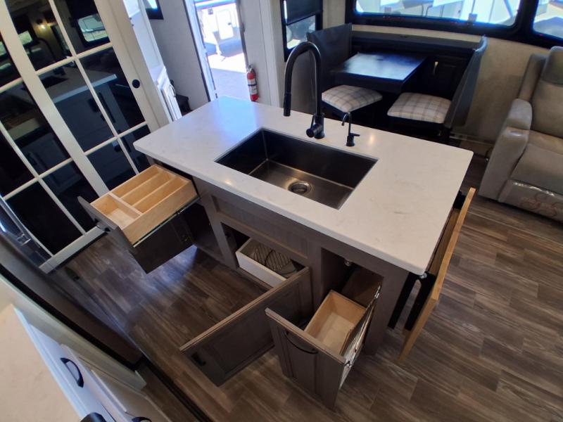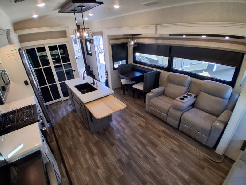 Finding the perfect RV park or campground is all you have to do, then you can load up and hit the road whether you are a full-timer or weekend warrior. The two electric awnings and the three slides are easy to set up and close, and you will have lots of interior and exterior storage to bring everything you might need. The kitchen offers a residential refrigerator and 24" stove, a 30" residential microwave, a kitchen island, a pantry and a pull-out countertop. You can relax on the tri-fold sofa and the theater seats while watching your shows on the 50" Smart LED HDTV with fully digital HDMI output and home entertainment system with subwoofer plus there is a fireplace below. Dine at the free standing table which includes a leaf, two free standing chairs and two folding chairs, or you can work from here as well. The front bedroom offers a king bed slide and a flip-top dresser with 32" TV, plus access to a spacious private front bath including dual sinks, a walk-in closet, bench seat, and more.