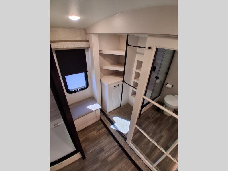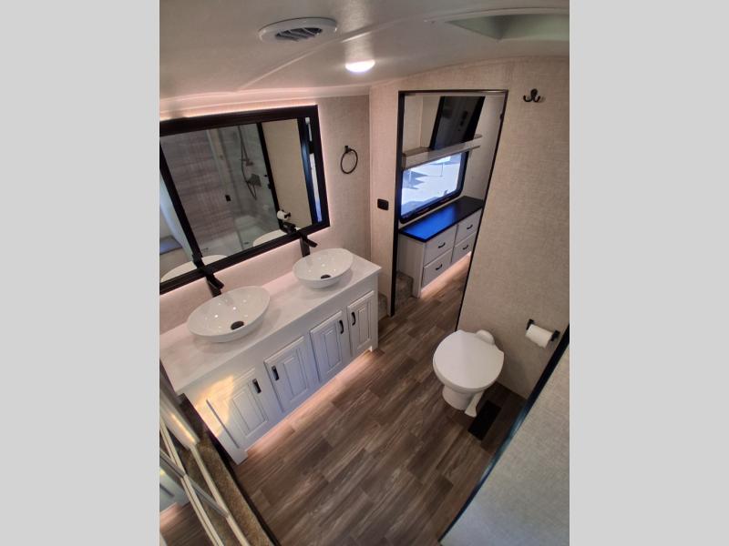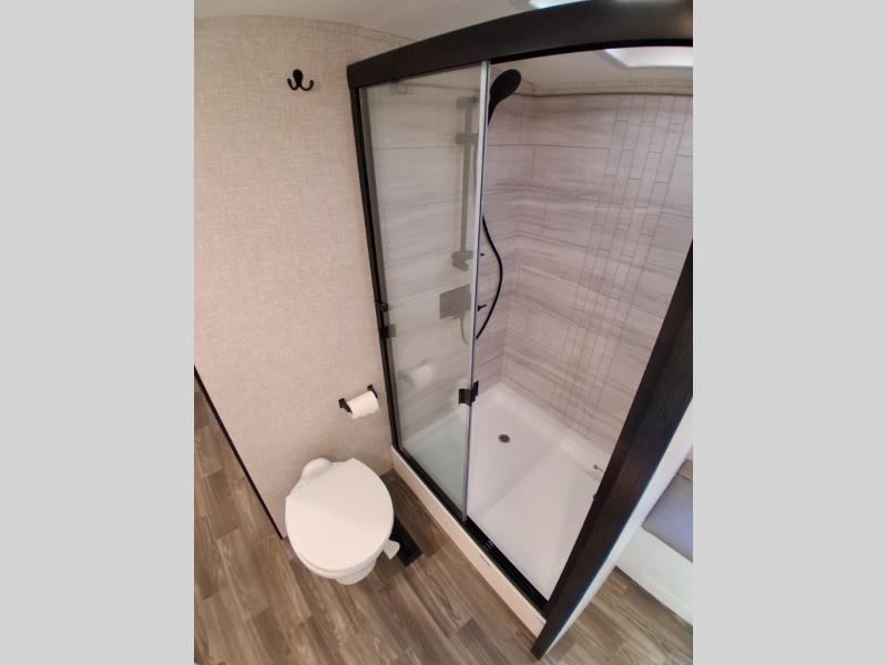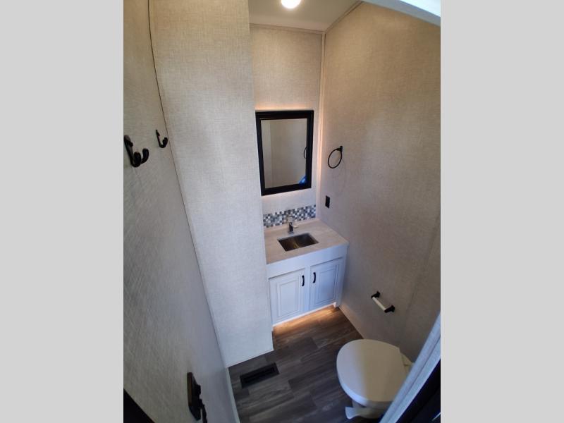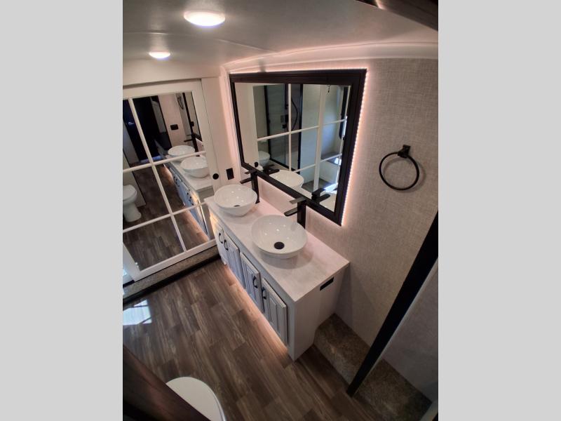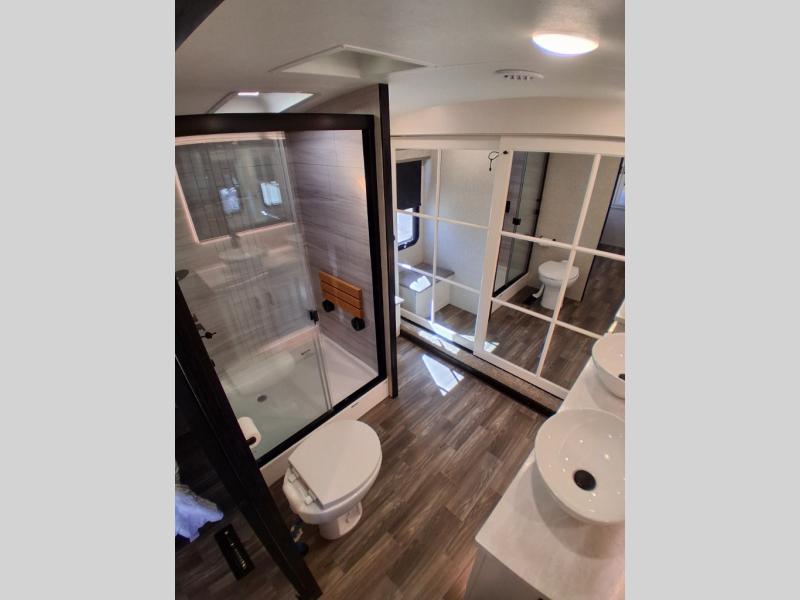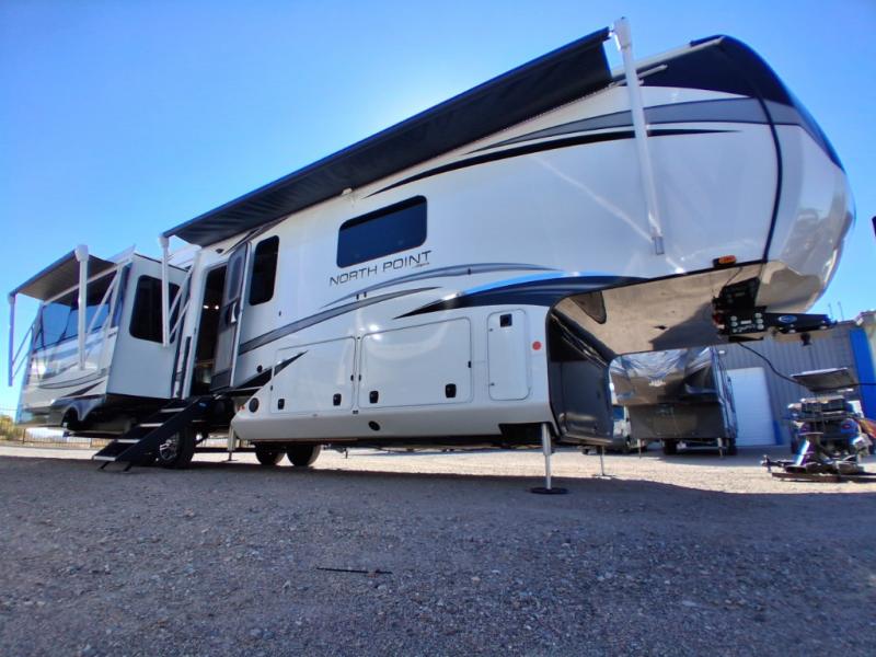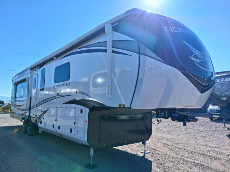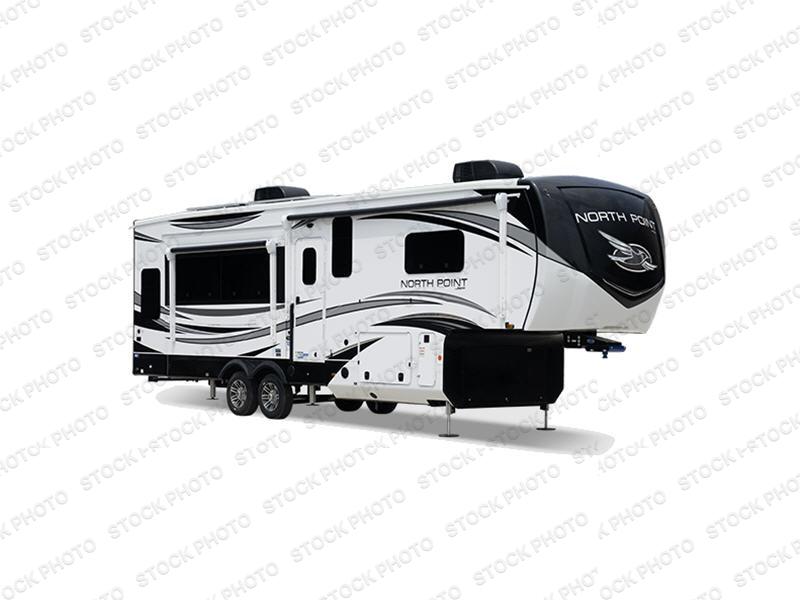 With any North Point fifth wheel by Jayco you begin with a strong foundation with a custom frame, designed and sized specifically to best support each unit. Constructed with Stronghold VBL™ aluminum framed, vacuum bond laminated walls and the Magnum Truss™ XL6™ roof system with a one-piece, seamless roof material, which is the strongest tested roof in the industry. The 5-Star Handling package is included with Uniroyal tires, a MORryde rubber pin box, Dexter axles with Nev-R-Adjust brakes, MORryde CRE-3000 rubberized suspension and wet bolt fasteners and bronze bushings. The interior has handcrafted hardwood glazed doors and drawers, vinyl flooring throughout, a vessel bowl sink with high rise faucet in the main bathroom, plus so much more you just have to see one to believe it all!