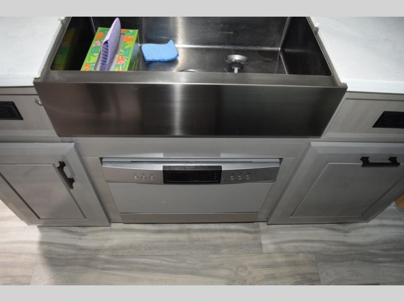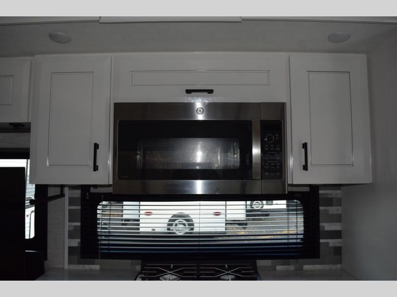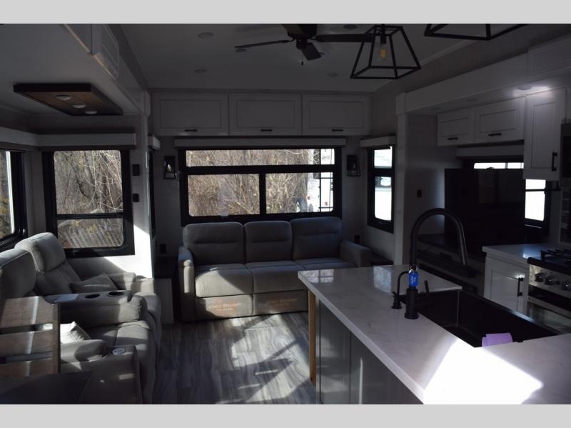 Each Pinnacle fifth wheel features Stronghold VBL lamination for the lightest, yet strongest construction in the RV industry. Add that to the Magnum Truss XL6 roof system and Climate Shield zero-degree tested weather protection and you'll be enjoying your fifth wheel for years to come. Some of the exterior conveniences you will appreciate are the Keyed-Alike lock system, the fully enclosed, universal docking center, and the 6-point hydraulic auto-leveling system for quick and easy set up. The 5 Star Handling Package will make towing a fifth wheel a walk in the park, and the two Whisper Quiet A/C units will keep you comfortable during the hot summer months. Inside, you'll enjoy the farmhouse stainless steel sink, the handcrafted hardwood glazed cabinetry, the vinyl flooring throughout, plus many more comforts. There is even a central vacuum system, a wireless remote control system, USB ports throughout, plus many more conveniences to make each trip enjoyable.