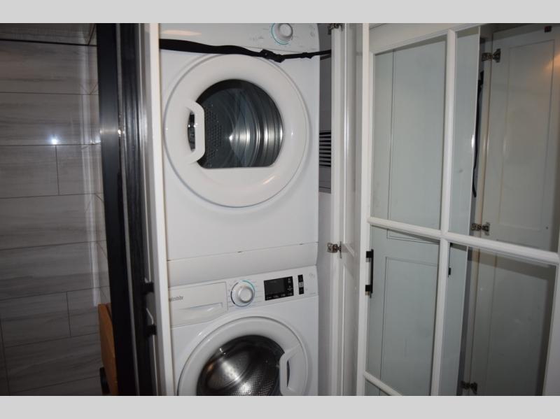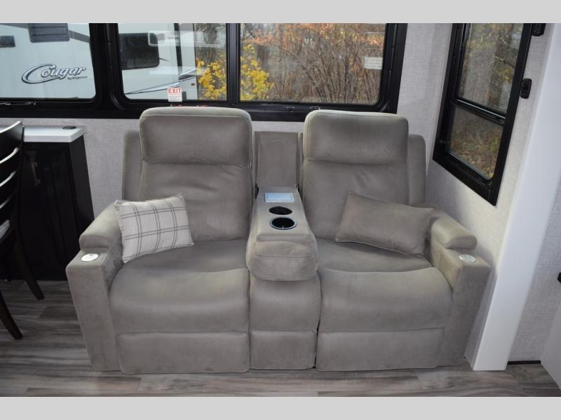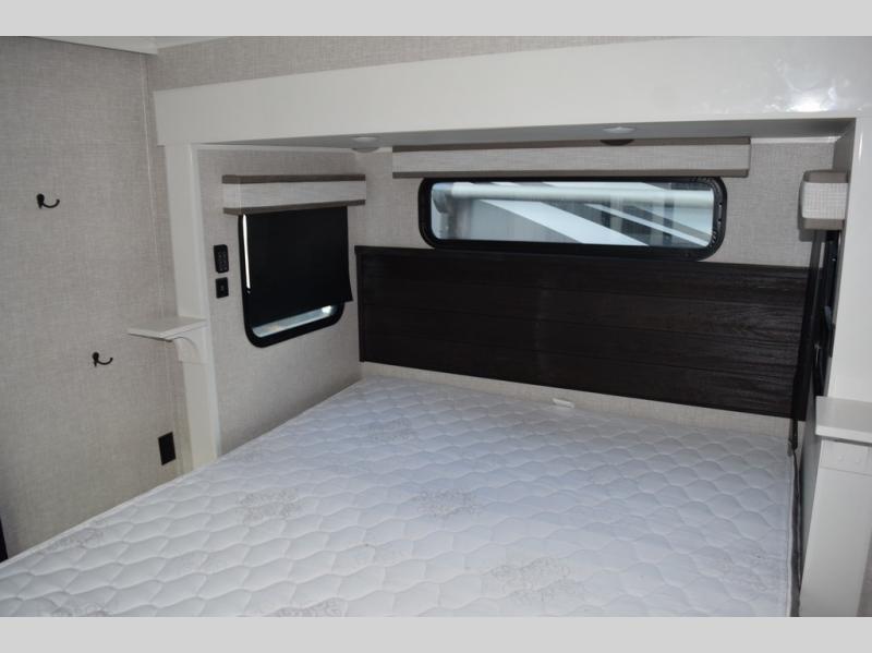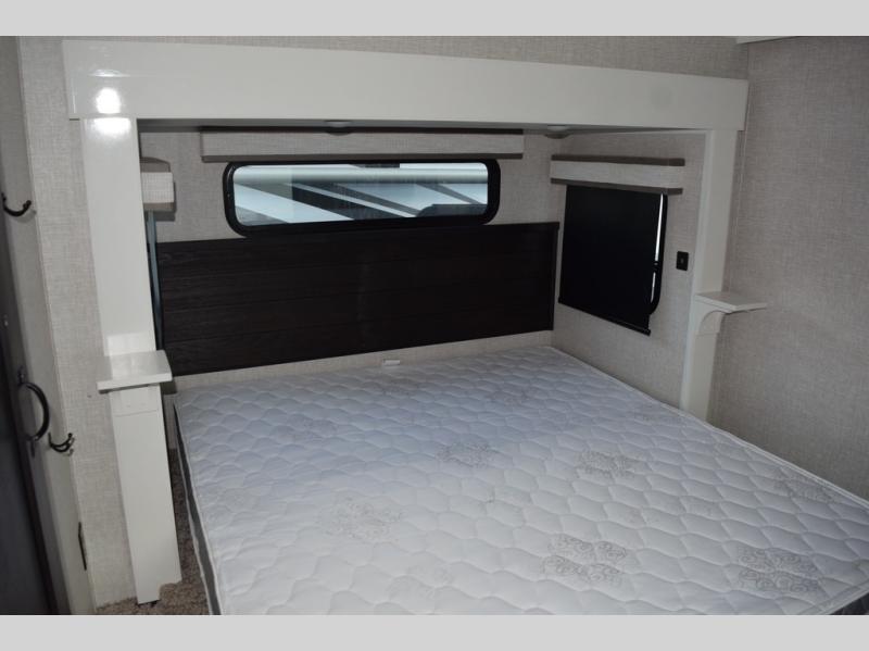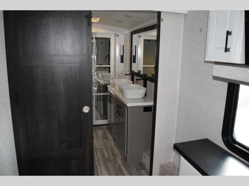 You can't go wrong with this fifth wheel that can sleep four! You will love how much space you have in the main living area thanks to the dual opposing slides, and there is a kitchen island here with a pull-out extension for added prep space. The convenient half bath is right off of the kitchen for quick restroom breaks, and you'll find a shoe garage and a wardrobe just as you enter the unit to keep the RV tidy. Head to the master bedroom for a rest on the king bed slide out, or you may want to watch a show on the 32" bedroom TV. The front master bath may be your favorite feature of this unit. Here, you'll find dual bath sinks, a walk-in shower with a seat, plus a spacious walk-in closet for your clothes. And don't overlook the exterior with its two power awnings, 32" exterior TV, and a Jayport with LP quick connect for your outdoor grill.