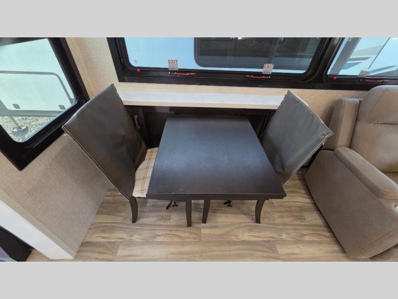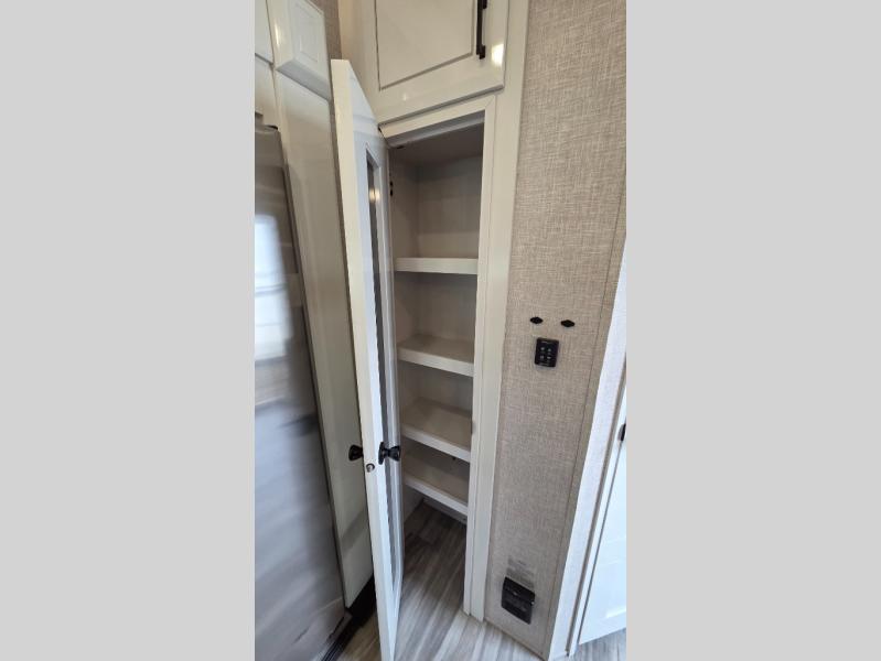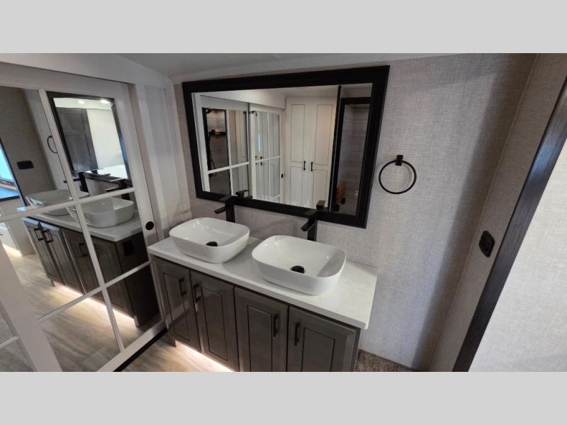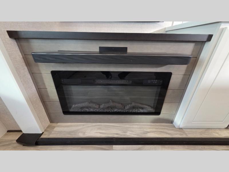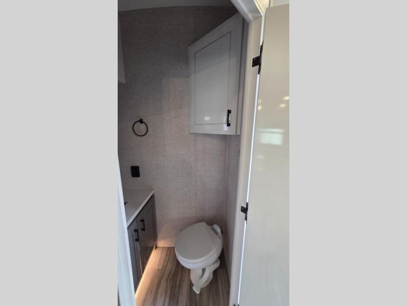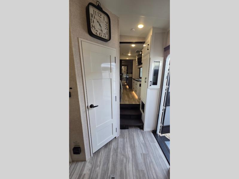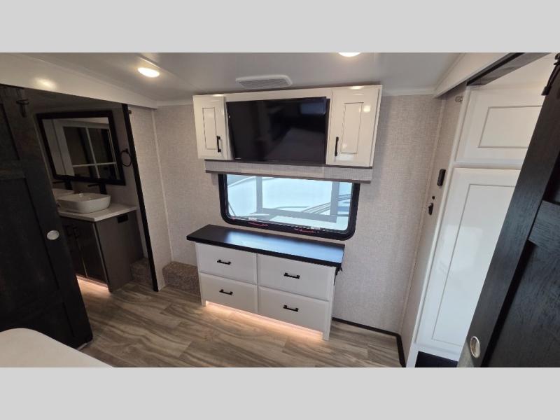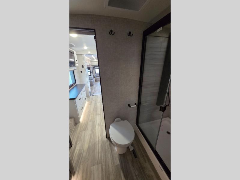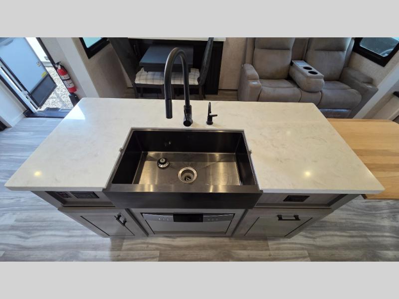 You can't go wrong with this fifth wheel that can sleep four! You will love how much space you have in the main living area thanks to the dual opposing slides, and there is a kitchen island here with a pull-out extension for added prep space. The convenient half bath is right off of the kitchen for quick restroom breaks, and you'll find a shoe garage and a wardrobe just as you enter the unit to keep the RV tidy. Head to the master bedroom for a rest on the king bed slide out, or you may want to watch a show on the 32" bedroom TV. The front master bath may be your favorite feature of this unit. Here, you'll find dual bath sinks, a walk-in shower with a seat, plus a spacious walk-in closet for your clothes. And don't overlook the exterior with its two power awnings, 32" exterior TV, and a Jayport with LP quick connect for your outdoor grill.