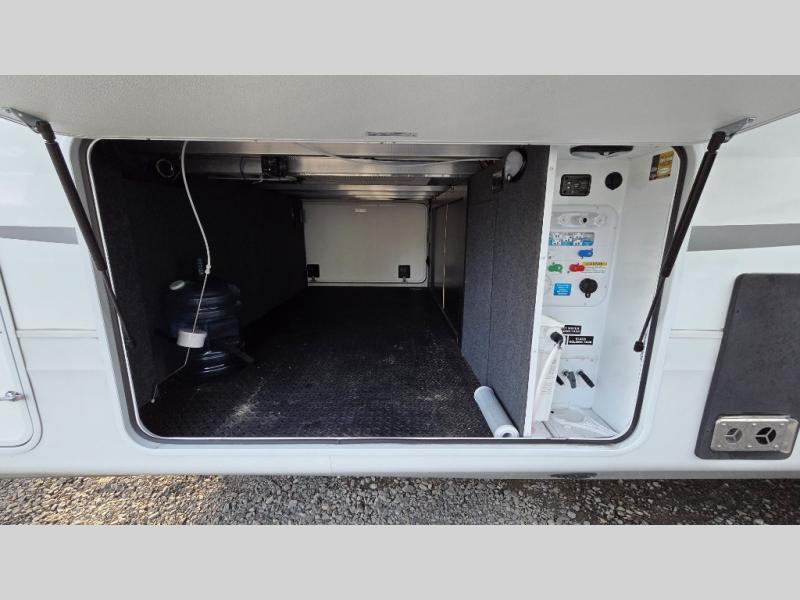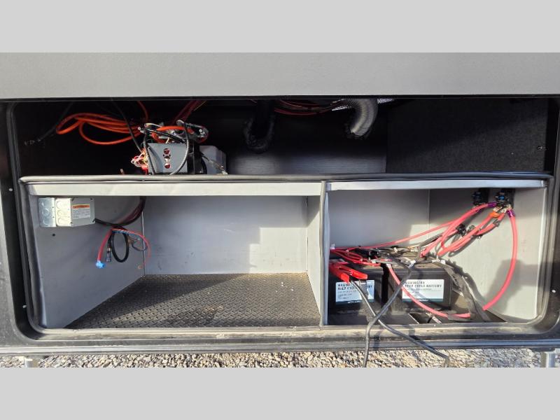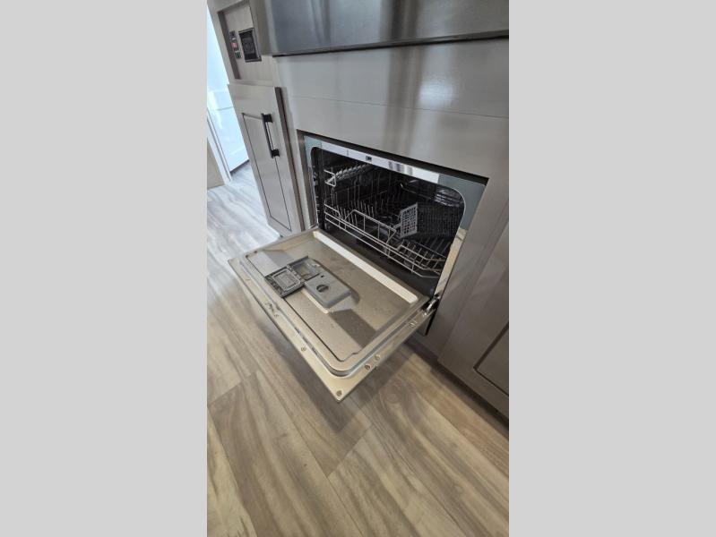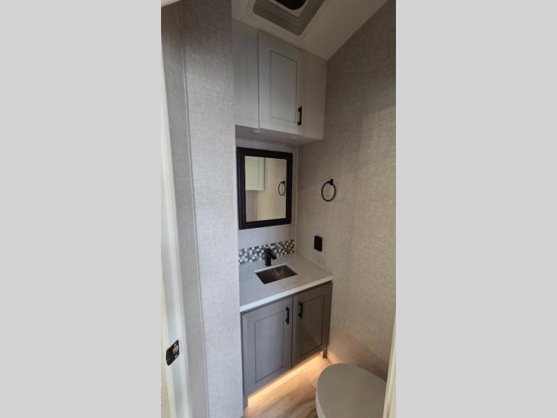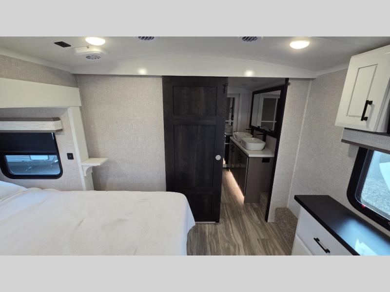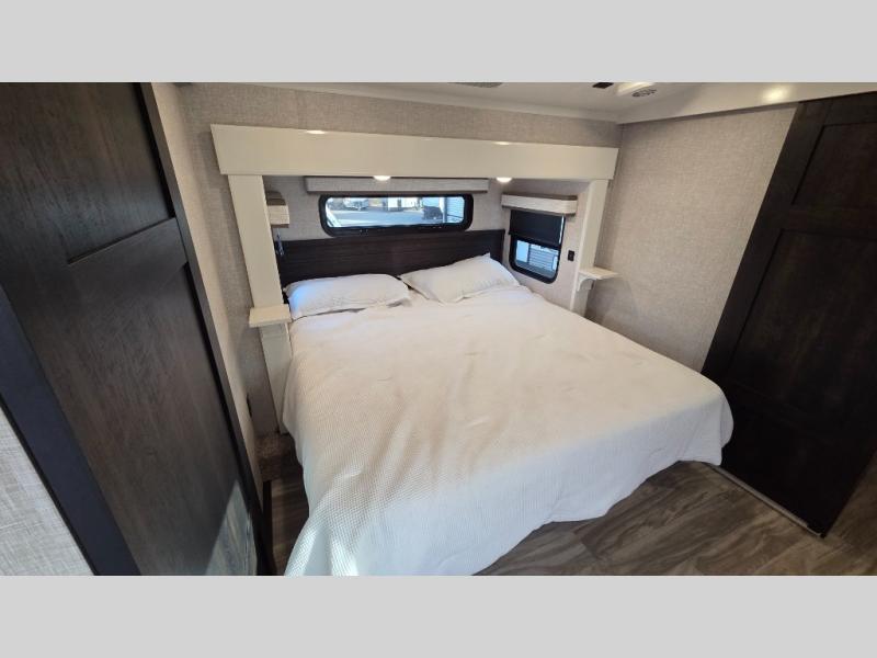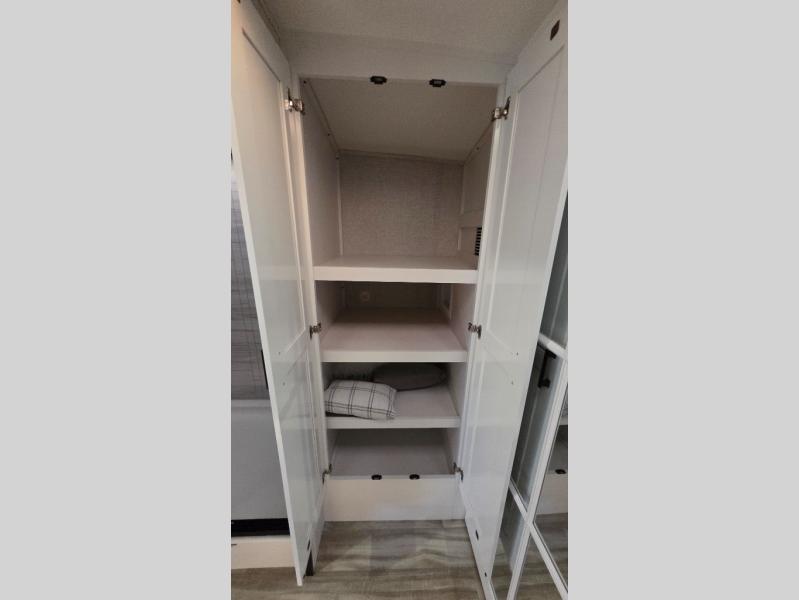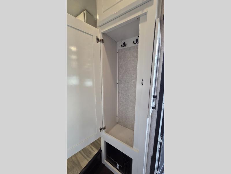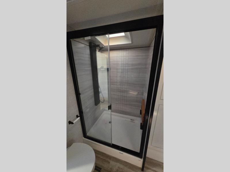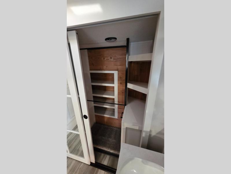 You can't go wrong with this fifth wheel that can sleep four! You will love how much space you have in the main living area thanks to the dual opposing slides, and there is a kitchen island here with a pull-out extension for added prep space. The convenient half bath is right off of the kitchen for quick restroom breaks, and you'll find a shoe garage and a wardrobe just as you enter the unit to keep the RV tidy. Head to the master bedroom for a rest on the king bed slide out, or you may want to watch a show on the 32" bedroom TV. The front master bath may be your favorite feature of this unit. Here, you'll find dual bath sinks, a walk-in shower with a seat, plus a spacious walk-in closet for your clothes. And don't overlook the exterior with its two power awnings, 32" exterior TV, and a Jayport with LP quick connect for your outdoor grill.