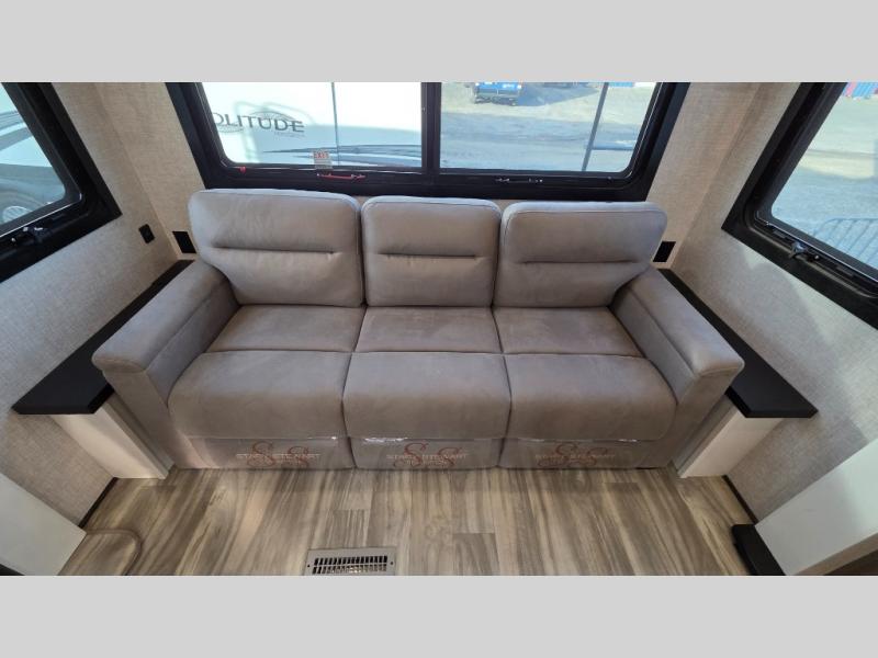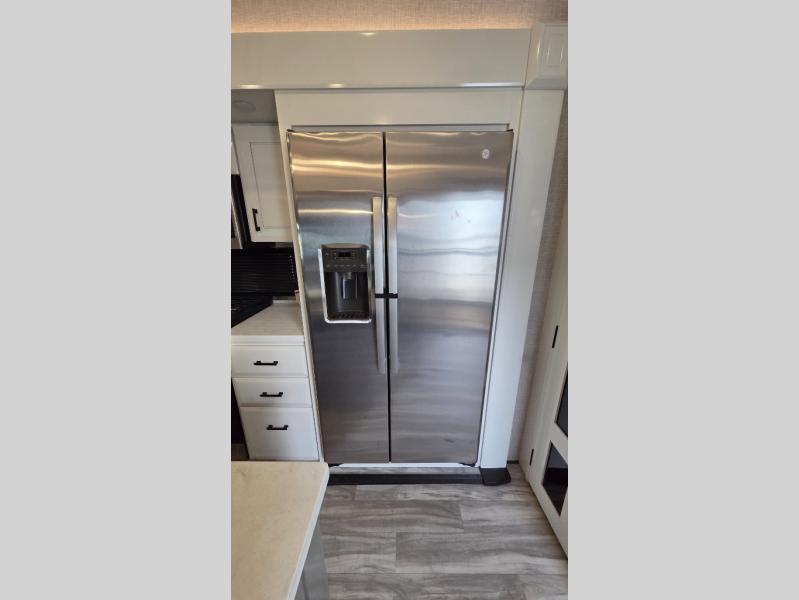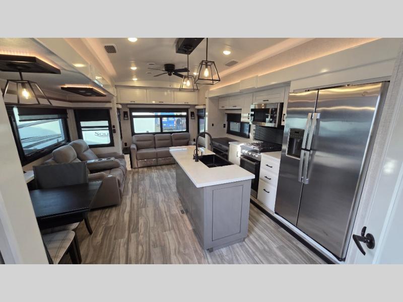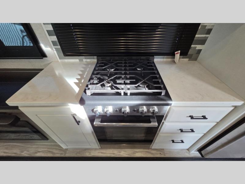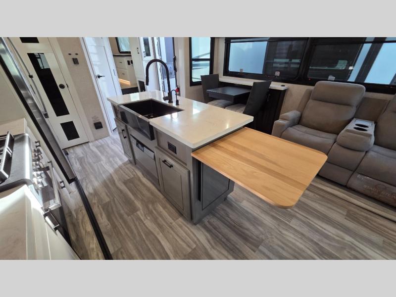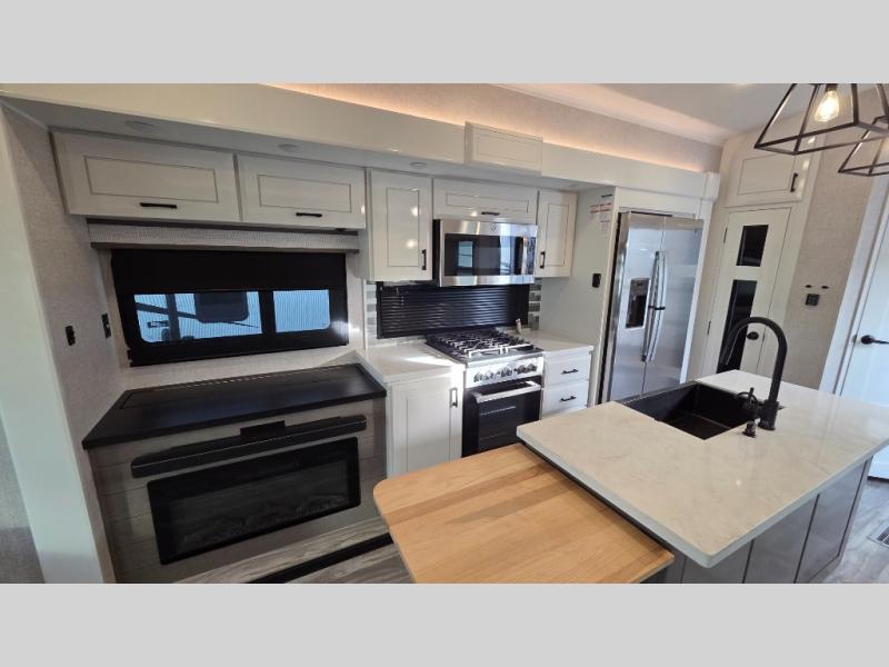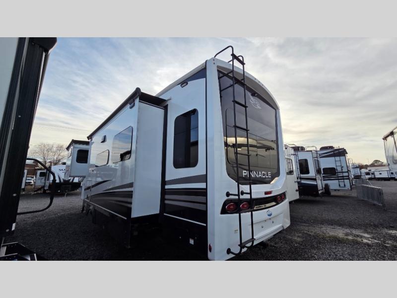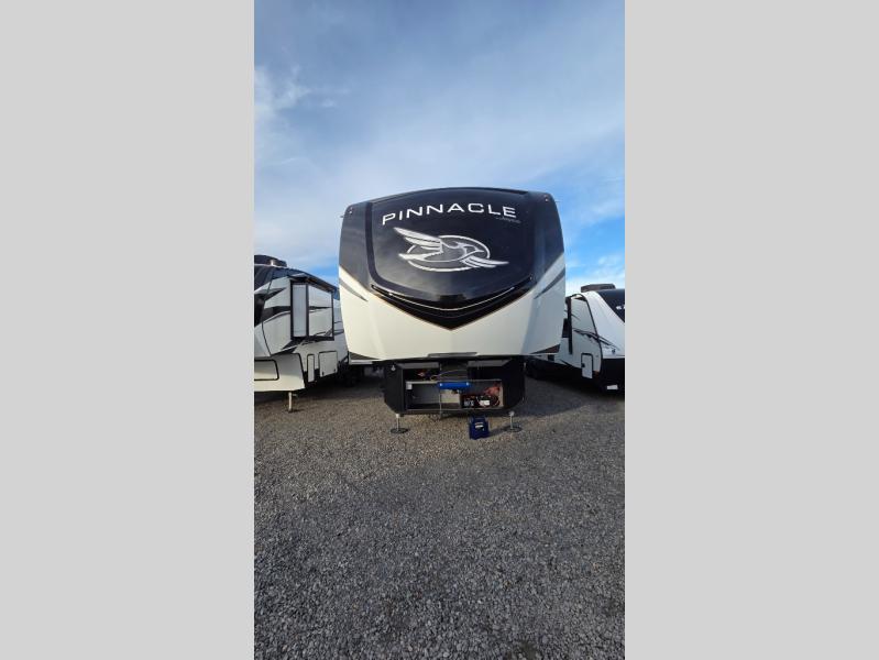 Each Pinnacle fifth wheel features Stronghold VBL lamination for the lightest, yet strongest construction in the RV industry. Add that to the Magnum Truss XL6 roof system and Climate Shield zero-degree tested weather protection and you'll be enjoying your fifth wheel for years to come. Some of the exterior conveniences you will appreciate are the Keyed-Alike lock system, the fully enclosed, universal docking center, and the 6-point hydraulic auto-leveling system for quick and easy set up. The 5 Star Handling Package will make towing a fifth wheel a walk in the park, and the two Whisper Quiet A/C units will keep you comfortable during the hot summer months. Inside, you'll enjoy the farmhouse stainless steel sink, the handcrafted hardwood glazed cabinetry, the vinyl flooring throughout, plus many more comforts. There is even a central vacuum system, a wireless remote control system, USB ports throughout, plus many more conveniences to make each trip enjoyable.