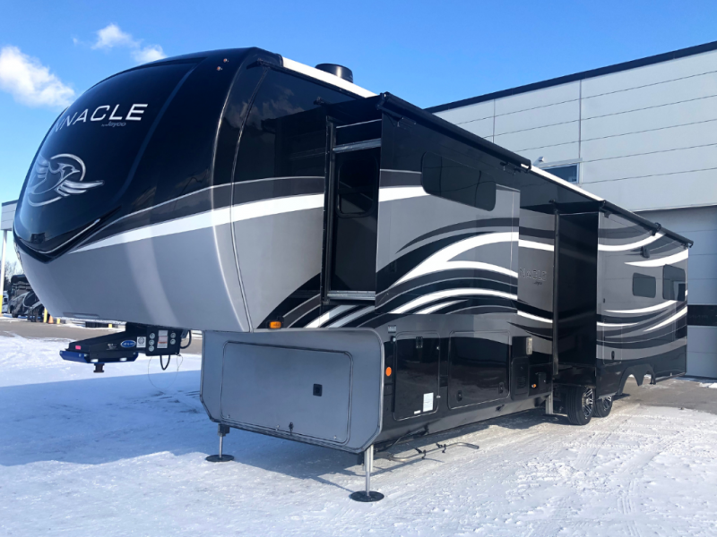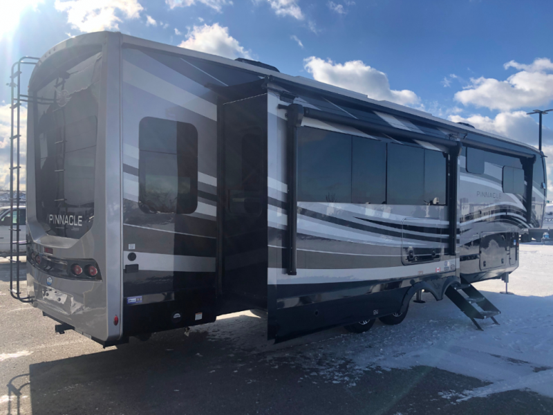 Each Pinnacle fifth wheel features Stronghold VBL lamination for the lightest, yet strongest construction in the RV industry. Add that to the Magnum Truss XL6 roof system and Climate Shield zero-degree tested weather protection and you'll be enjoying your fifth wheel for years to come. Some of the exterior conveniences you will appreciate are the Keyed-Alike lock system, the fully enclosed, universal docking center, and the 6-point hydraulic auto-leveling system for quick and easy set up. The 5 Star Handling Package will make towing a fifth wheel a walk in the park, and the two Whisper Quiet A/C units will keep you comfortable during the hot summer months. Inside, you'll enjoy the farmhouse stainless steel sink, the handcrafted hardwood glazed cabinetry, the vinyl flooring throughout, plus many more comforts. There is even a central vacuum system, a wireless remote control system, USB ports throughout, plus many more conveniences to make each trip enjoyable.