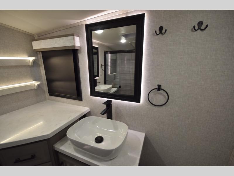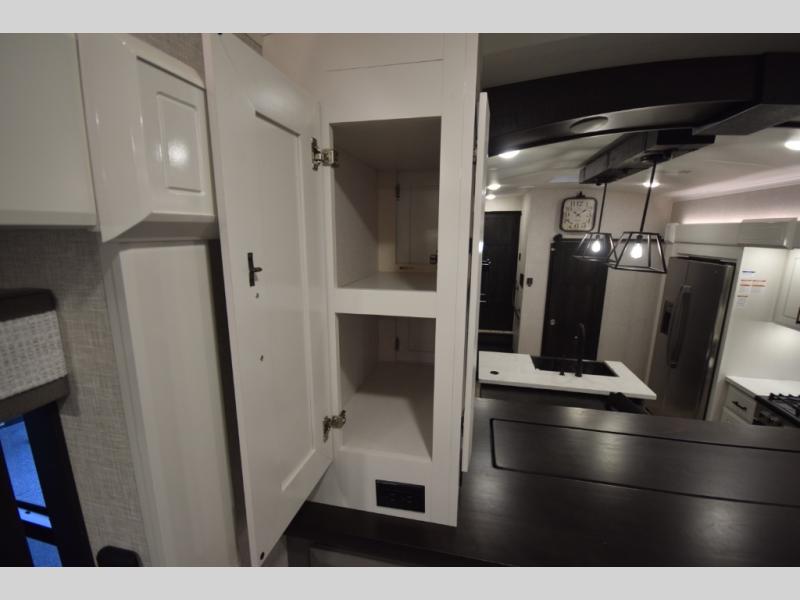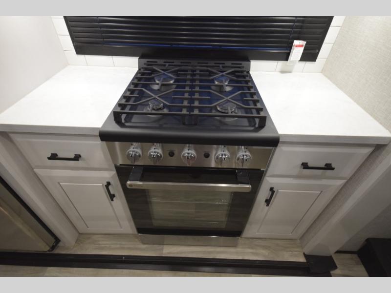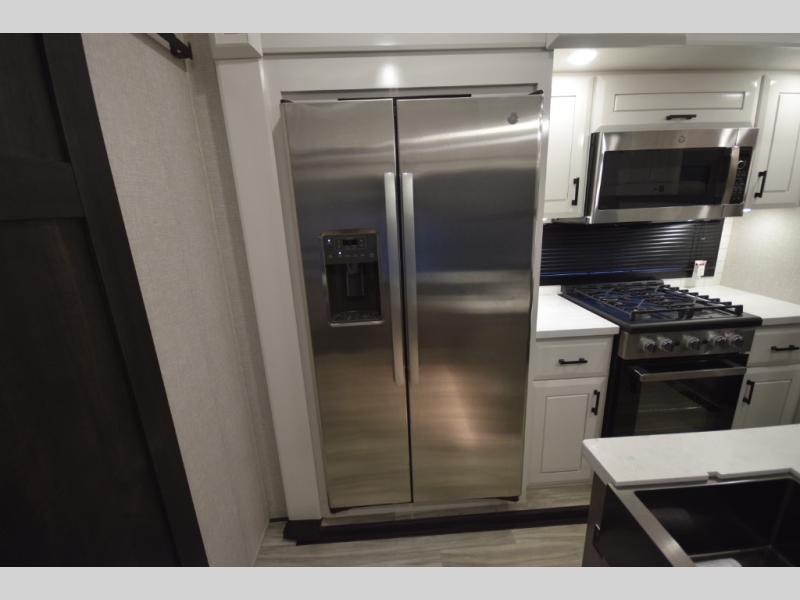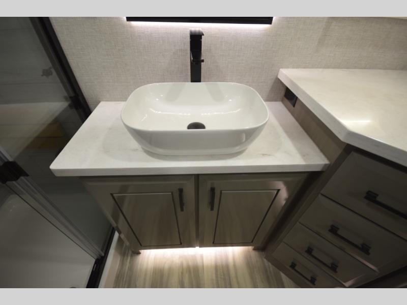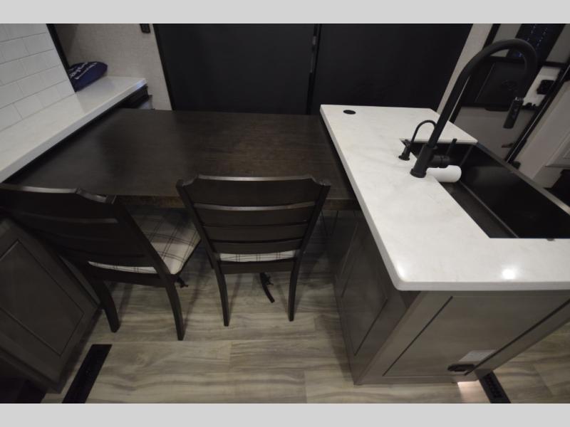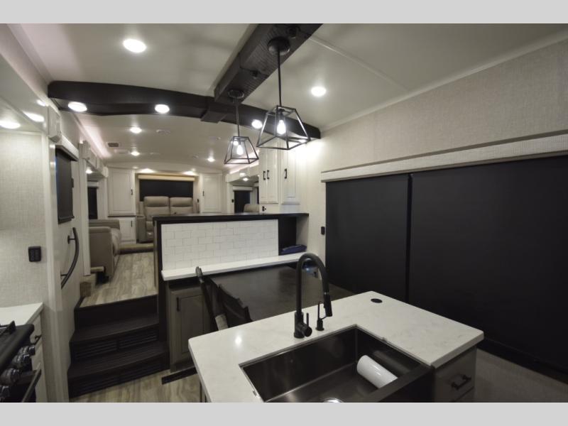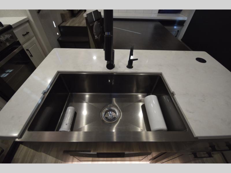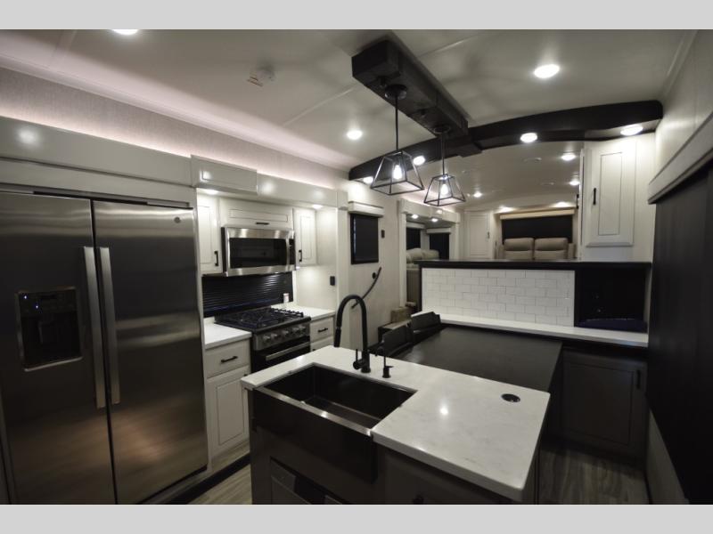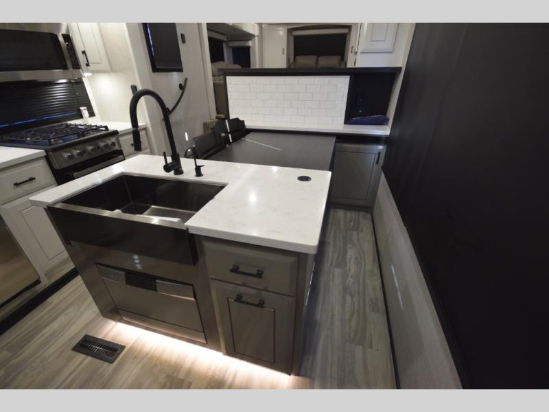 Inside, premium finishes elevate every trip, including handcrafted hardwood glazed cabinetry, farmhouse-style stainless steel sink, vinyl flooring throughout, and a central vacuum system. Add in wireless remote controls, USB ports throughout, and thoughtful residential-style touches, and you have a fifth wheel built for excitement, exploration, and effortless luxury—where every adventure feels like home.