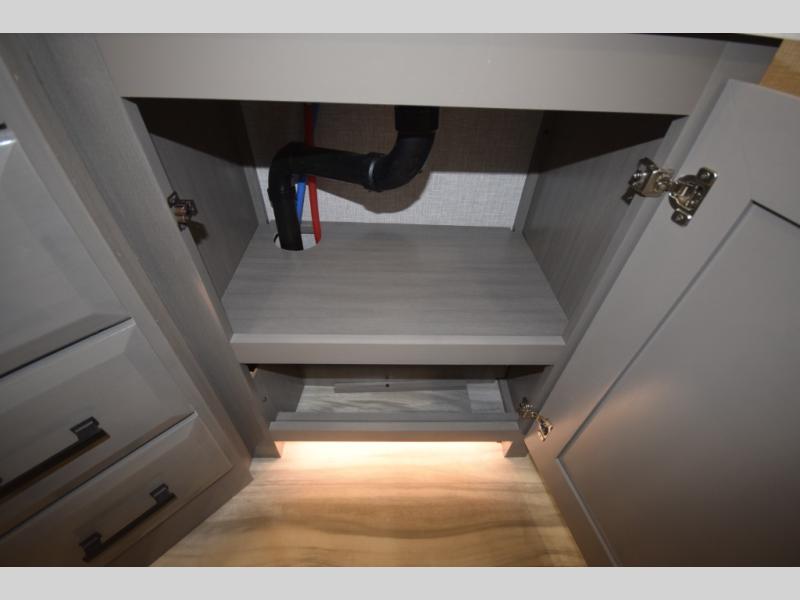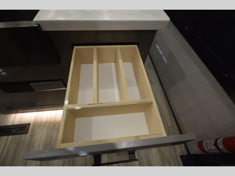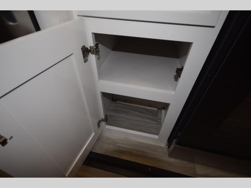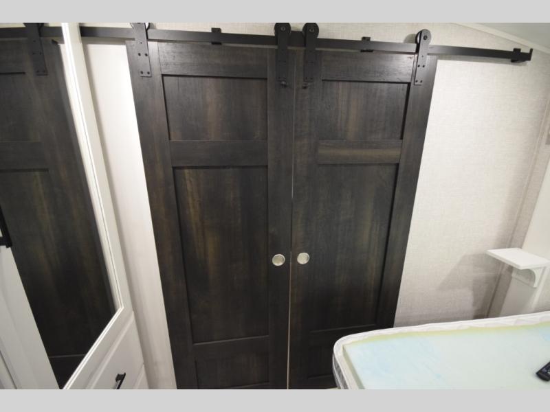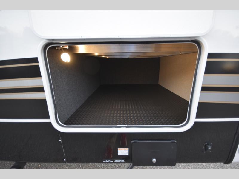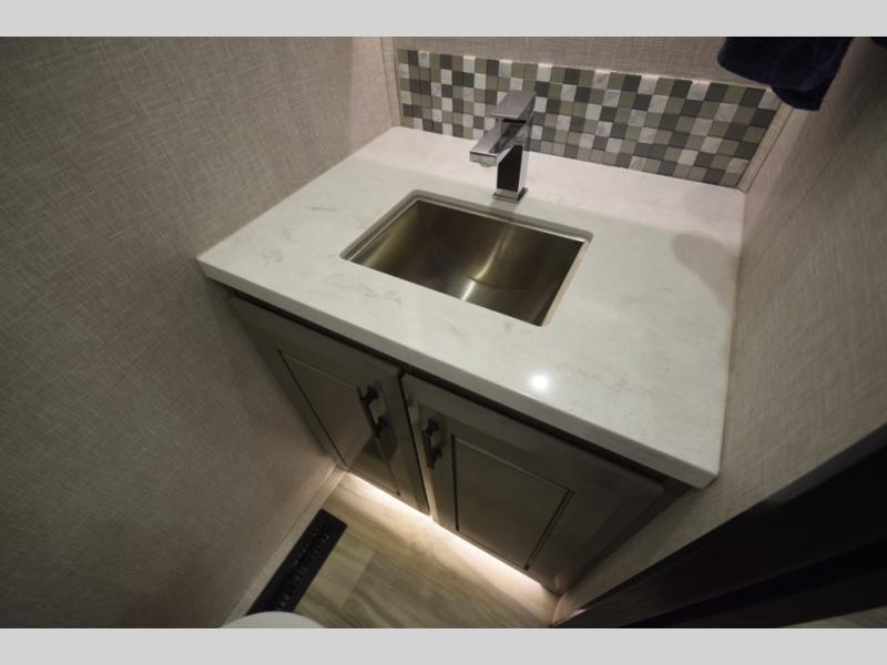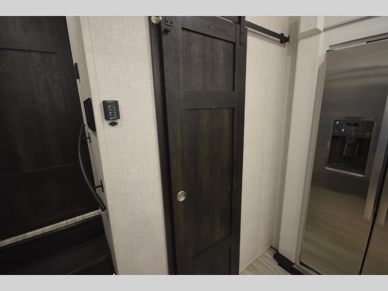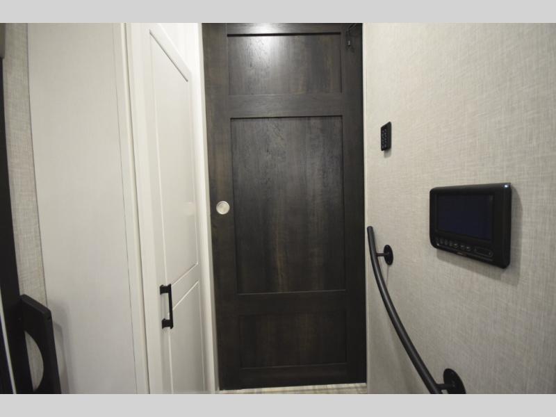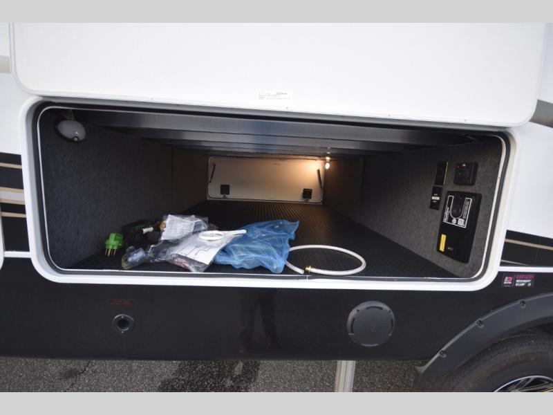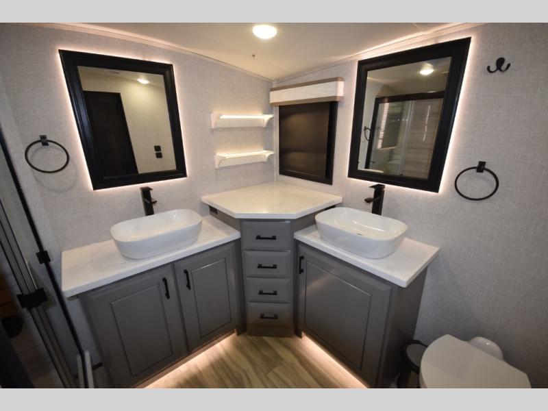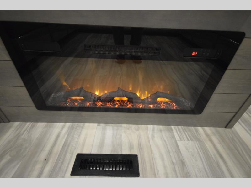 Inside, premium finishes elevate every trip, including handcrafted hardwood glazed cabinetry, farmhouse-style stainless steel sink, vinyl flooring throughout, and a central vacuum system. Add in wireless remote controls, USB ports throughout, and thoughtful residential-style touches, and you have a fifth wheel built for excitement, exploration, and effortless luxury—where every adventure feels like home.
