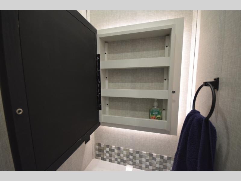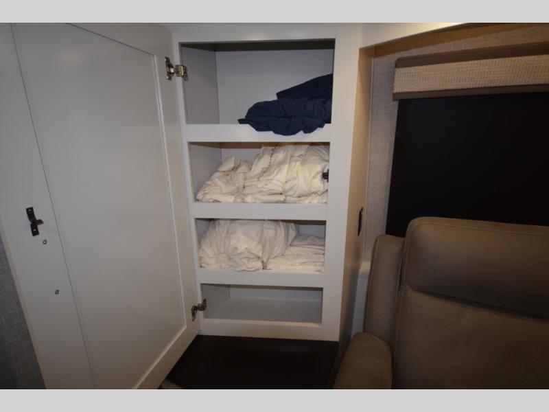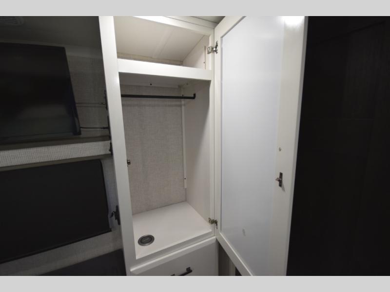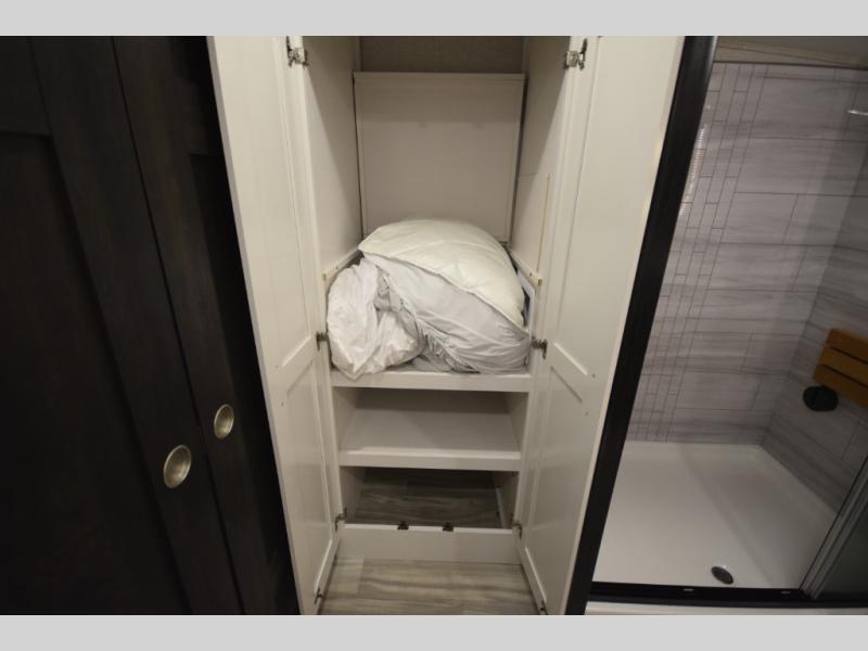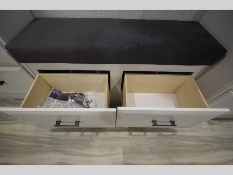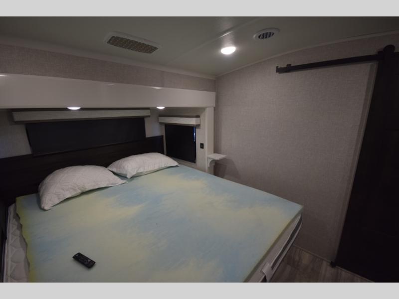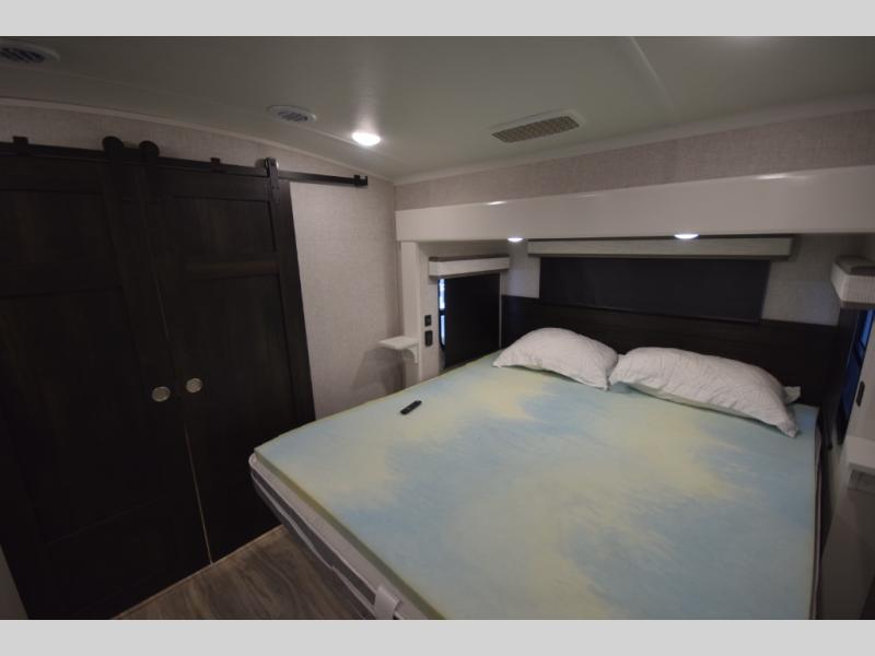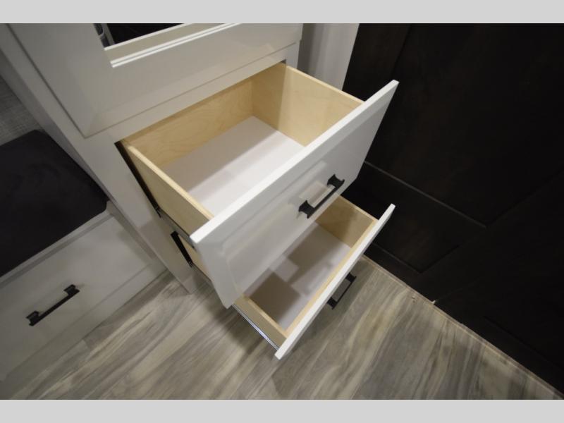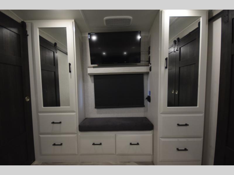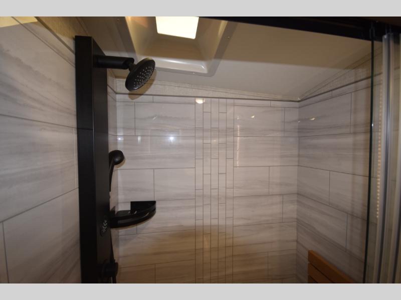 Retreat to the master bedroom where luxury continues. A king bed slide-out, ample wardrobe storage, and a built-in bench create a relaxing private escape. The expansive rear bathroom adds a spa-like feel with a massive vanity, dual sinks, and a walk-in shower with a built-in seat—perfect for unwinding after a day of adventure.