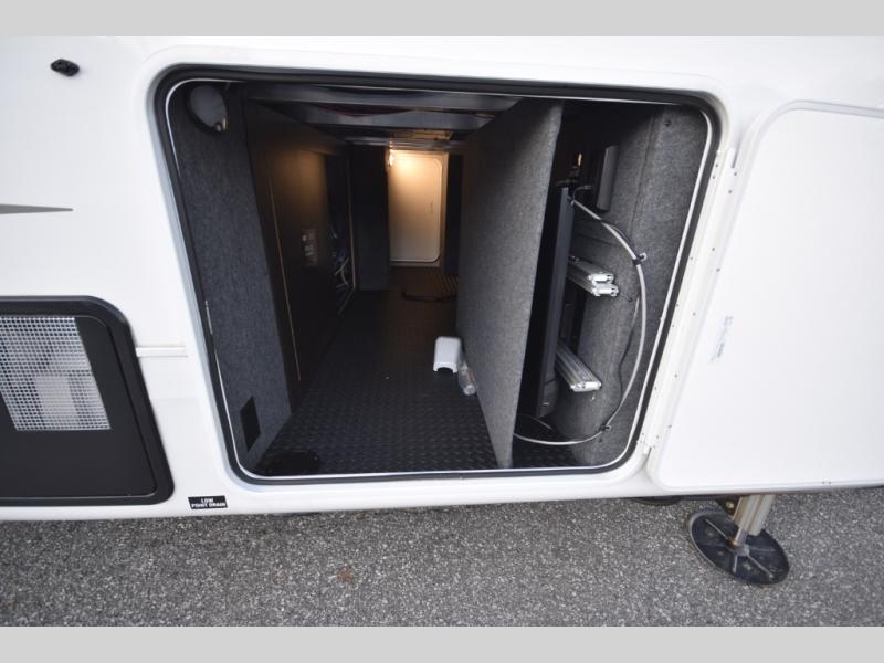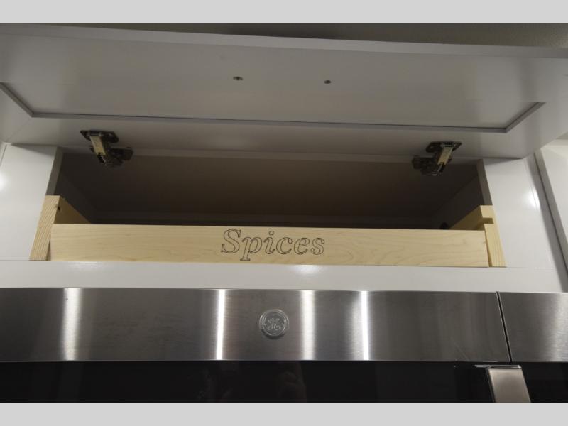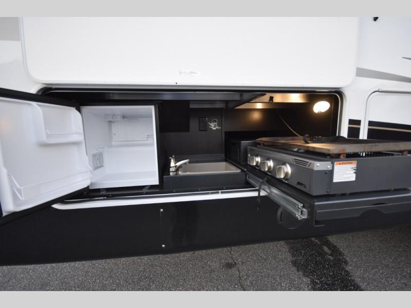 The centrally located kitchen is a dream for cooks and entertainers alike. Enjoy a sliding tabletop for flexible dining, generous under-table storage, a residential refrigerator, and a 32" TV so you never miss a moment while preparing meals. Take the experience outdoors with the fully equipped exterior kitchen, ideal for open-air cooking and tailgating, all protected by dual power awnings for shade and comfort.