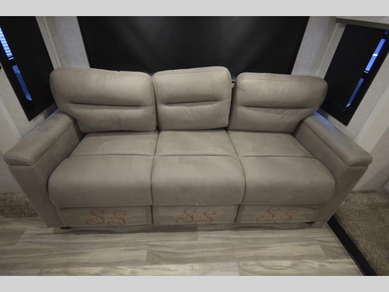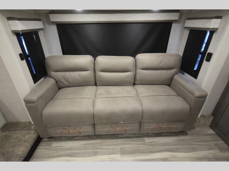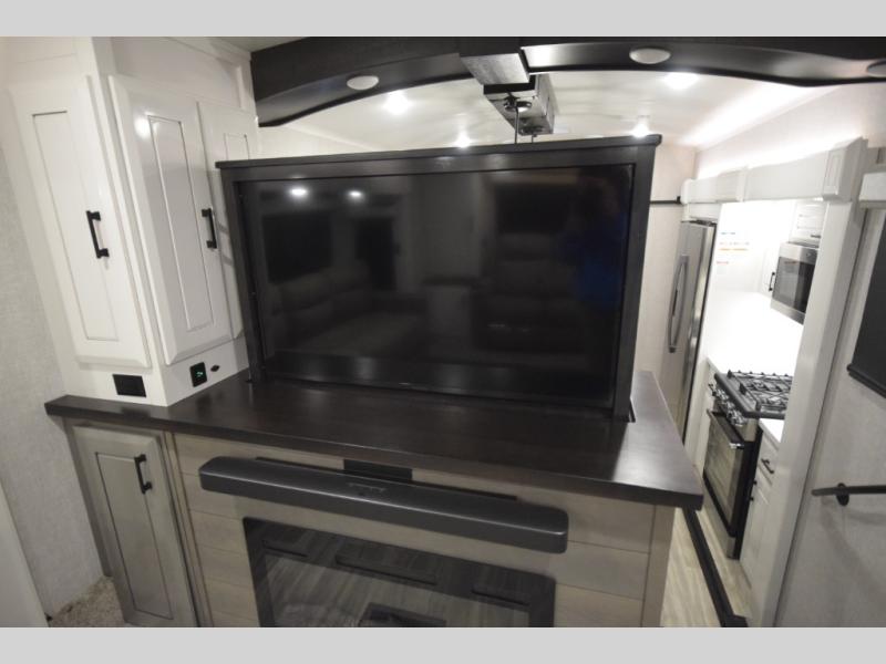 Step into the world of elevated RV travel with the Jayco Pinnacle 38FLGS, a quad-slide fifth wheel designed for unforgettable journeys and first-class comfort. The front living area sets the tone for relaxation and entertainment, featuring two oversized tri-fold sofas, cozy theater seating, and an impressive 50" TV that rises at the touch of a button, perfectly paired with a warm, inviting fireplace.