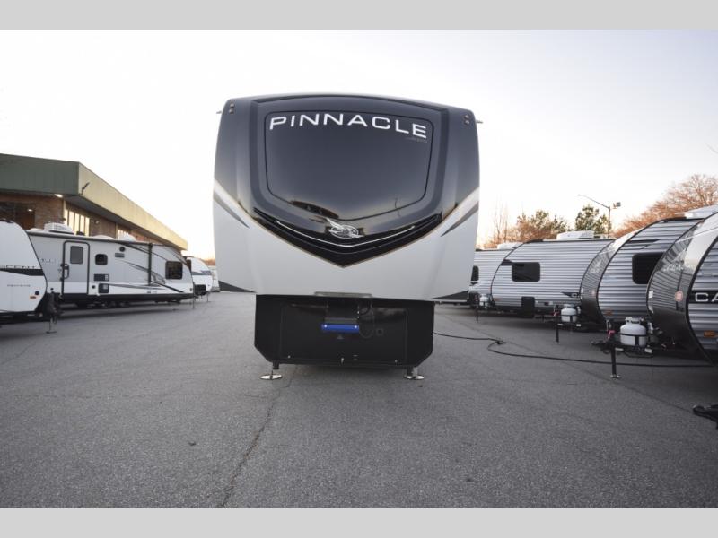 Built for durability and year-round travel, every Pinnacle fifth wheel features Stronghold VBL lamination, the Magnum Truss XL6 roof system, and Climate Shield zero-degree tested weather protection. Exterior conveniences such as a keyed-alike lock system, fully enclosed universal docking center, and 6-point hydraulic auto-leveling system make setup fast and stress-free. The 5 Star Handling Package ensures smooth towing, while dual Whisper Quiet A/C units keep the interior cool and comfortable.