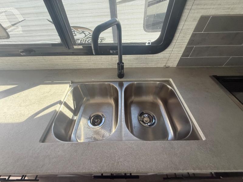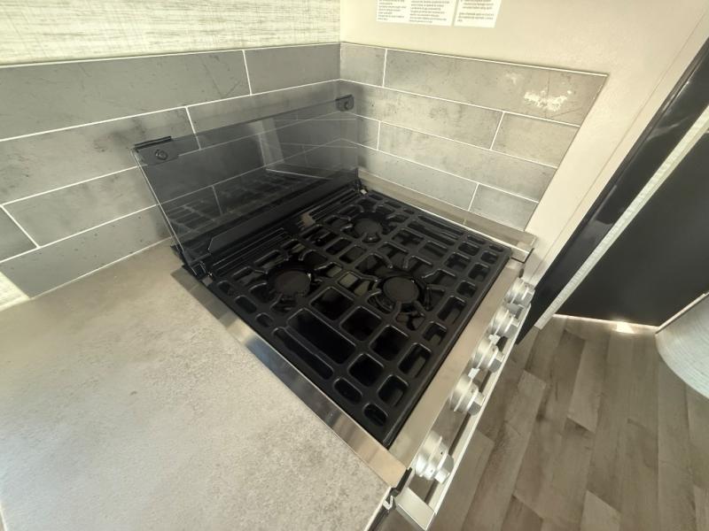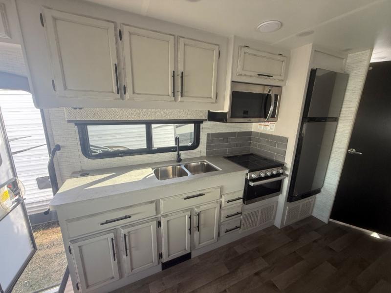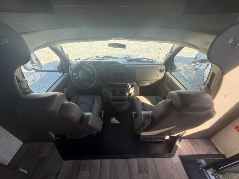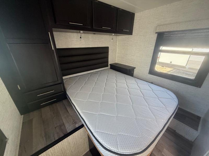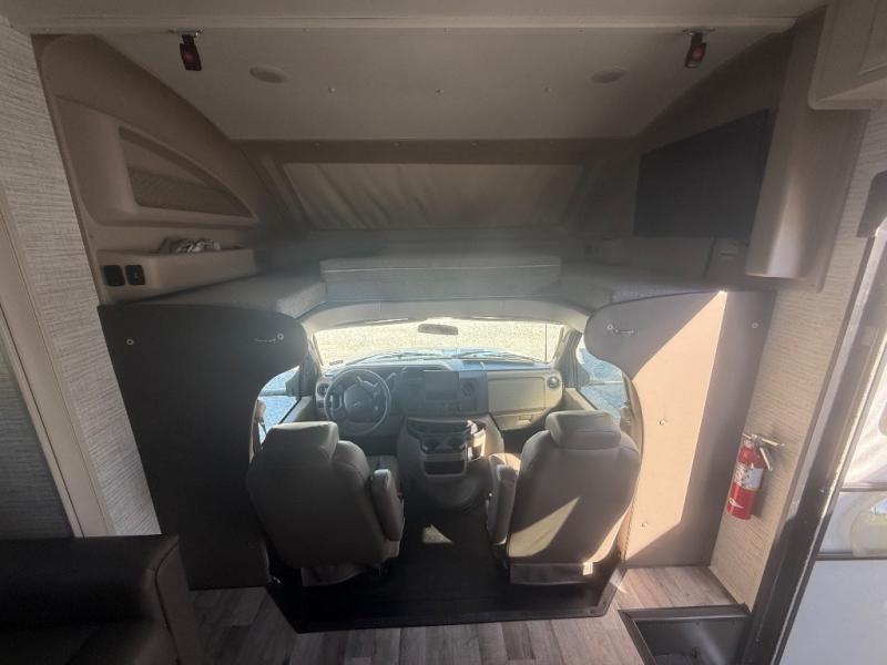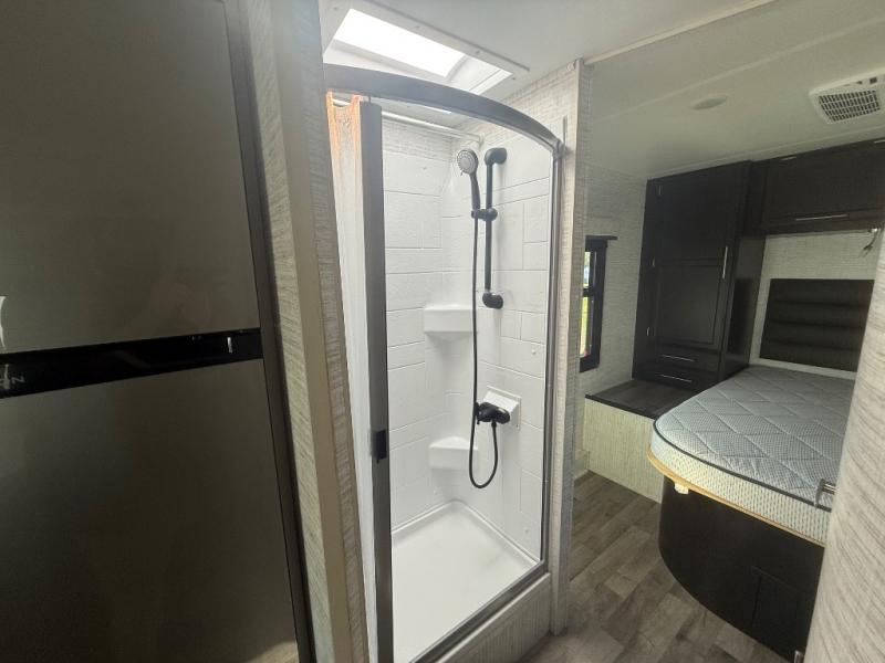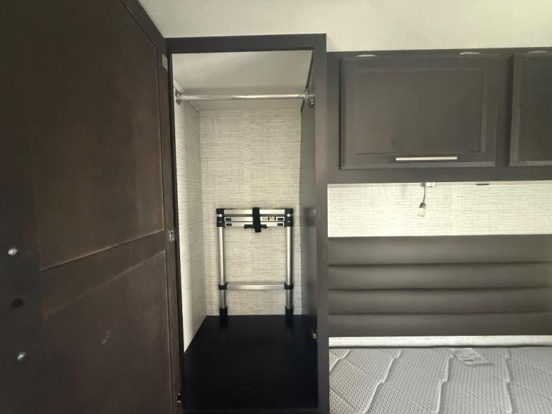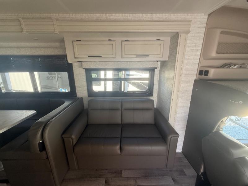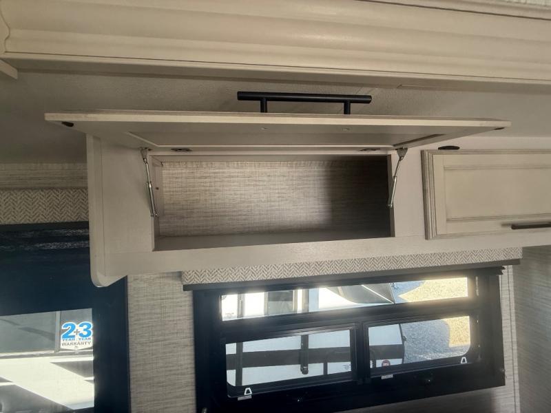 Explore new places as you travel in this coach with the comforts of home and the conveniences you are accustom to. In the rear bedroom, you will appreciate privacy when you close the divider to enjoy the walk-around queen bed with storage for your clothes. There is a private toilet and sink with the shower right across the hall so two people can freshen up at once. The chef will love the galley kitchen which is spacious thanks to the furniture slide out. The Furrion all-in-one cooktop along with the residential-size microwave, plus the 10 cu. ft. refrigerator will give the cook everything for warm meals for two or more. The driver and passenger seats swivel to become a part of the living area seating, and the cab-over bunk her will be a big plus for the little ones. You can also choose the optional theater seating in place of the sofa if you're not needing the additional sleeping space.