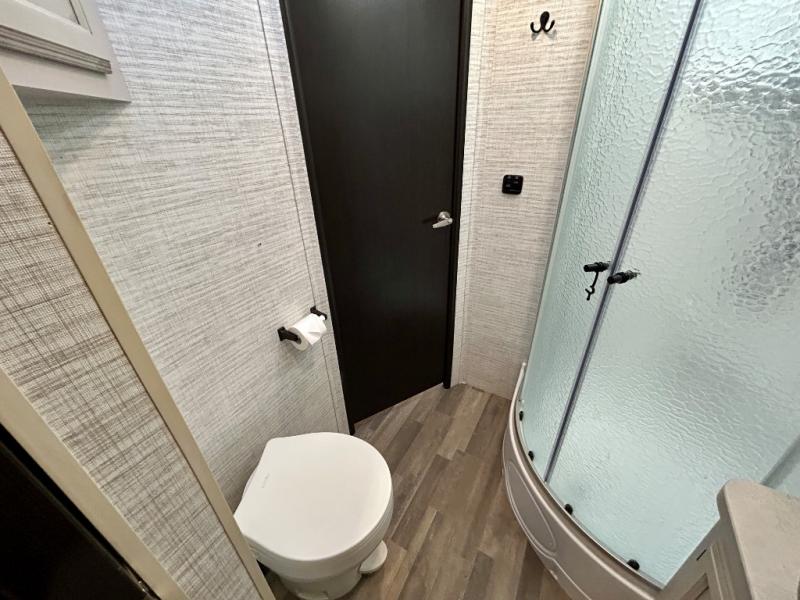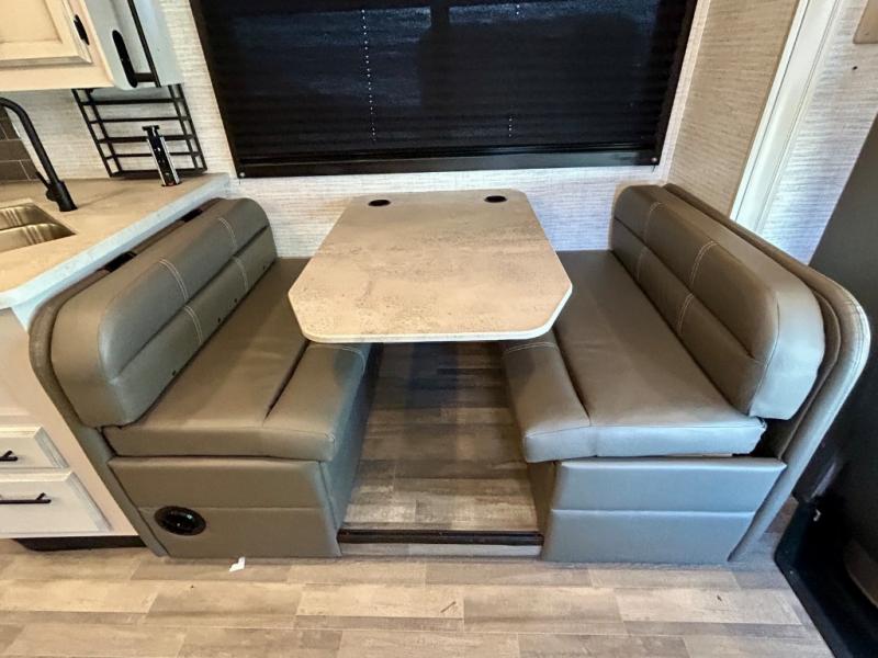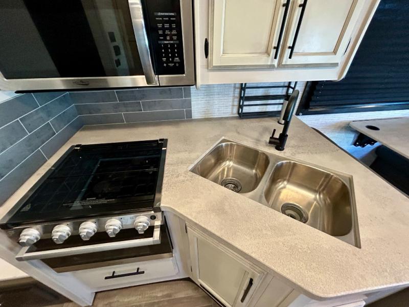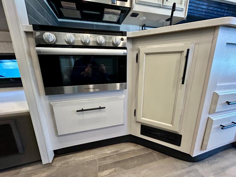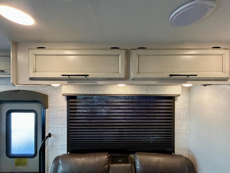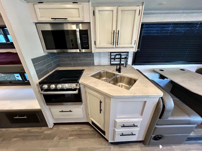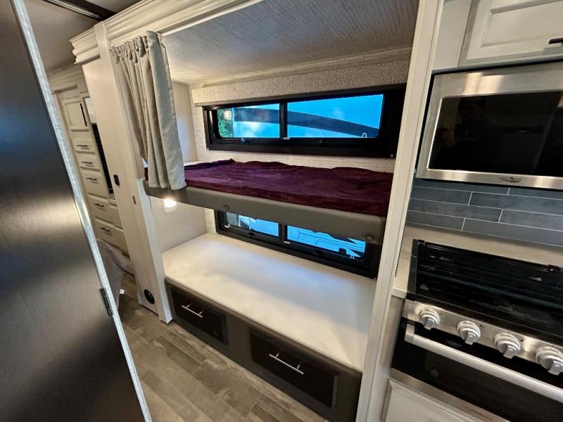 Searching for an RV to travel with family and friends? This coach offers up to seven sleeping spaces when you utilize the queen bed, the bunk beds, the cab over bunk and the furniture. The private master bedroom is in the rear and has access to the double entry bathroom, and the bunk beds are just across from the main entrance which is convenient. The kitchen provides a Furrion all-in-one cooktop and oven, a residential-size microwave and an 10 cu. ft. refrigerator, plus a pantry. You can dine at the Jayco exclusive, easy-operation legless dinette table or while sitting on the sofa. You might like to add the theater seating option in place of the sofa if you prefer that setup. And the cab seats swivel for more seating.