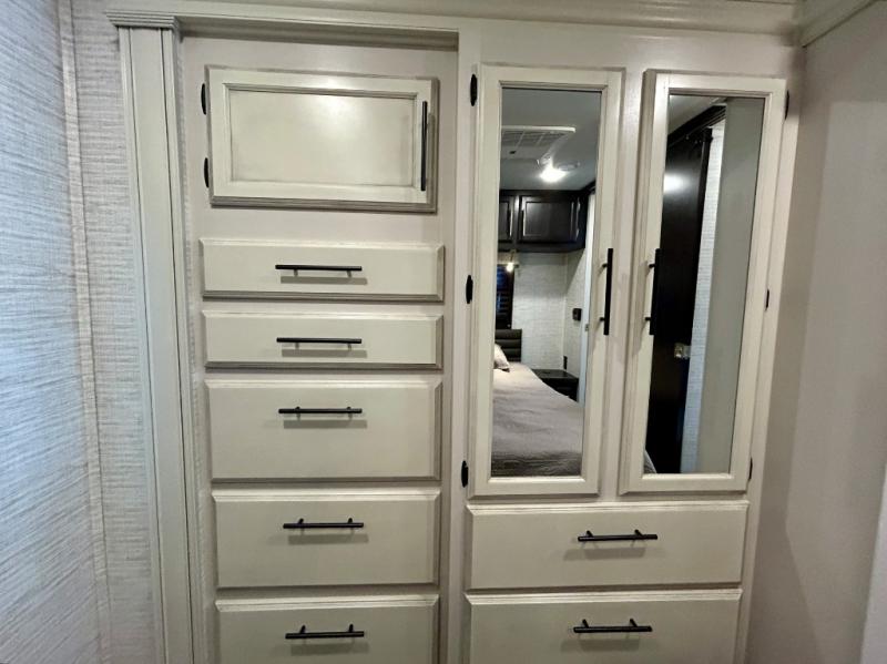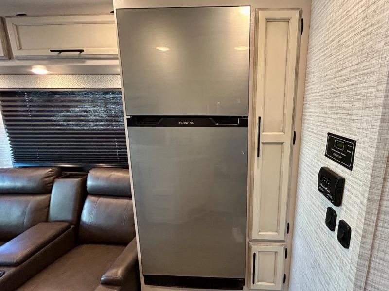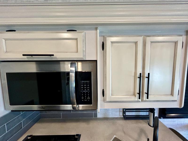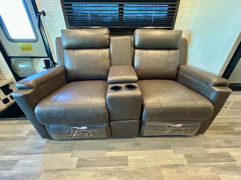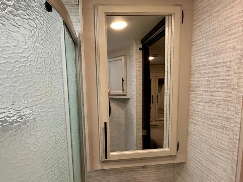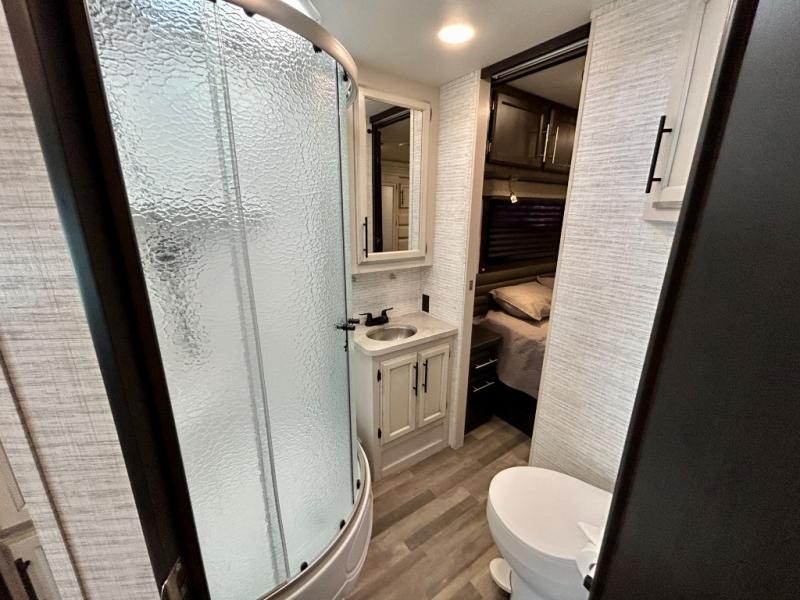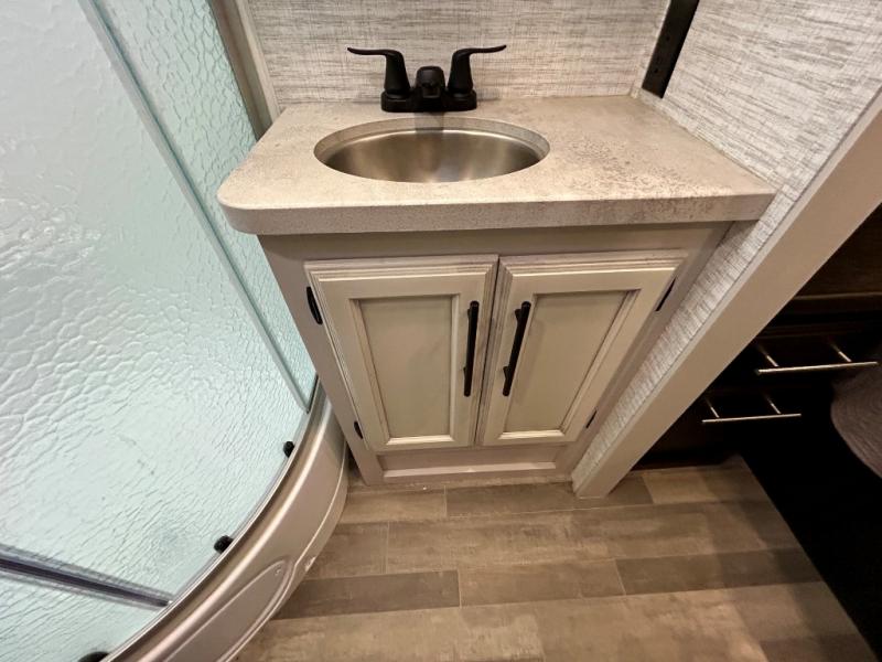 Searching for an RV to travel with family and friends? This coach offers up to seven sleeping spaces when you utilize the queen bed, the bunk beds, the cab over bunk and the furniture. The private master bedroom is in the rear and has access to the double entry bathroom, and the bunk beds are just across from the main entrance which is convenient. The kitchen provides a Furrion all-in-one cooktop and oven, a residential-size microwave and an 10 cu. ft. refrigerator, plus a pantry. You can dine at the Jayco exclusive, easy-operation legless dinette table or while sitting on the sofa. You might like to add the theater seating option in place of the sofa if you prefer that setup. And the cab seats swivel for more seating.