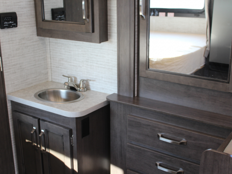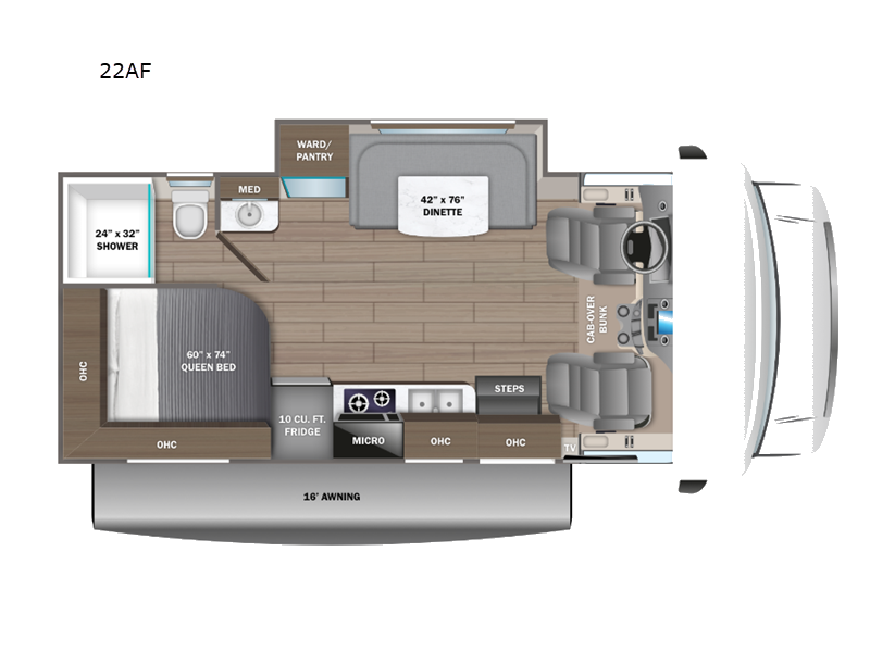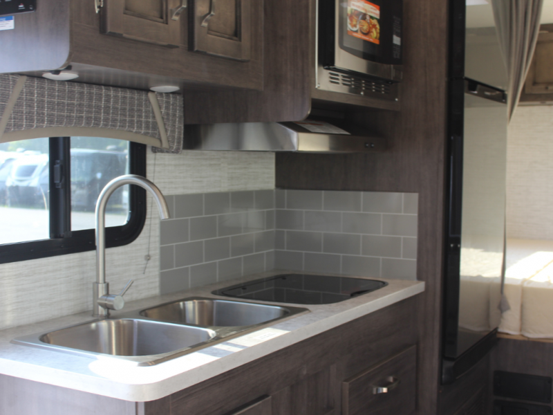 Your small crew will love traveling in this motorhome! Everyone will enjoy a good night's rest between the queen bed, the bunk over cab, and even the 42" x 76" U-shaped dinette once converted. The rear corner bathroom has a 24" x 32" shower and toilet together with a vanity sink just outside. You can prepare your best meals with the two burner cooktop, store any leftovers in the 10 cu. ft. 12V refrigerator, and clean up in a breeze with the stainless steel sink, plus there is a convection microwave oven for those nights when you don't feel like cooking!