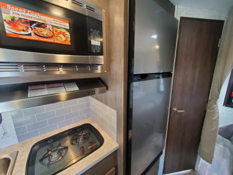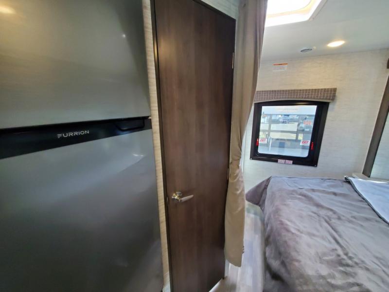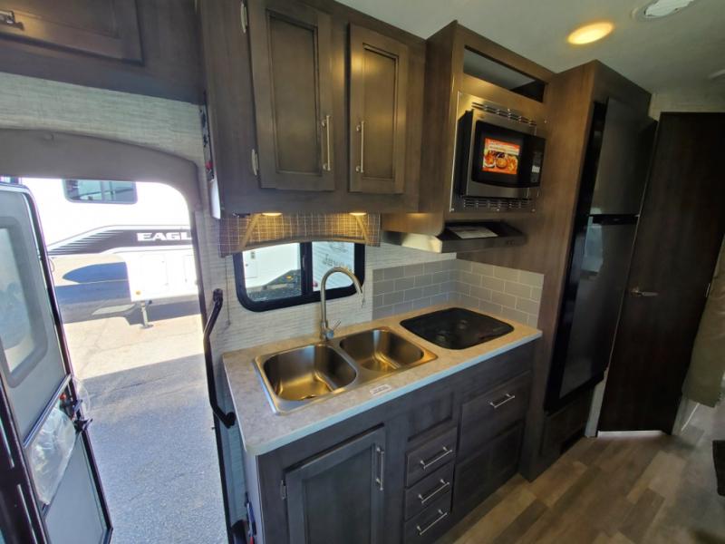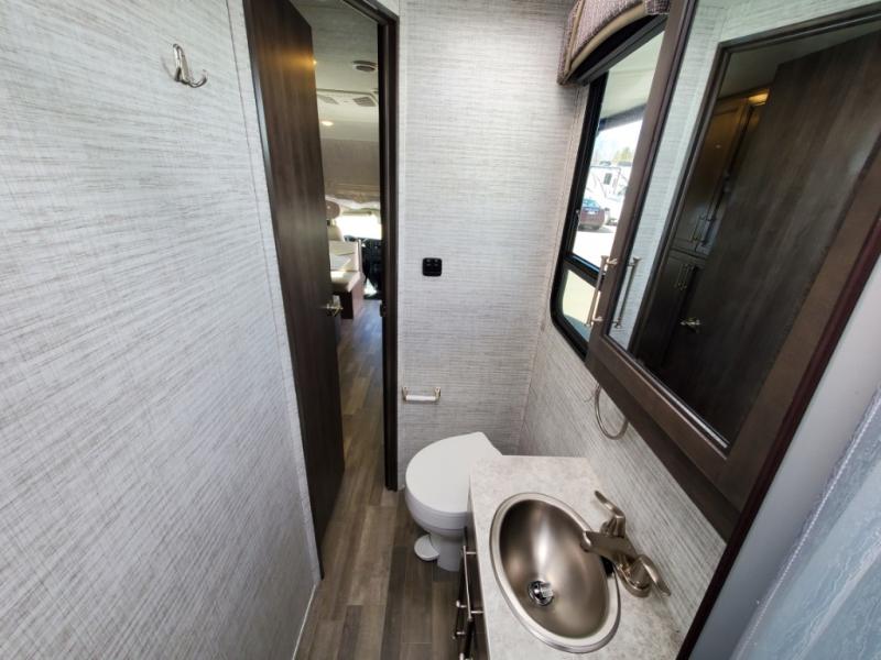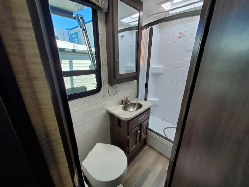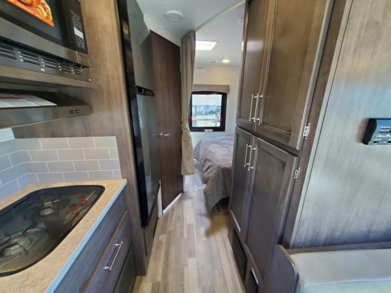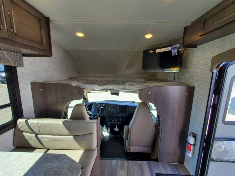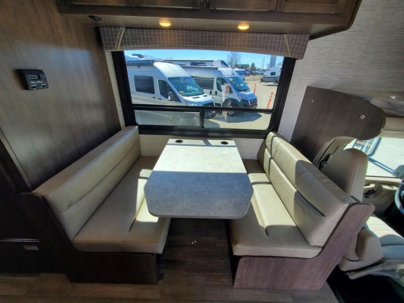 There's a comfortable place to sleep for everyone in this motorhome! From the corner 60" x 70" queen bed that slides out to the bunk over cab, and even the 42" x 70" booth dinette once converted. You can store your favorite snacks and hang up your clothes in the wardrobe/pantry. The chef can prepare delicious meals with the two burner cooktop and if there happens to be any leftovers then they can be stored in the 10 cu. ft. 12V refrigerator. The rear corner bathroom has a 24" x 36" shower that you are sure to enjoy after a long day of traveling!