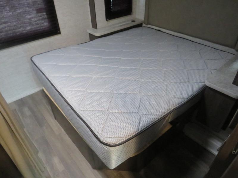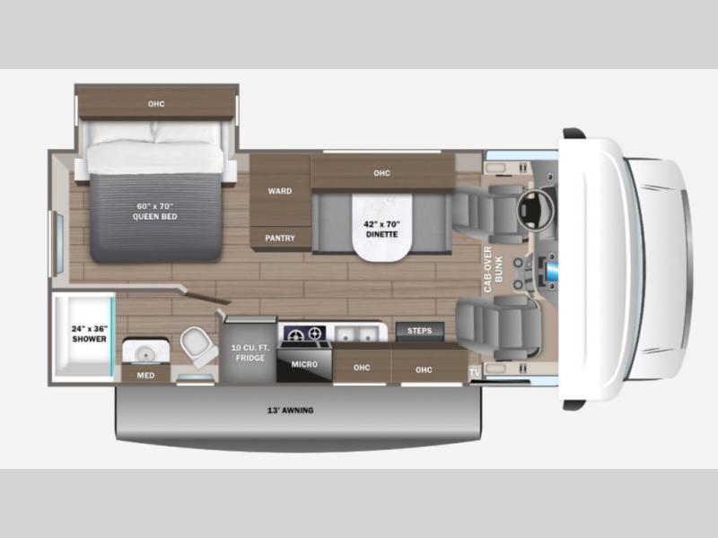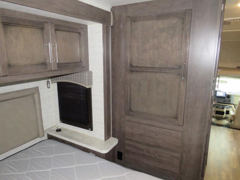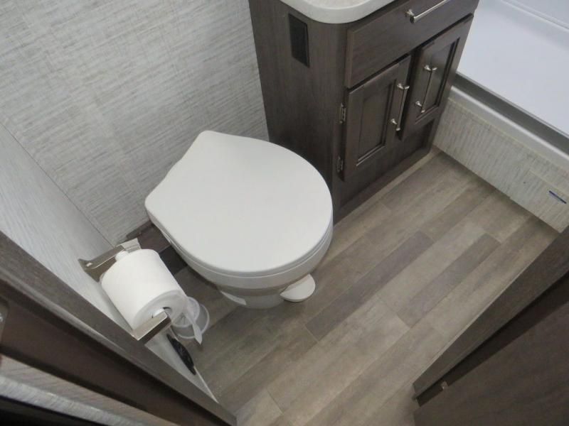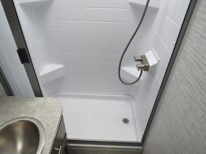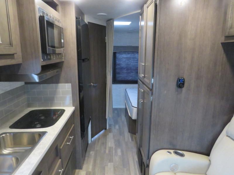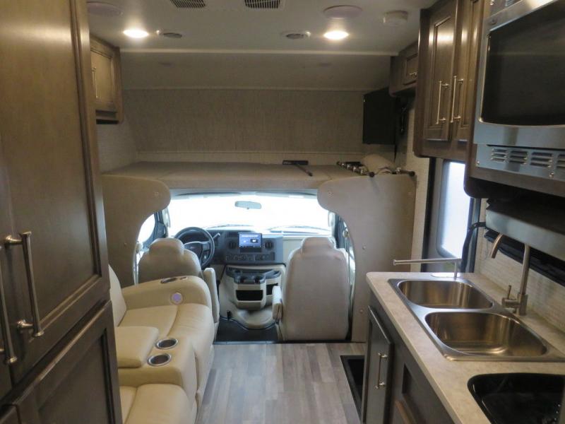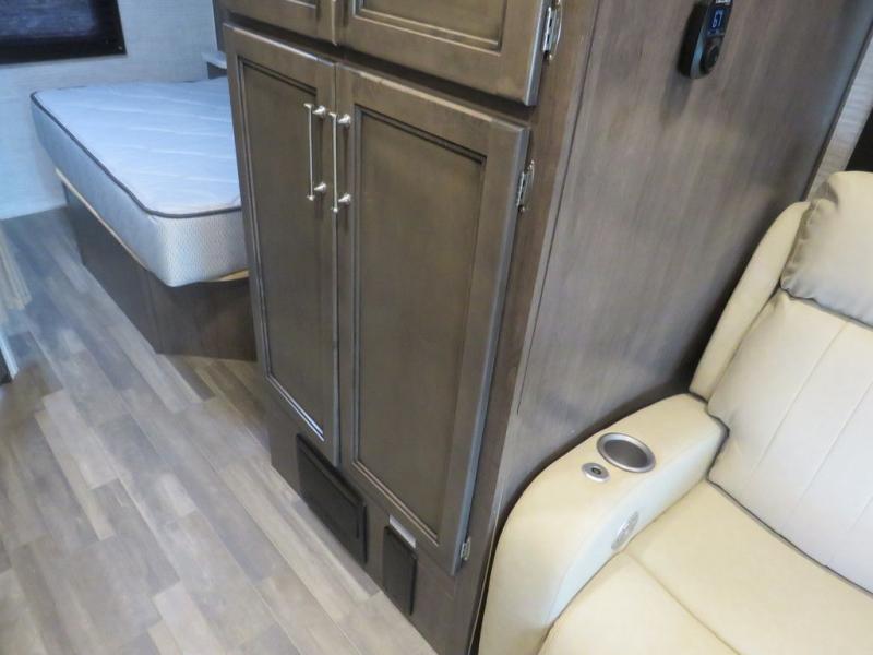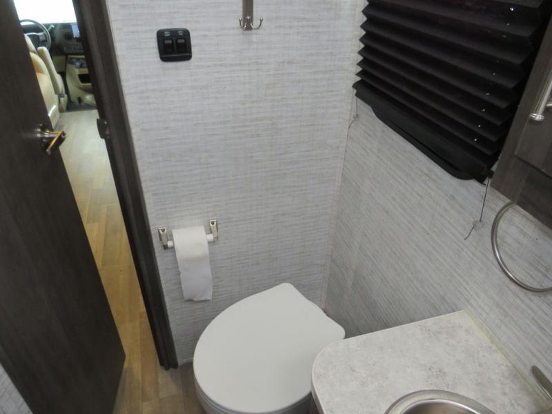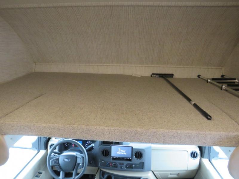 There's a comfortable place to sleep for everyone in this motorhome! From the corner 60" x 70" queen bed that slides out to the bunk over cab, and even the 42" x 70" booth dinette once converted. You can store your favorite snacks and hang up your clothes in the wardrobe/pantry. The chef can prepare delicious meals with the two burner cooktop and if there happens to be any leftovers then they can be stored in the 10 cu. ft. 12V refrigerator. The rear corner bathroom has a 24" x 36" shower that you are sure to enjoy after a long day of traveling!