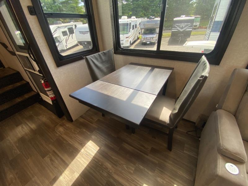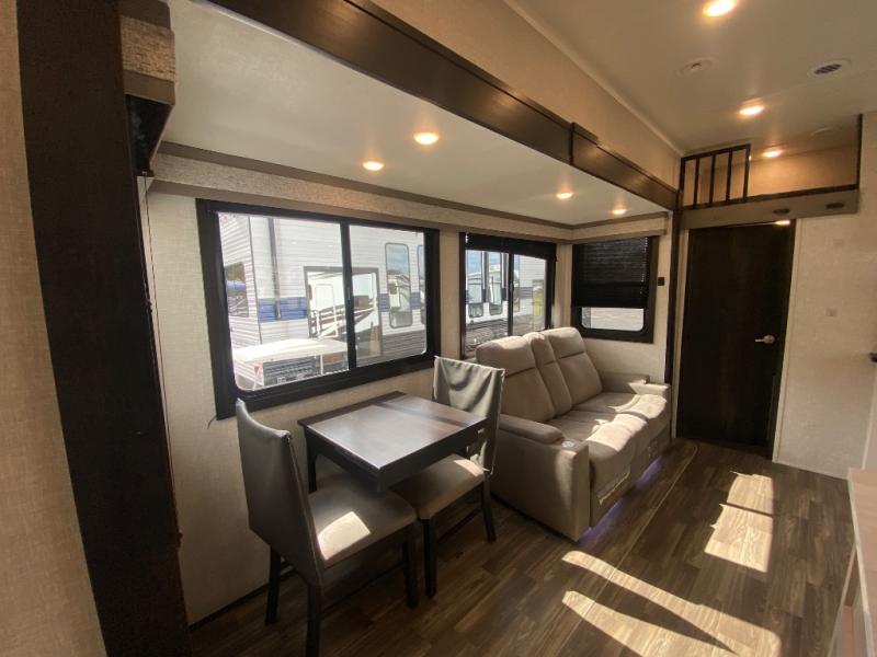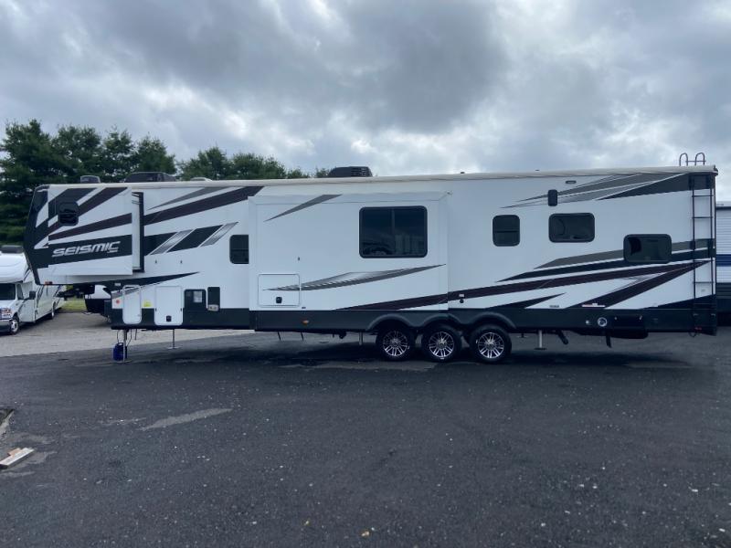 Take your outdoor adventures up a notch with this Seismic toy hauler. You can take the whole gang along for some fun with triple slides and dual entry for easy access going in and out. Your friends will sleep comfortably on the convertible sofas with overhead queen bed above in the 14' cargo garage space. There is also a storage space/loft above for their things and additional sleeping if needed. Inside, a full bath can be shared by all to get cleaned up each day, and all can gather inside in the spacious living area featuring dual opposing slides. Theater seating and an L-shaped tri-fold sofa creates plenty of space for lounging and there is also a dining table for four inside and the second table in the garage area also allows for more seating during meals inside when the weather isn't that nice. A side awning provides protection from the elements just outside the main door, plus the rear ramp party deck with steps and awning creates even more outdoor living space to enjoy!