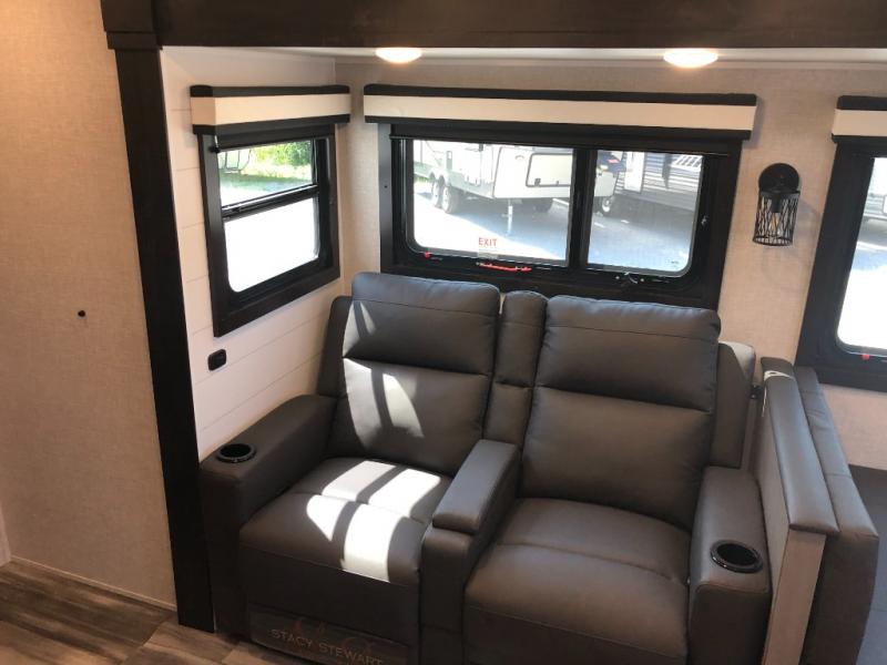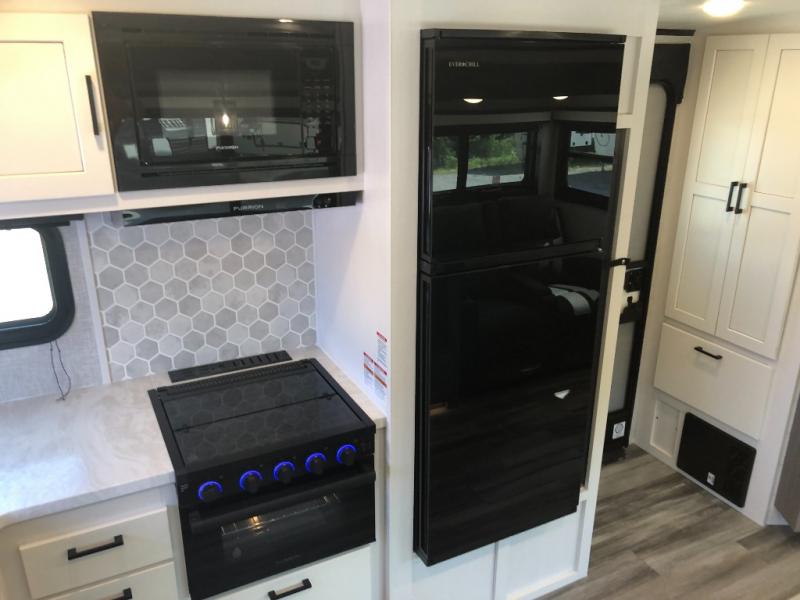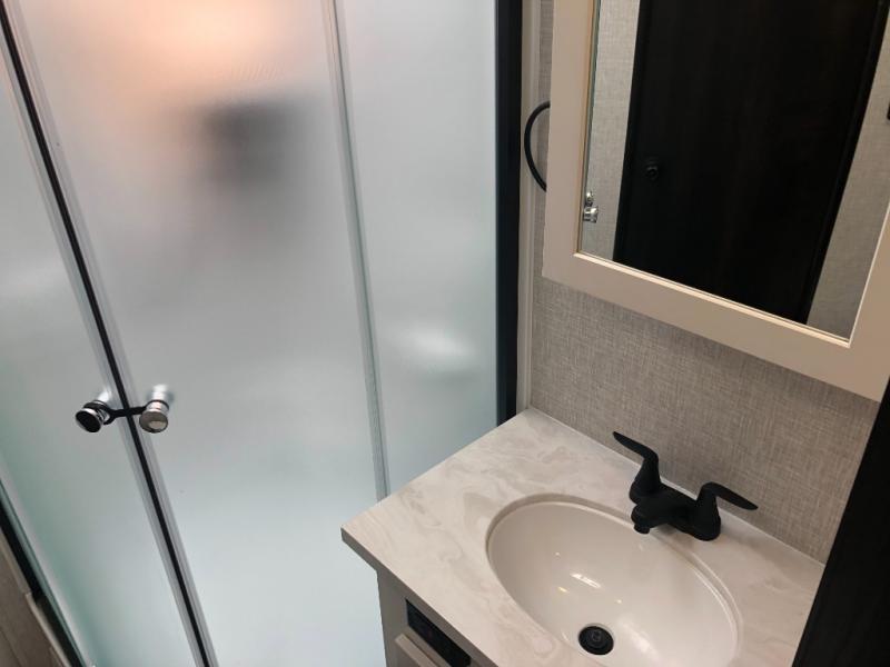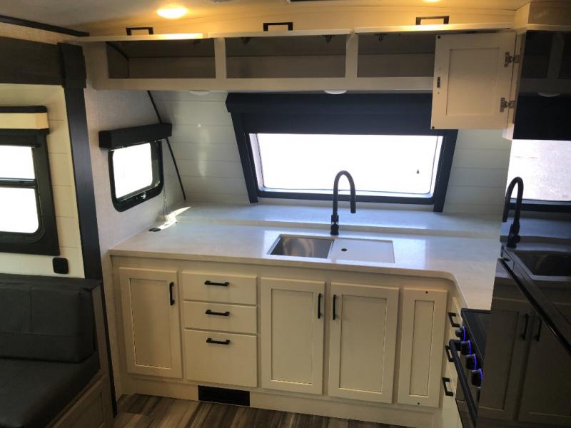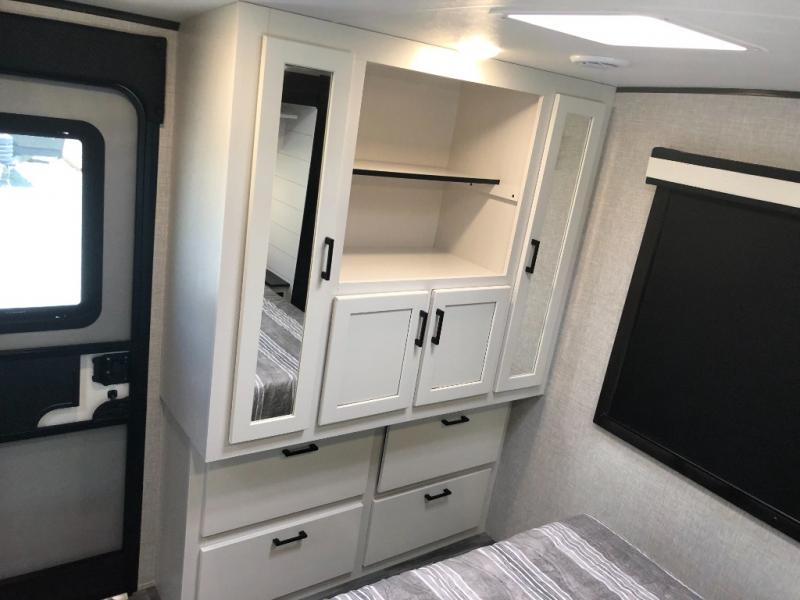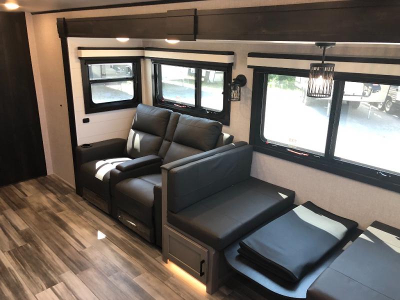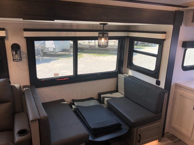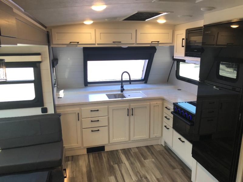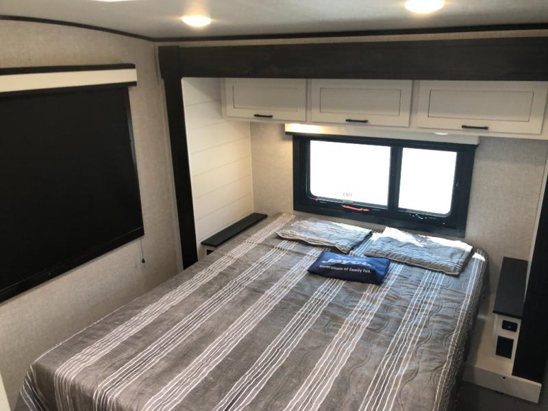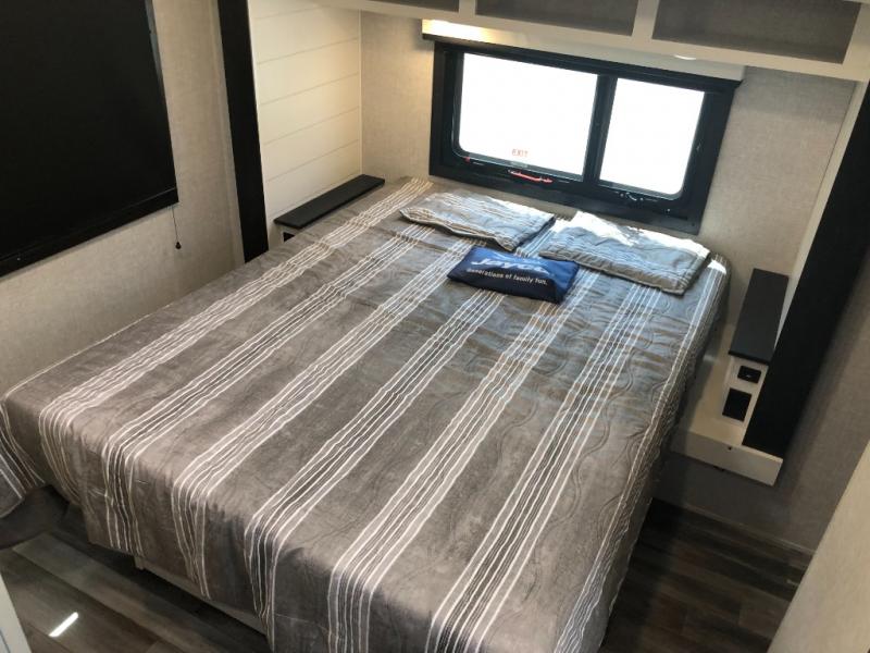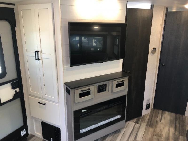 You will experience a smooth flow of traffic in and out of this travel trailer with dual entry doors! The rear private bedroom has one of the entrance/exit doors so you can sneak out for an early morning fishing trip, a queen bed slide for more space, and a wardrobe for your clothes. The full bathroom has a radius shower to clean up in and handy storage areas like a linen closet, a medicine cabinet, and a shelf. Grab a snack from one of the two pantries and head to the theater seating with swivel tables across from the entertainment center for a relaxing movie night. The chef will love cooking in the front kitchen with all of the countertop space and three burner cooktop. It comes standard with a booth dinette, but you can switch it out for the optional table and two chairs with ottoman or the optional table and four chairs.