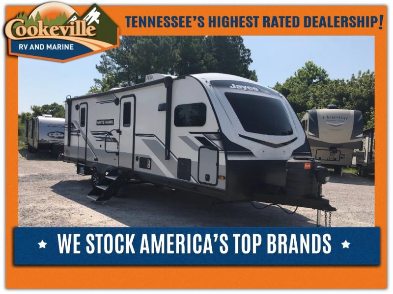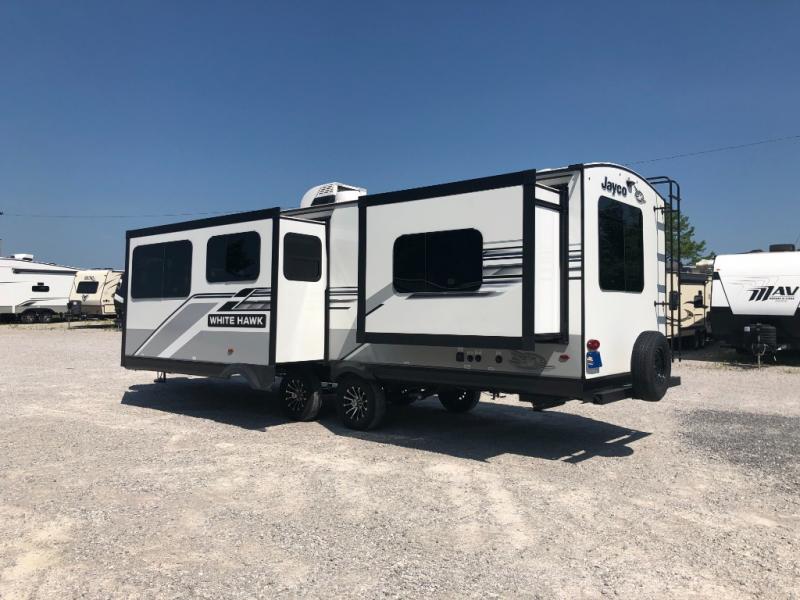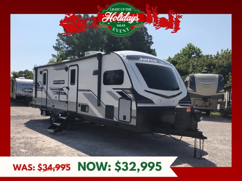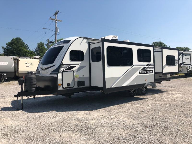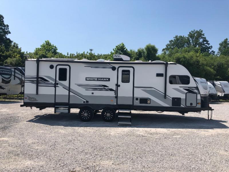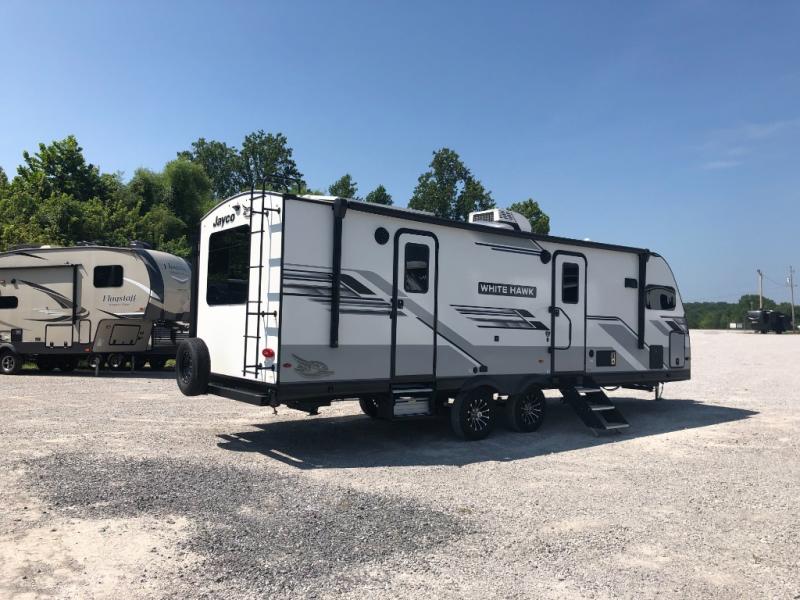 The lightweight White Hawk travel trailers by Jayco will blow you away with their roomy interiors, luxurious amenities, and durable construction. The Magnum Truss Roof System can withstand 50% more weight than the competition, and the Stronghold VBL lamination is the lightest, yet strongest in the industry. Each model includes American-made Goodyear tires with self-adjusting brakes, dark tinted, frameless safety glass windows, and modern graphics package with dual-colored sidewalls for a sleek look. The White Hawk travel trailers also include a barreled interior ceiling with up to 81" of interior height, an electric fireplace, decorative kitchen backsplash, plus many more interior comforts!