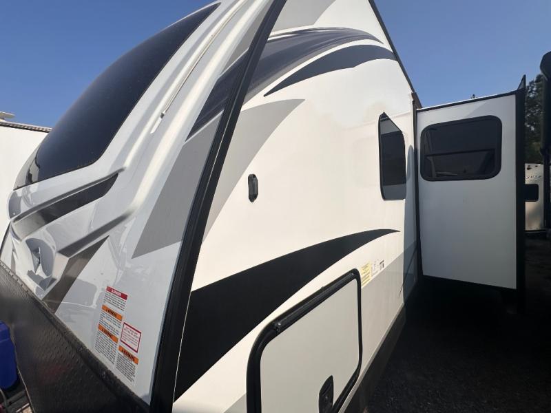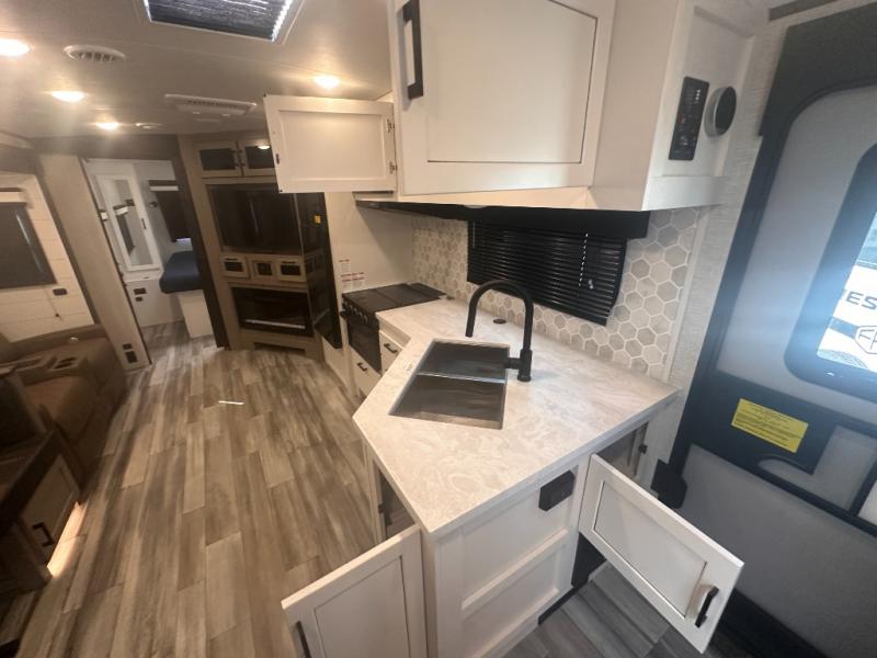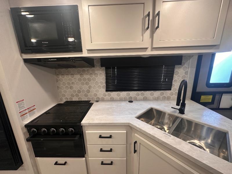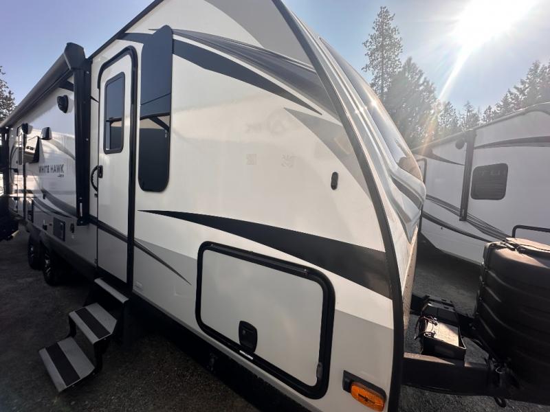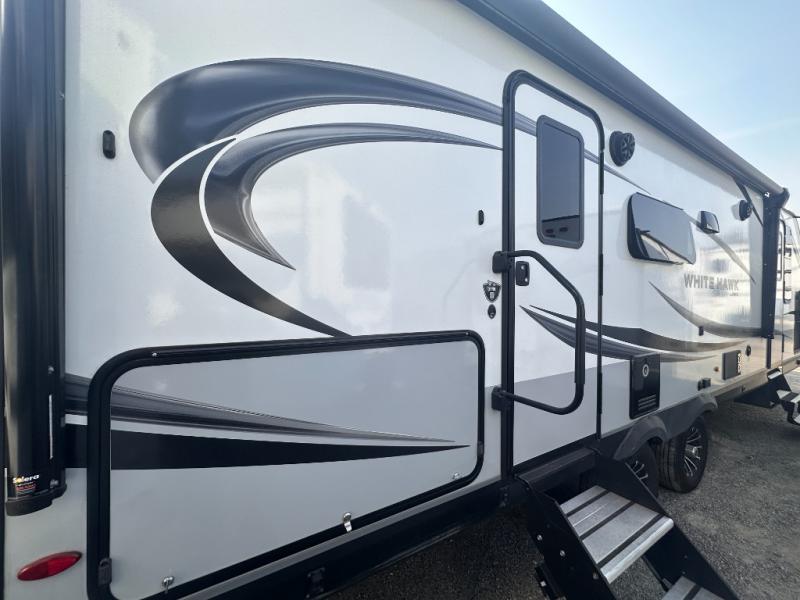 The lightweight White Hawk travel trailers by Jayco will blow you away with their roomy interiors, luxurious amenities, and durable construction. The Magnum Truss Roof System can withstand 50% more weight than the competition, and the Stronghold VBL lamination is the lightest, yet strongest in the industry. Each model includes American-made Goodyear tires with self-adjusting brakes, dark tinted, frameless safety glass windows, and modern graphics package with dual-colored sidewalls for a sleek look. The White Hawk travel trailers also include a barreled interior ceiling with up to 81" of interior height, an electric fireplace, decorative kitchen backsplash, plus many more interior comforts!