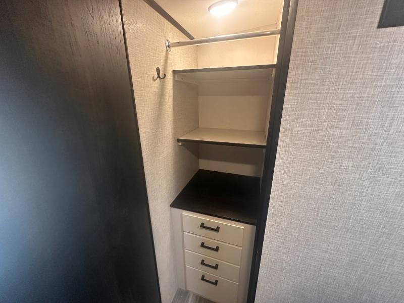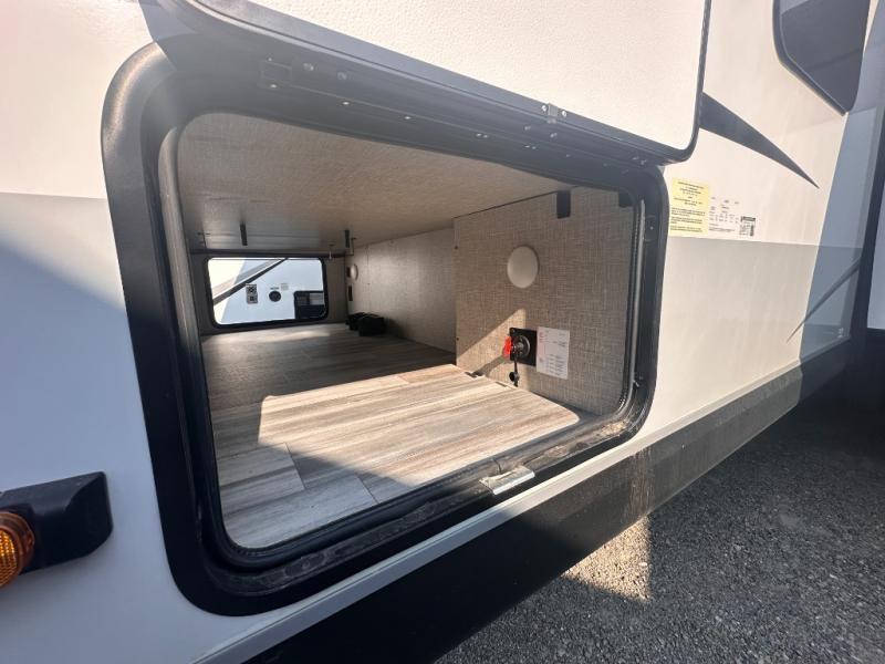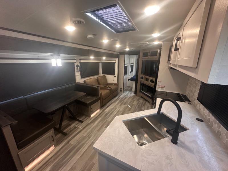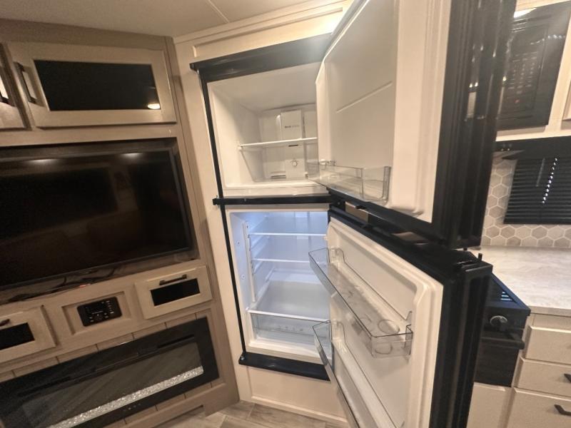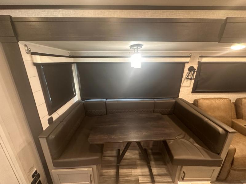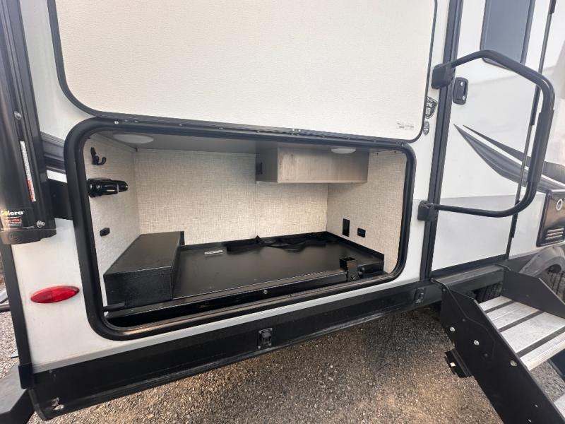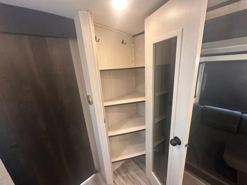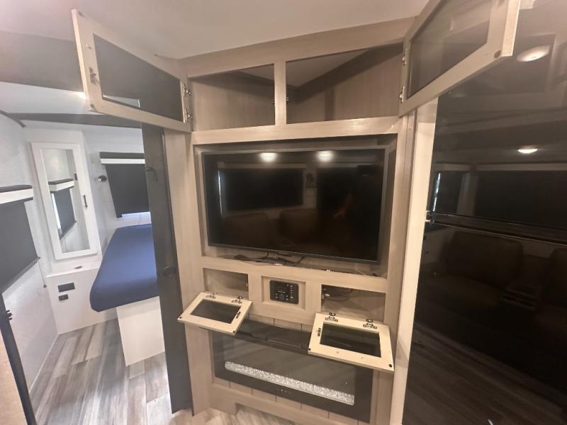Your family will love camping every other weekend in this spacious travel trailer. The full rear bath is tucked away in the back for privacy, and there are dual entry doors for convenience. When you're not outside cooking on the outdoor kitchen, gather around the U-shaped dinette for game night. You'll find the LED TV and fireplace will make this area feel more like home, and there is a pantry to store snacks and dry goods. When it comes time to call it a night, head to the front private bedroom for a great night's rest on the queen bed, and you'll find two wardrobes plus a closet to keep your clothes tidy.