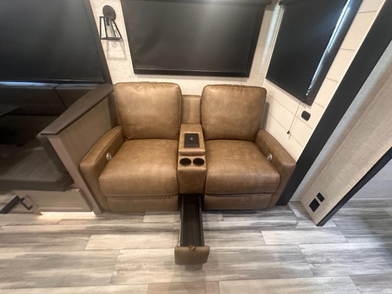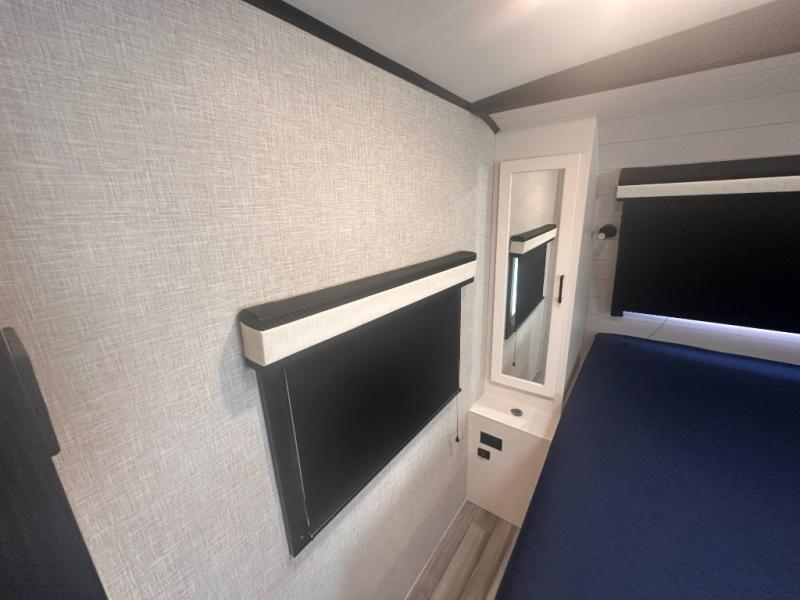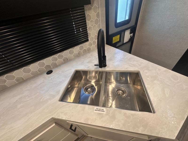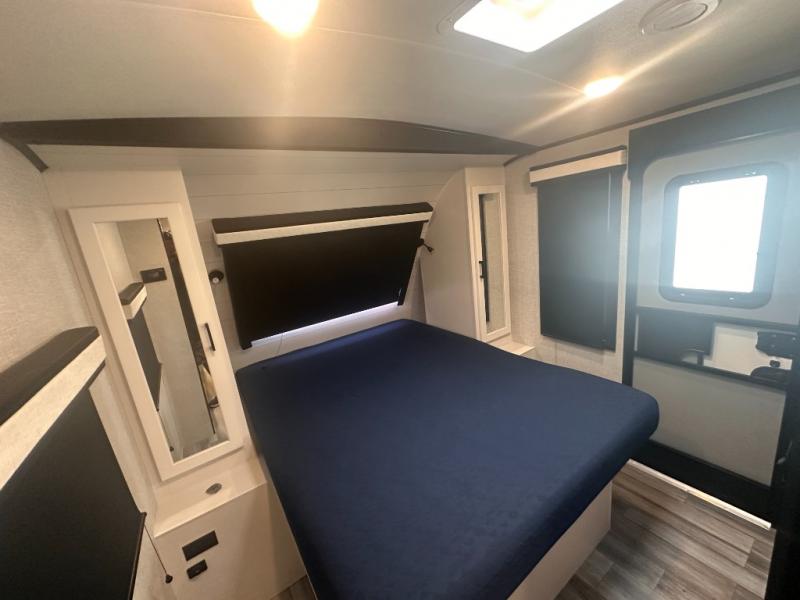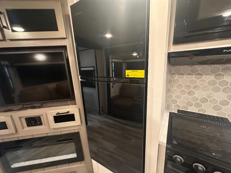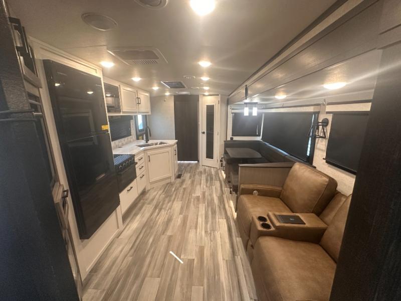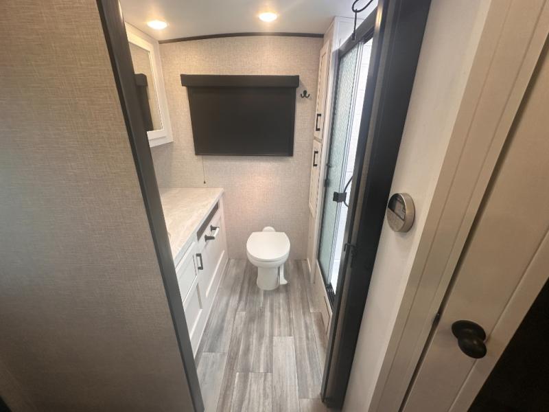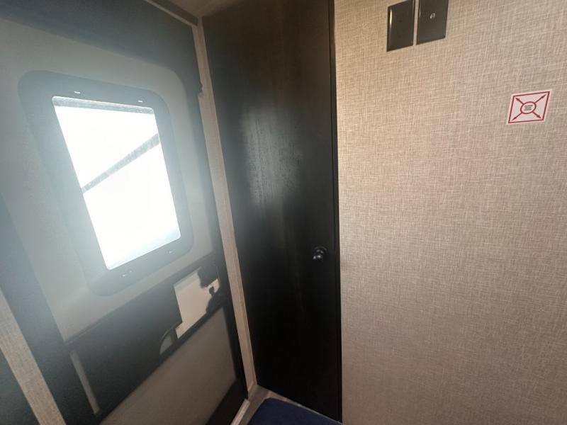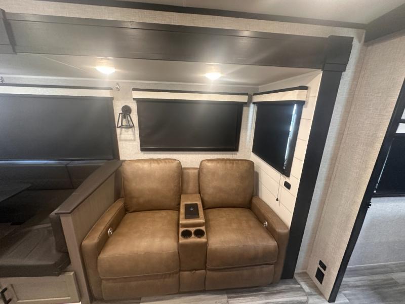 Your family will love camping every other weekend in this spacious travel trailer. The full rear bath is tucked away in the back for privacy, and there are dual entry doors for convenience. When you're not outside cooking on the outdoor kitchen, gather around the U-shaped dinette for game night. You'll find the LED TV and fireplace will make this area feel more like home, and there is a pantry to store snacks and dry goods. When it comes time to call it a night, head to the front private bedroom for a great night's rest on the queen bed, and you'll find two wardrobes plus a closet to keep your clothes tidy.