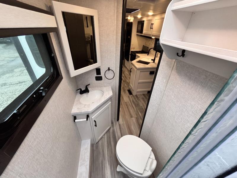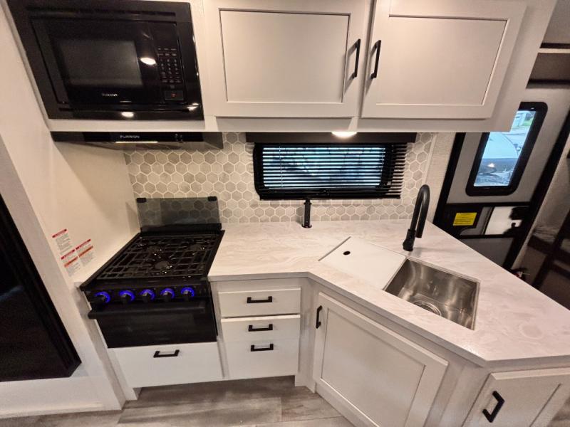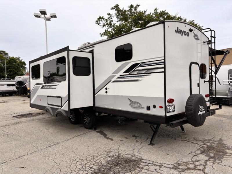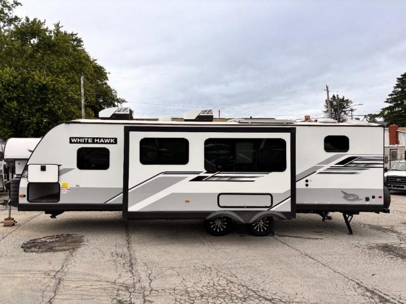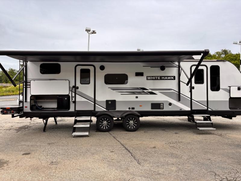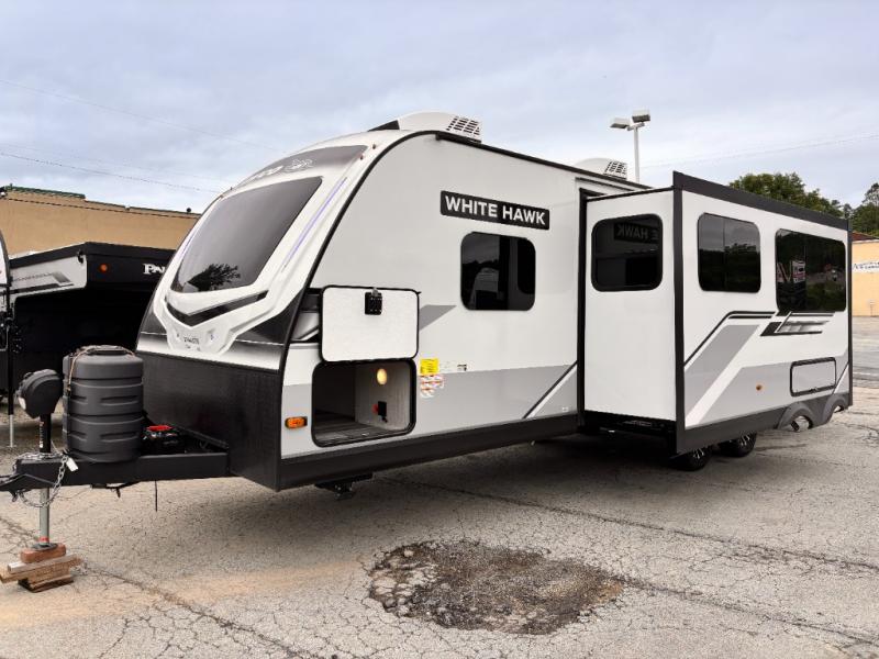 The lightweight White Hawk travel trailers by Jayco will blow you away with their roomy interiors, luxurious amenities, and durable construction. The Magnum Truss Roof System can withstand 50% more weight than the competition, and the Stronghold VBL lamination is the lightest, yet strongest in the industry. Each model includes American-made Goodyear tires with self-adjusting brakes, dark tinted, frameless safety glass windows, and modern graphics package with dual-colored sidewalls for a sleek look. The White Hawk travel trailers also include a barreled interior ceiling with up to 81" of interior height, an electric fireplace, decorative kitchen backsplash, plus many more interior comforts!
