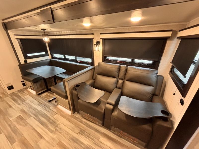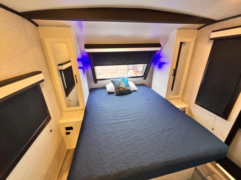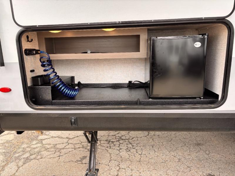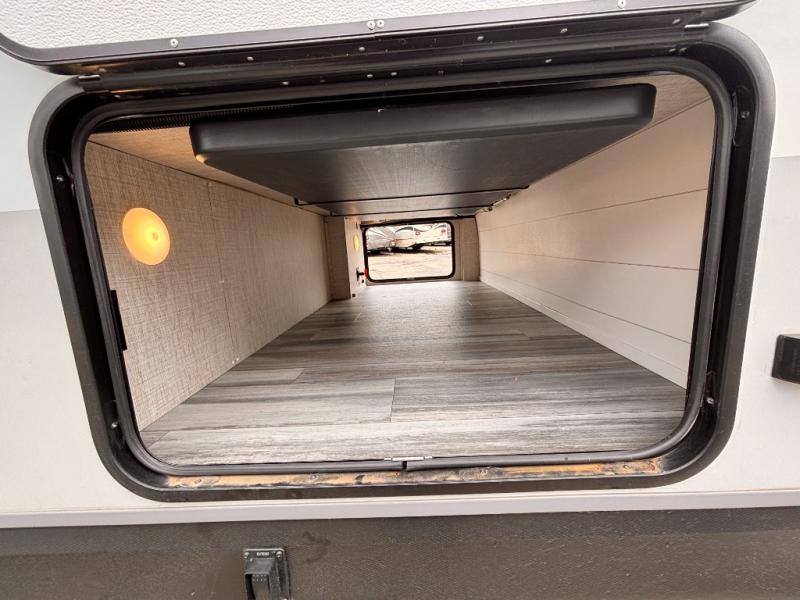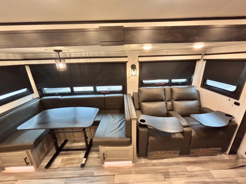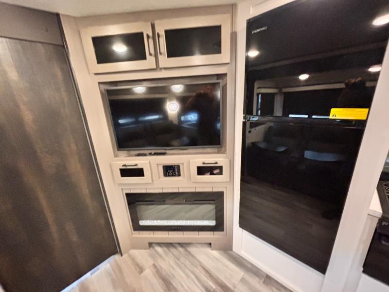 Bring the whole family along in this spacious travel trailer. You will love visiting outside while the chef of your group prepares breakfast on the outdoor kitchen, plus there is a 21' power awning to shade you from the sun. If the weather isn't cooperating, head inside and dine around the U-shaped dinette. There is also a tri-fold sofa here, a fireplace, and an LED TV for movies. This model conveniently has dual entry doors so you can enter in through the main living area, or into the front private bedroom. The bedroom also features a queen bed, dual wardrobes, and a closet to keep your items organized. Start camping today!
