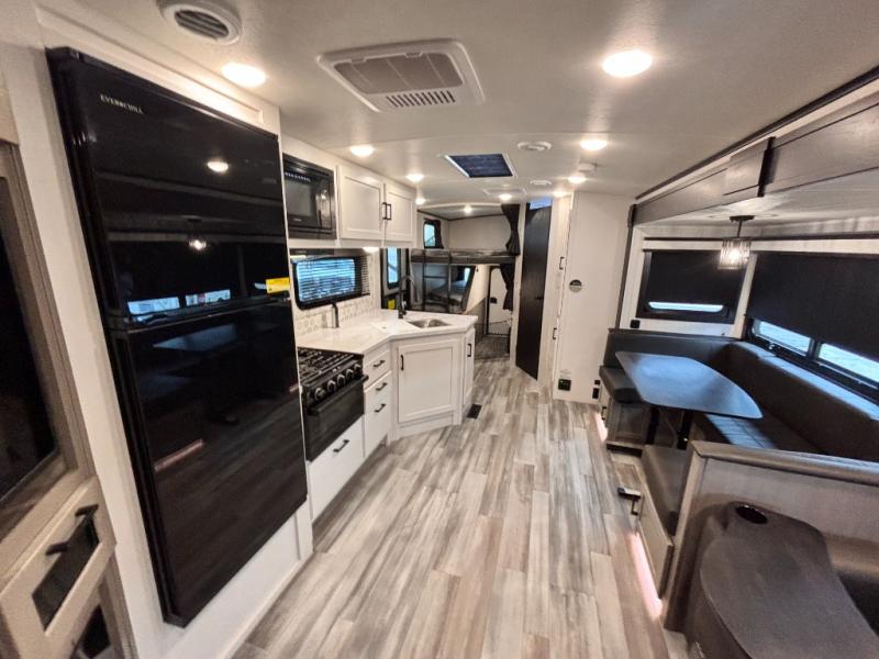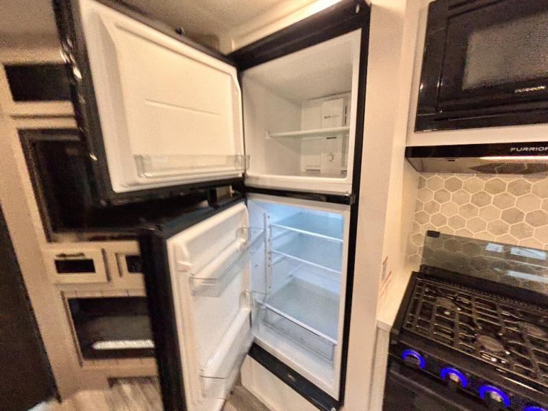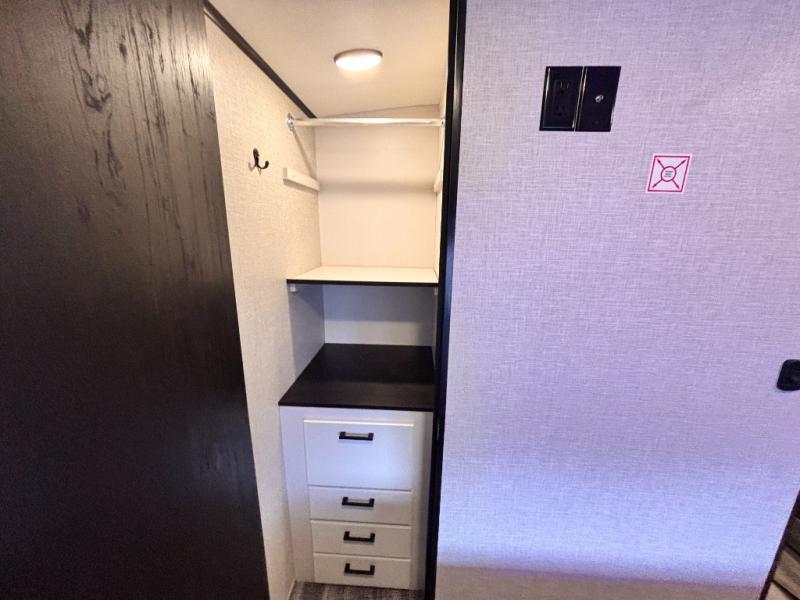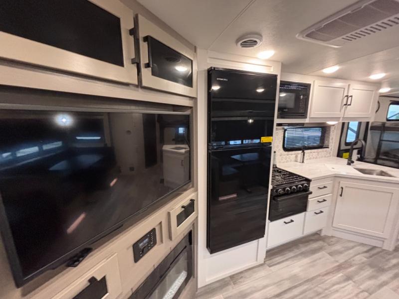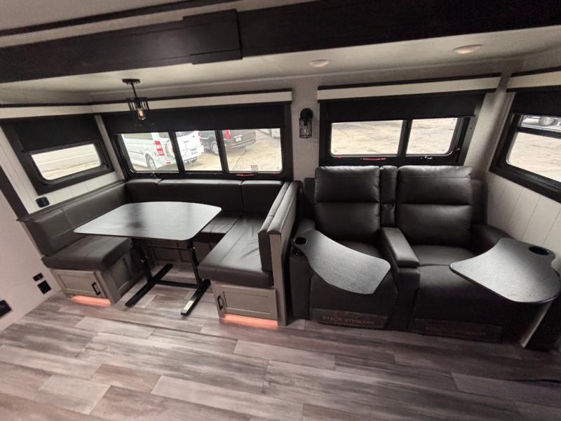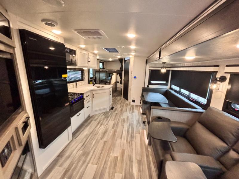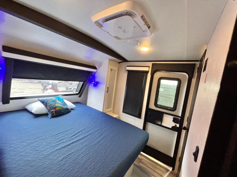 Bring the whole family along in this spacious travel trailer. You will love visiting outside while the chef of your group prepares breakfast on the outdoor kitchen, plus there is a 21' power awning to shade you from the sun. If the weather isn't cooperating, head inside and dine around the U-shaped dinette. There is also a tri-fold sofa here, a fireplace, and an LED TV for movies. This model conveniently has dual entry doors so you can enter in through the main living area, or into the front private bedroom. The bedroom also features a queen bed, dual wardrobes, and a closet to keep your items organized. Start camping today!