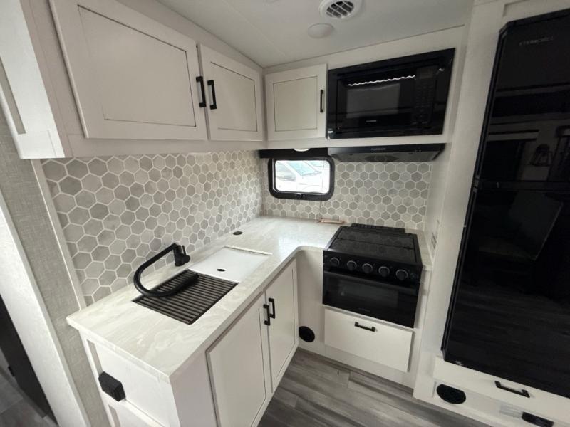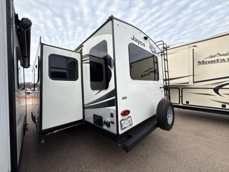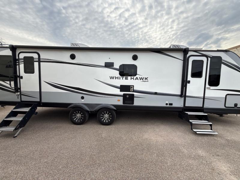 The lightweight White Hawk travel trailers by Jayco will blow you away with their roomy interiors, luxurious amenities, and durable construction. The Magnum Truss Roof System can withstand 50% more weight than the competition, and the Stronghold VBL lamination is the lightest, yet strongest in the industry. Each model includes American-made Goodyear tires with self-adjusting brakes, dark tinted, frameless safety glass windows, and modern graphics package with dual-colored sidewalls for a sleek look. The White Hawk travel trailers also include a barreled interior ceiling with up to 81" of interior height, an electric fireplace, decorative kitchen backsplash, plus many more interior comforts!