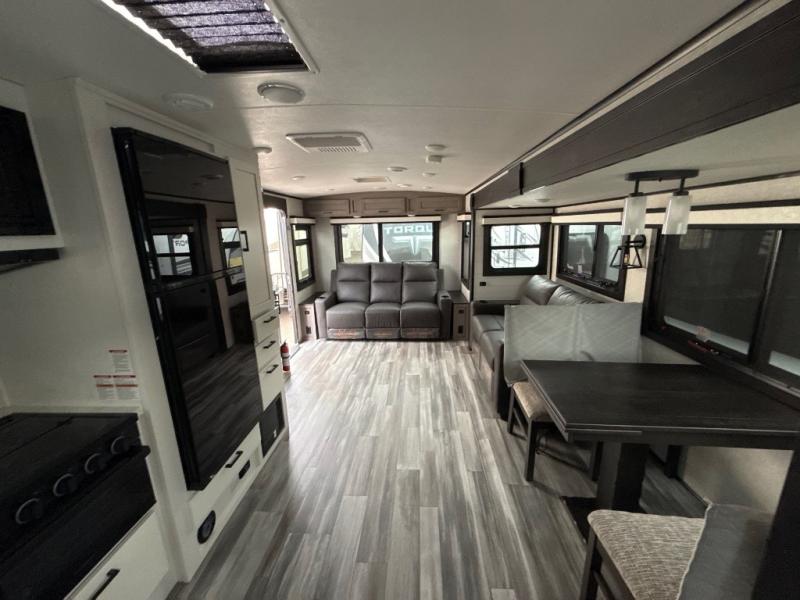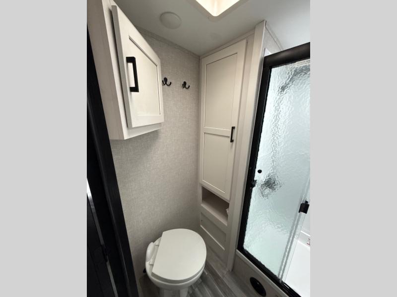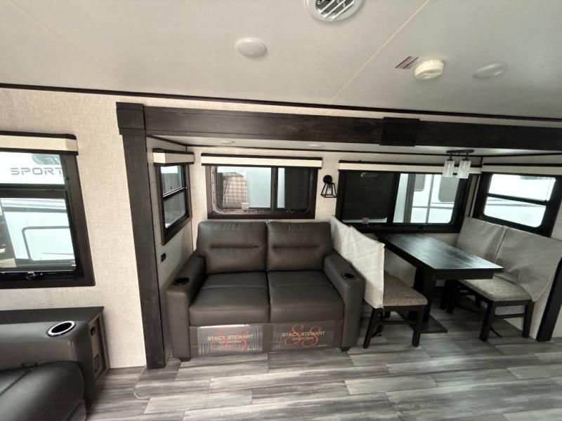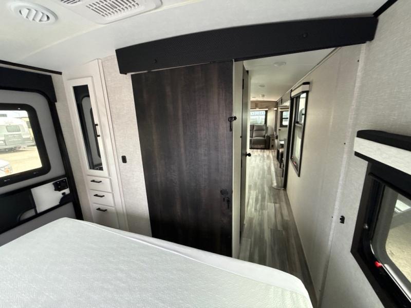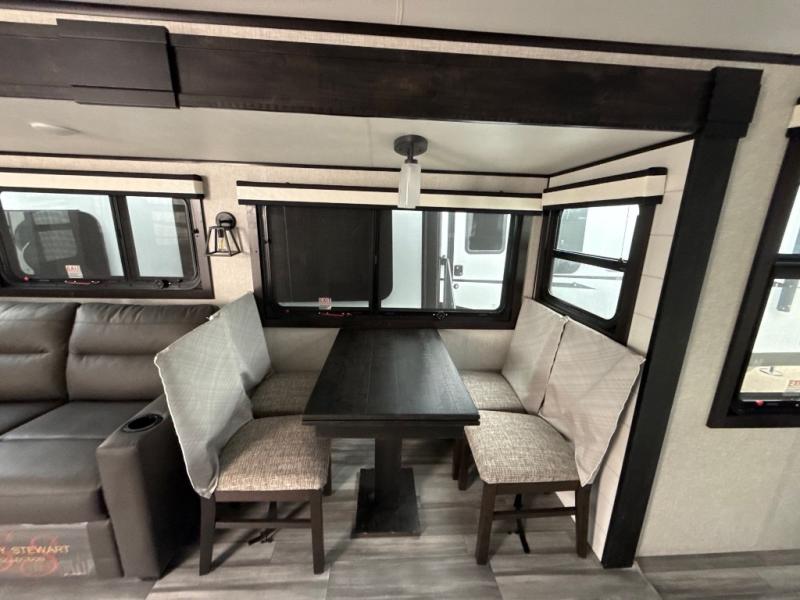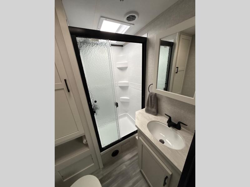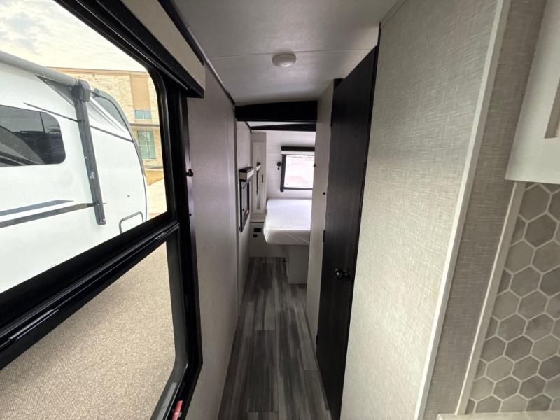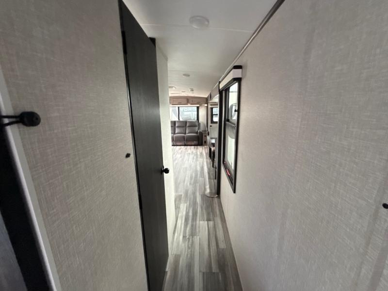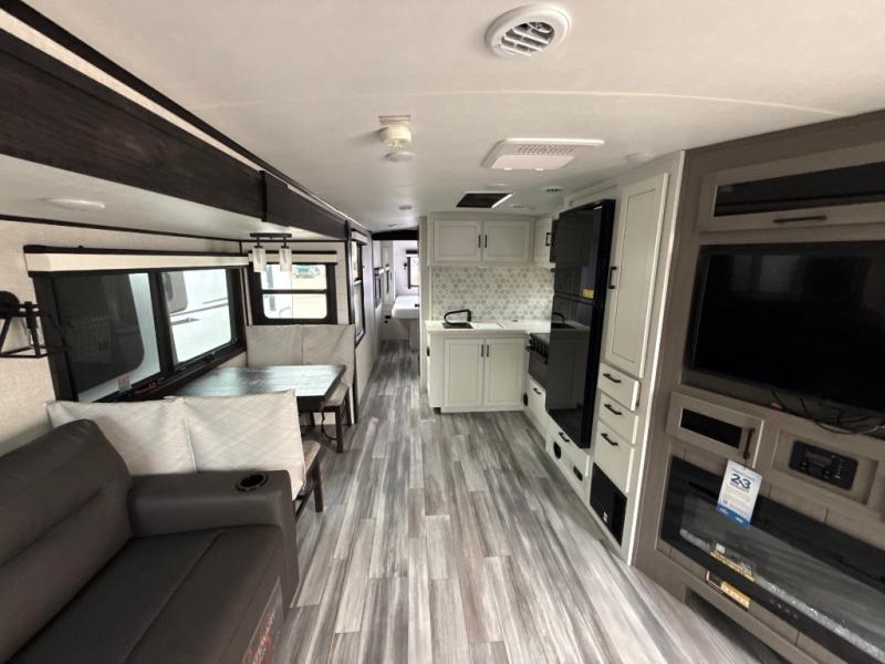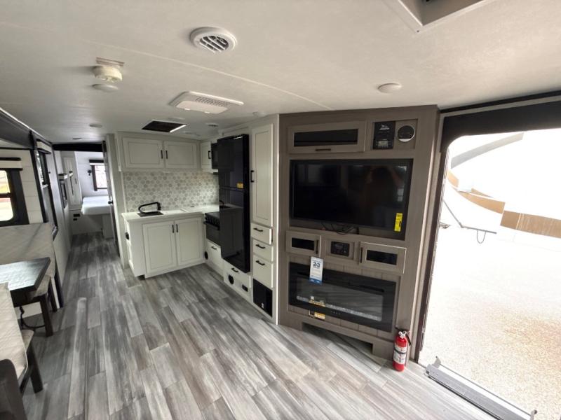 How does a dual entry travel trailer sound with sleeping space for five? Pack up and head to the lake because this model is the one! Once you arrive at your destination, set up the 20' power awning and a enjoy a cold drink in your camp chair. There is a convenient Jayport with an LP quick connect if you want to hook up your gas grill you brought along, and plenty of outside storage to bring along the fishing poles. Inside, your crew can relax on the tri-fold sofa, the booth dinette, or the rear theater seat, which is in great view of the LED TV and fireplace. Preparing meals will be easy in this White Hawk kitchen with plenty of counter space, a three burner cooktop, plus a microwave oven. The full bath includes a linen closet to store clean towels and a medicine cabinet to bring along your necessities. And don't overlook the front private bedroom with a queen bed, dual wardrobes, and its own exterior entry door for convenience!