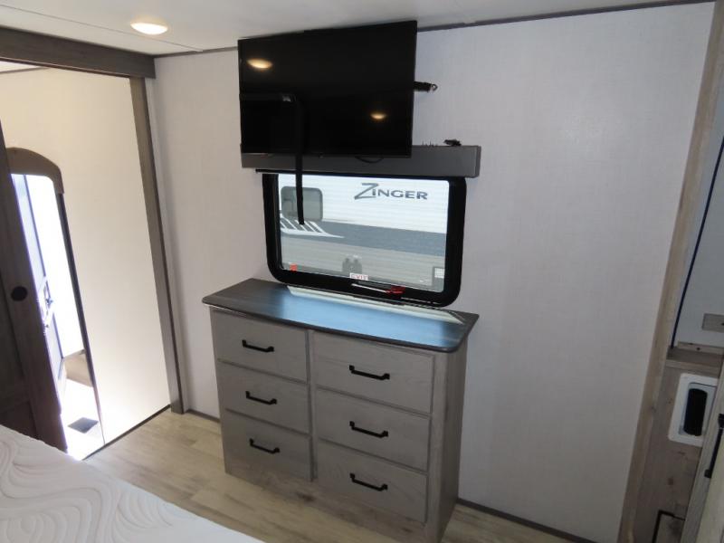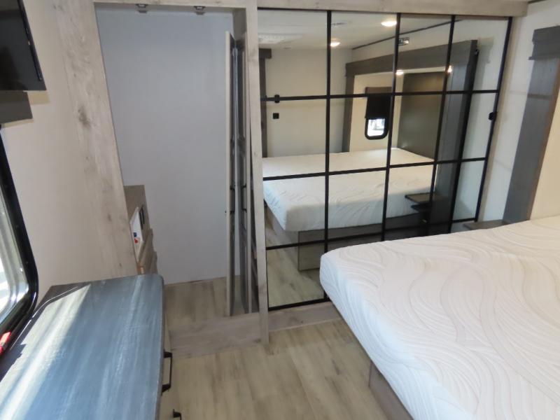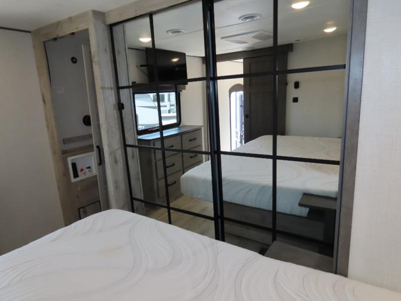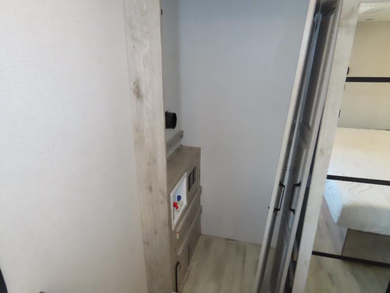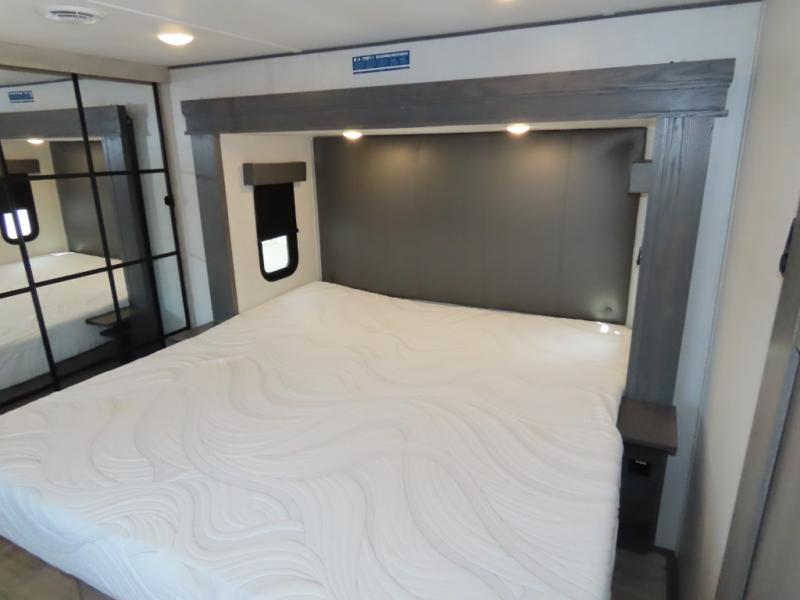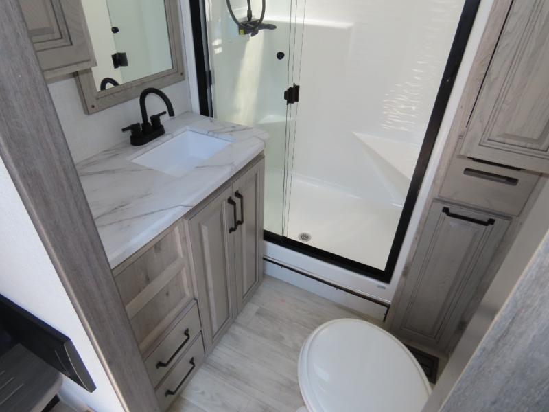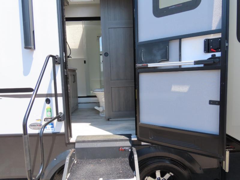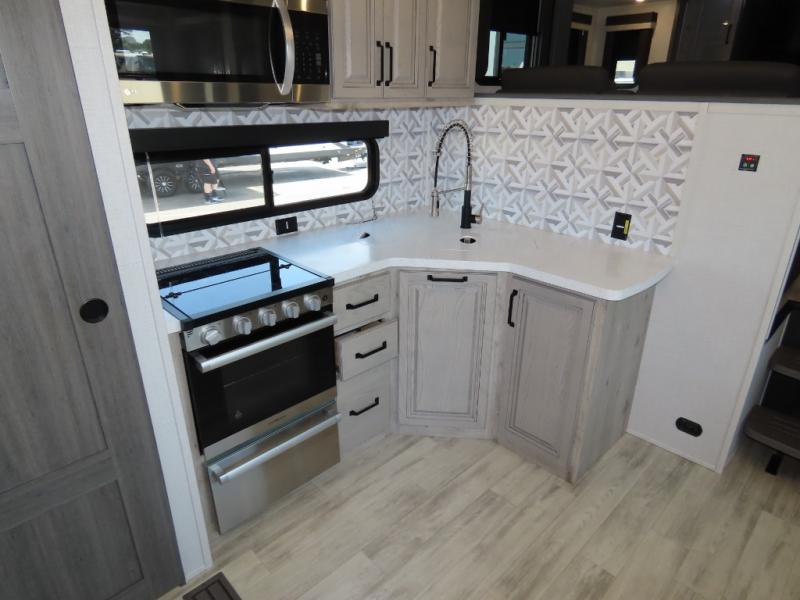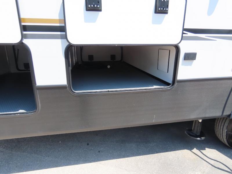 The front living area offers two of those slides each with a tri-fold sleeper sofa for family or overnight guests. A full wall entertainment center with 65" Smart HD TV and fireplace, plus a theater seat sets this space up as a great gathering place for all to enjoy. Step down to the spacious kitchen and dining area with free standing table and four chairs, a coffee station, plus a refrigerator and range with residential microwave overhead. You can easily prepare and enjoy meals while you travel just like at home. At the rear of this amazing coach, you will find a raised private master bedroom featuring a king bed slide with storage beneath for extra blankets and such, plus under the entire bedroom area on the outside you will find colossal storage for all sorts of things! The master bedroom offers a master closet, dresser, and a space prepped for a stackable washer and dryer if you choose to add. This unit also features a convenient bathroom located just inside the main entry allowing easy access from outside.