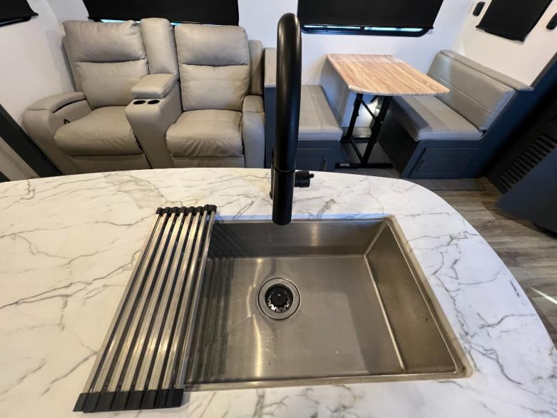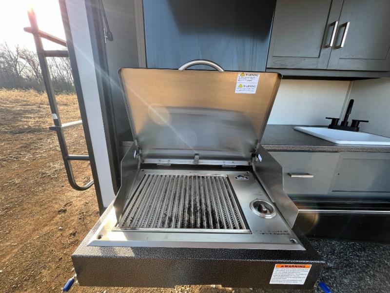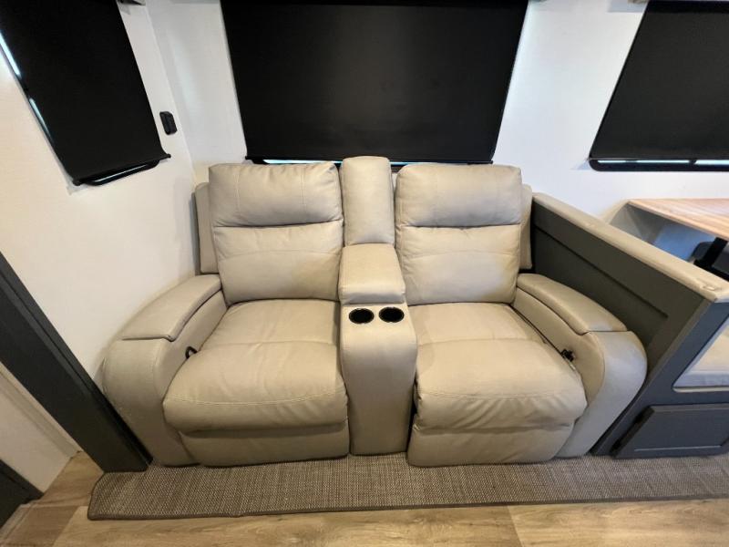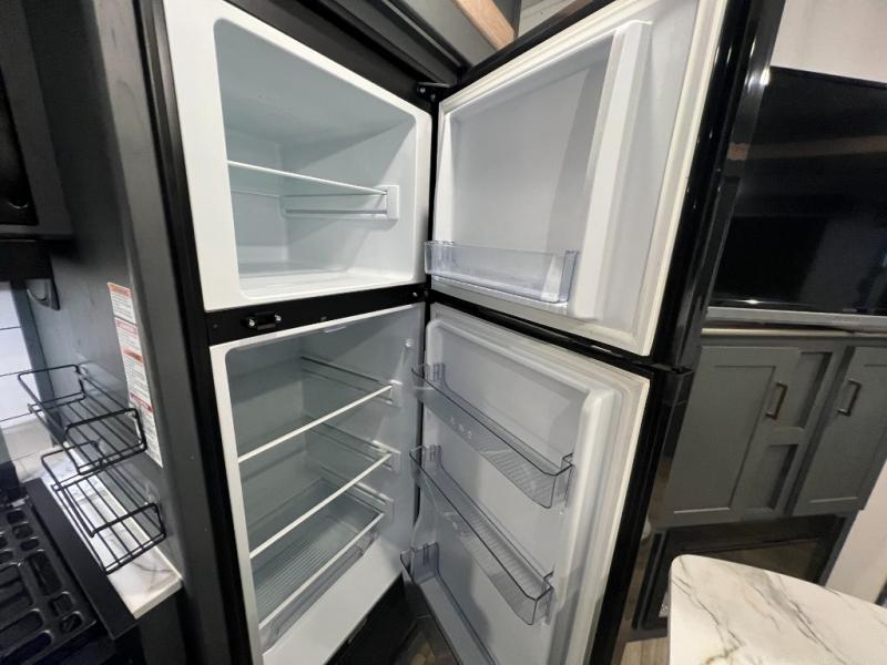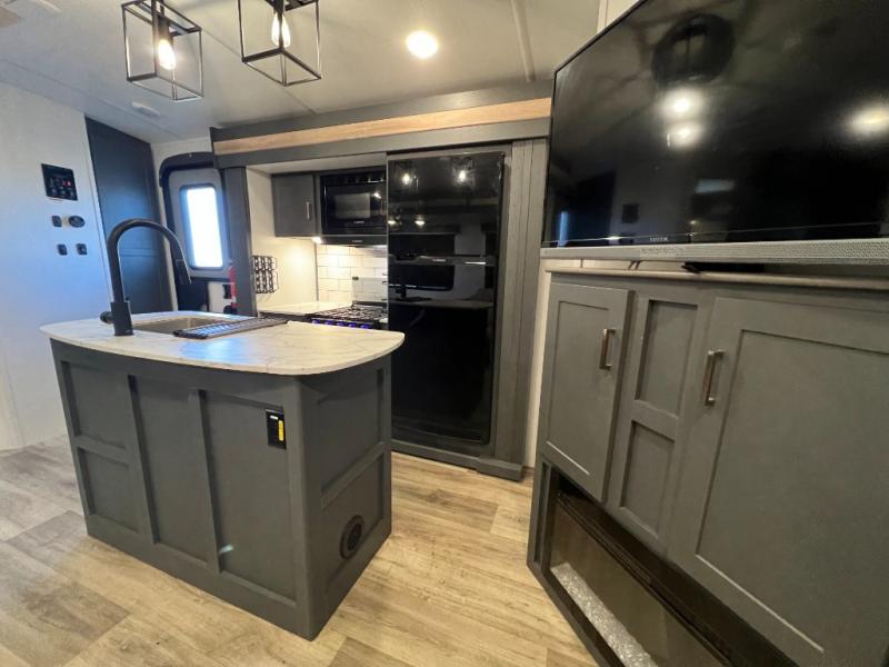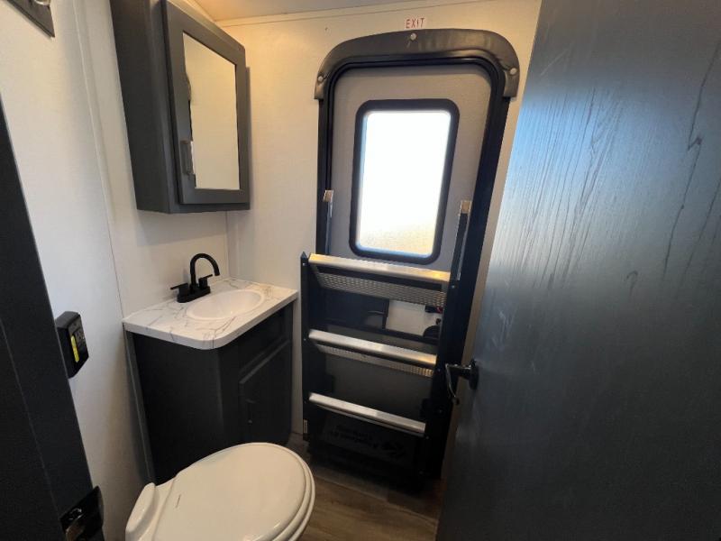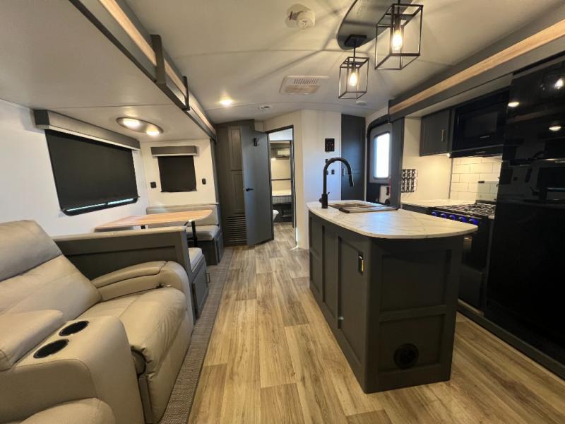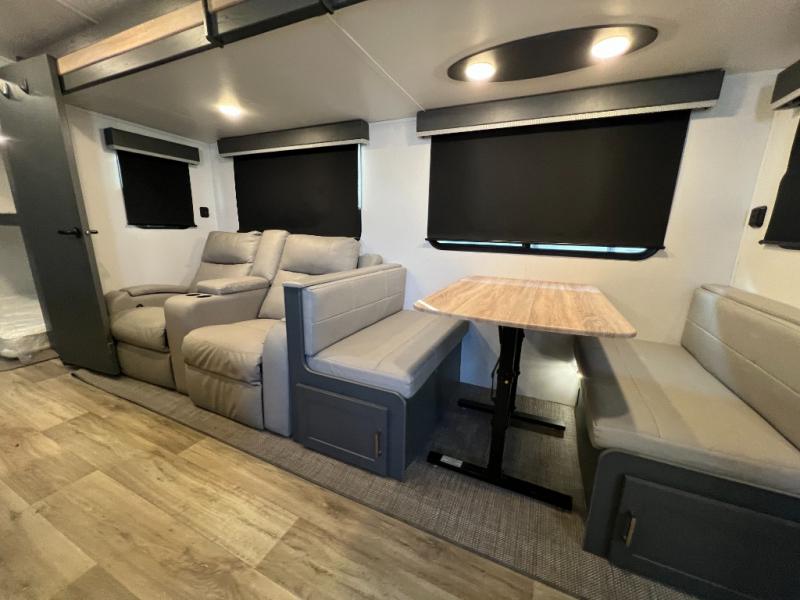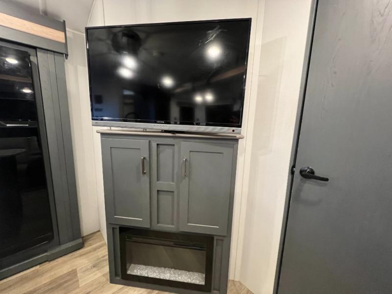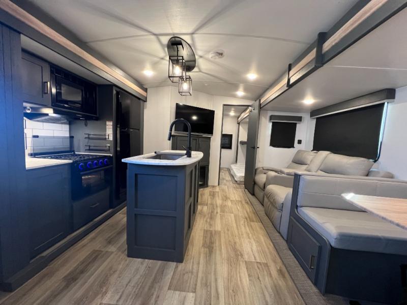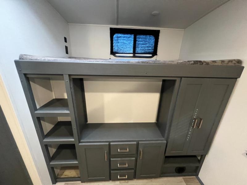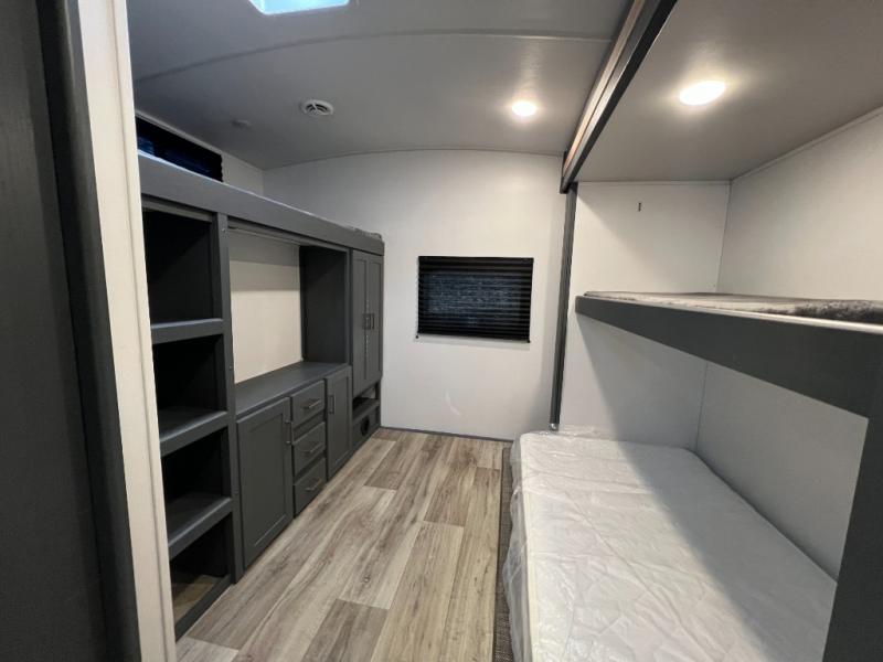 This travel trailer is one the whole gang will love! There is a rear private bunkhouse suite for your guests or the kids, plus a front master bedroom for you. The bunkhouse includes a tri-fold sofa with a flip-up bunk across from a second bunk, plus there is a half bath with its own exterior entry door! The full walk-through bath leads into the front bedroom where you'll find a queen bed, dual wardrobes and a laundry chute so you can throw clothes directly into the pass-through. A super slide in the combined living area and kitchen will provide ample space to move about, and you will find comfy seating on the tri-fold sofa and Do-More dinette table. There is even a fireplace and an entertainment center!