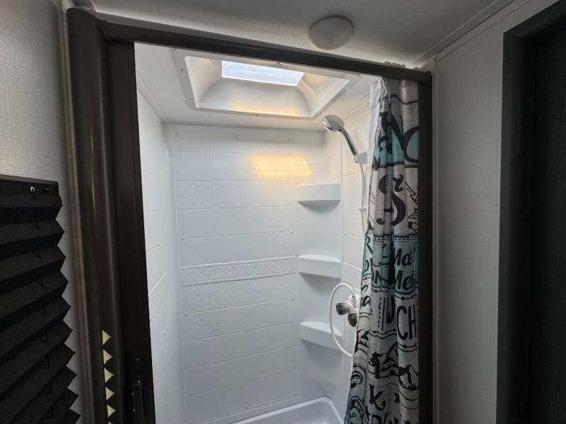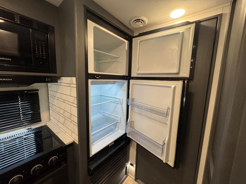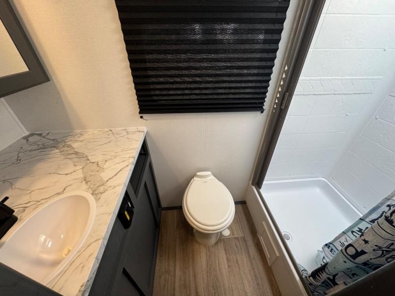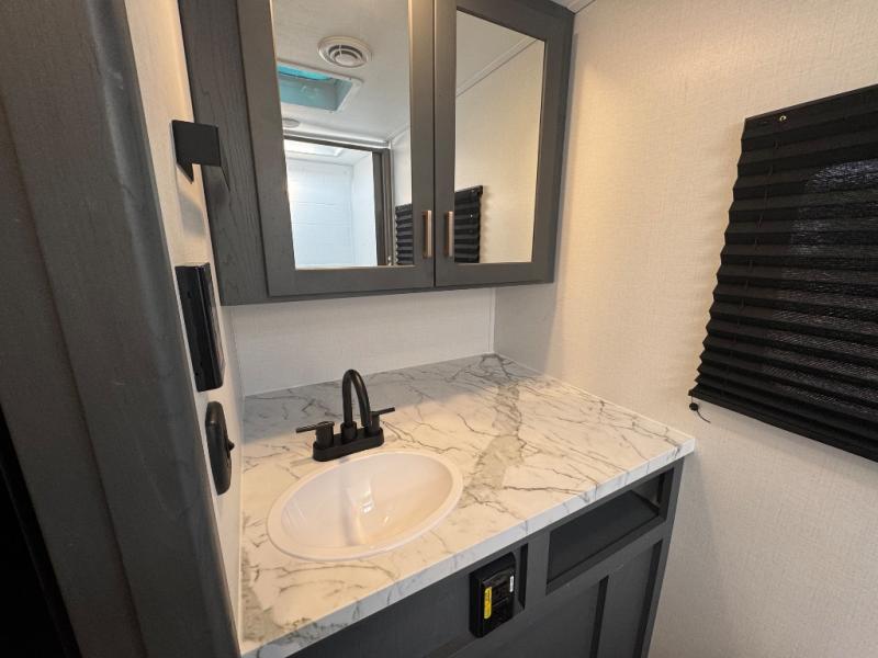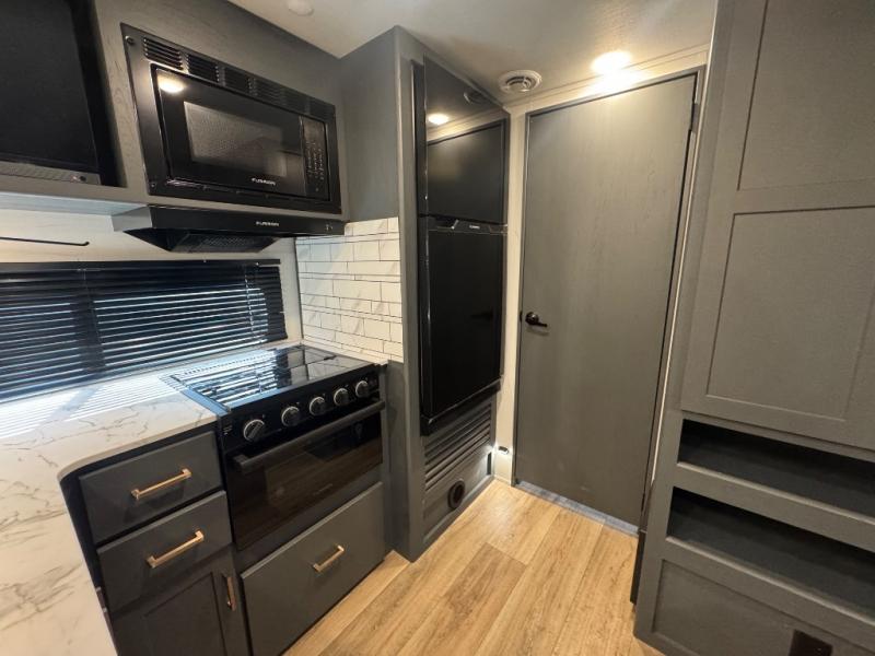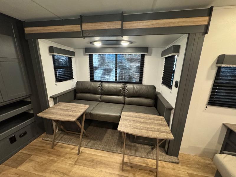 Each Bullet Crossfire Double Axle travel trailer by Keystone is constructed with a NORCO HSLA steel/automotive deposition coated frame assembled with huck bolts for durability. The TORFLEX rubber torsion suspension will provide smooth towing, and the one-piece ABS enclosed underbelly will help extend your camping season. Setting up your trailer will be a breeze with the electric tongue jack and four electric stabilizer jacks, and there is an electric awning with adjustable arms and LED lighting for an inviting outdoor living space. The affordable, high-quality RV solar energy system, SolarFlex Protect 220 comes standard with each model and will allow you to go off-grid when you want, or you can choose the optional SolarFlex Discover 440i for even more off-grid capabilities. Inside, you'll find fabric night shades, Beauflor woven flooring in the slides, full depth cabinets with full extension drawer guides, and many more comforts.