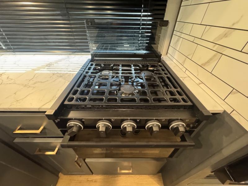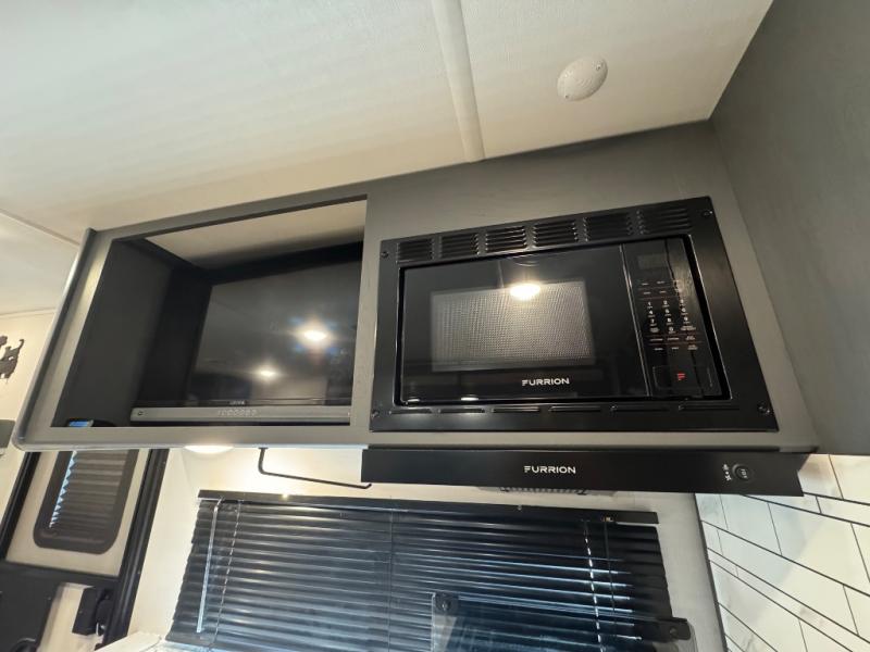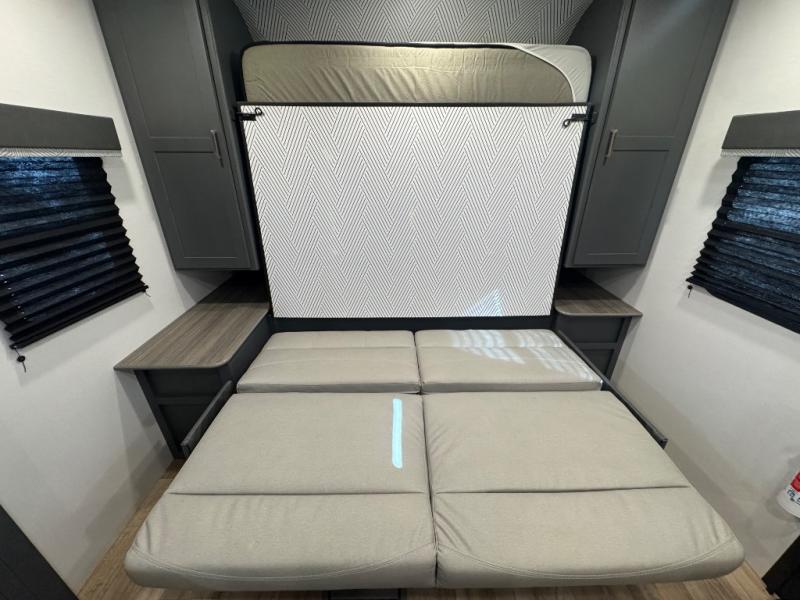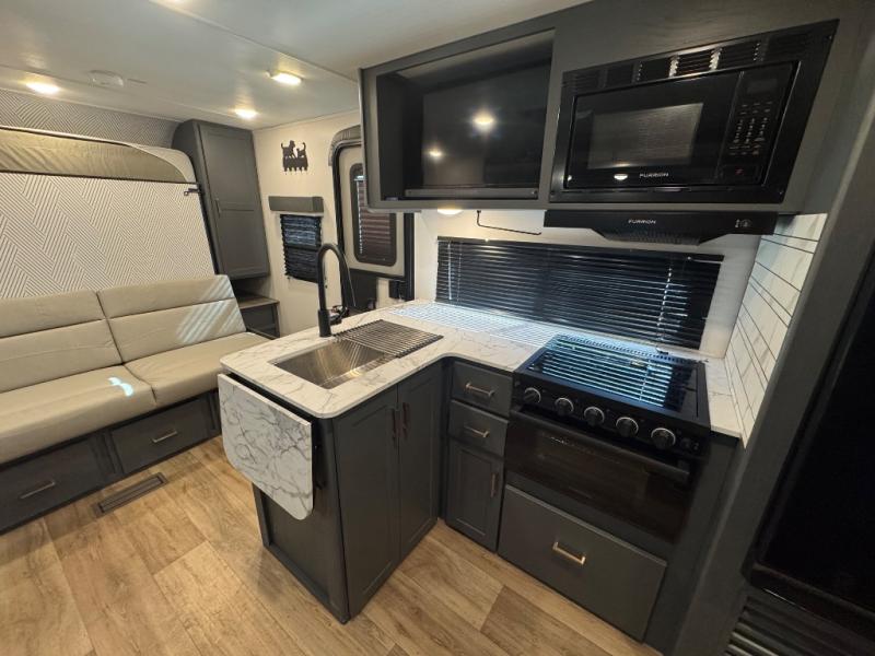This travel trailer has everything you need for unforgettable camping trips! You'll have a front sofa to relax on during the day, and a Murphy bed behind it that can fold down when you're ready to catch some zzz's. There are also dual wardrobes and dual nightstands here to keep your clothes and belongings tidy. The U-shaped Do-More dinette table not only provides a place to dine and house overnight guests, but also gives more space since it is on a slide out! If you don't need the additional sleeping space, just choose the optional theater dinette! Preparing home cooked meals will be a breeze in the kitchen with a two burner gas range, Furrion microwave, 8 cu. ft. 12V refrigerator, plus a flip-up countertop for more prep space. There is also an outside kitchen with a pull-out griddle if you want to keep food smells outdoors!
