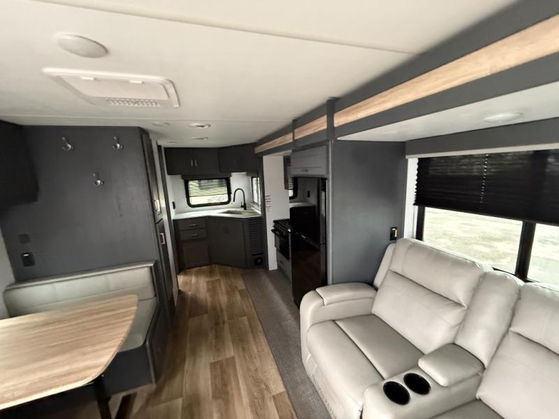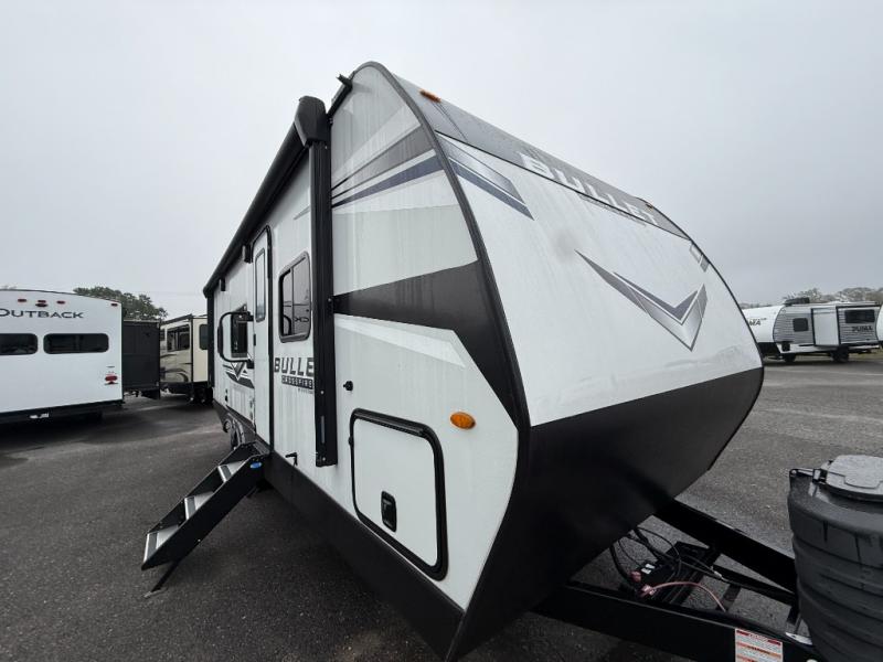 Each Bullet Crossfire Double Axle travel trailer by Keystone is constructed with a NORCO HSLA steel/automotive deposition coated frame assembled with huck bolts for durability. The TORFLEX rubber torsion suspension will provide smooth towing, and the one-piece ABS enclosed underbelly will help extend your camping season. Setting up your trailer will be a breeze with the electric tongue jack and four electric stabilizer jacks, and there is an electric awning with adjustable arms and LED lighting for an inviting outdoor living space. The affordable, high-quality RV solar energy system, SolarFlex Protect 220 comes standard with each model and will allow you to go off-grid when you want, or you can choose the optional SolarFlex Discover 440i for even more off-grid capabilities. Inside, you'll find fabric night shades, Beauflor woven flooring in the slides, full depth cabinets with full extension drawer guides, and many more comforts.