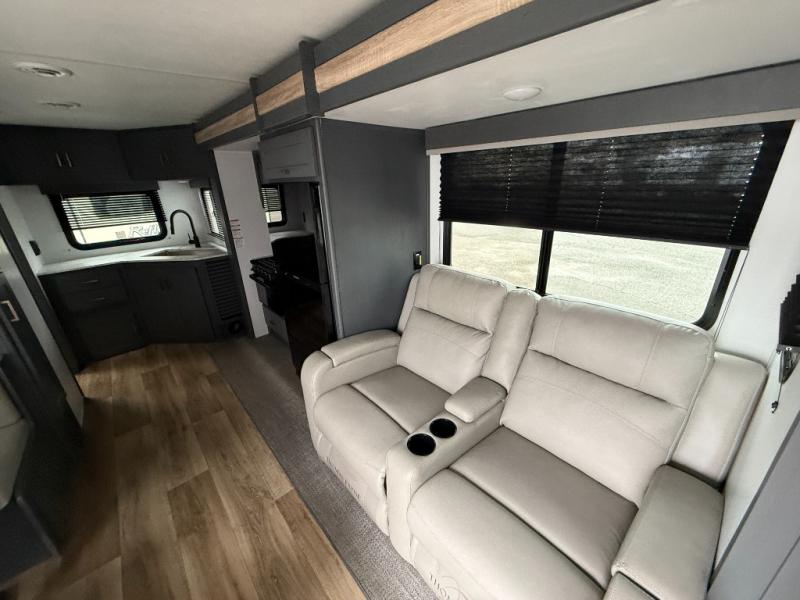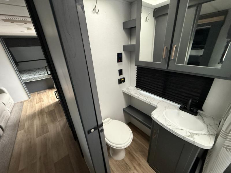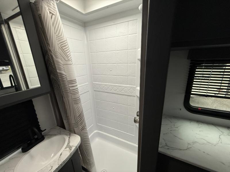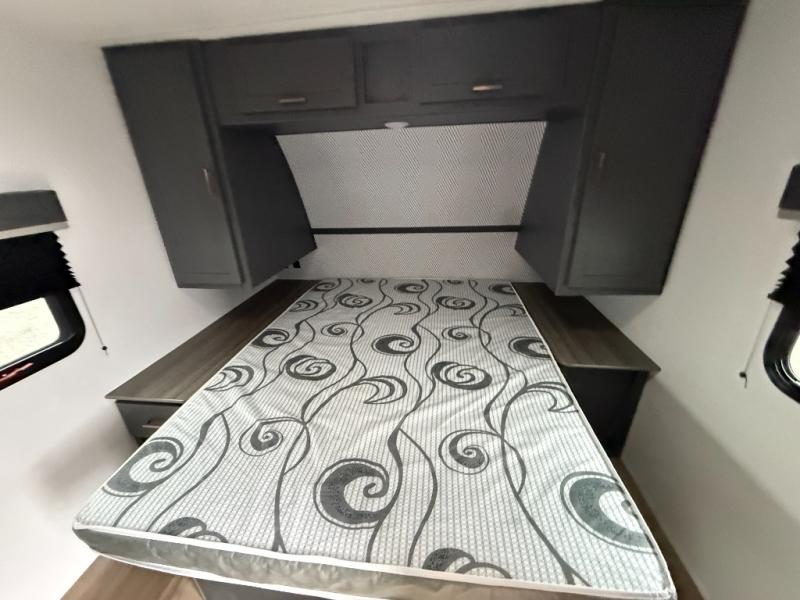Added sleeping space and a versatile Murphy bed are a dream come true in this cozy travel trailer. The double-size bunks include a flip-up bunk for added storage, and the front Murphy bed can be folded away in the morning so you can relax on the sofa. There is also a Do-More dinette table where you can dine, play games, and sleep more guests. This model includes a full bath to clean up in each day, and there is a pantry just outside the bath for clean towels and necessities or for snacks. And check out the exterior with its 15' power awning with LED lights, pass-through storage, and outdoor kitchen with a pull-out griddle and refrigerator.