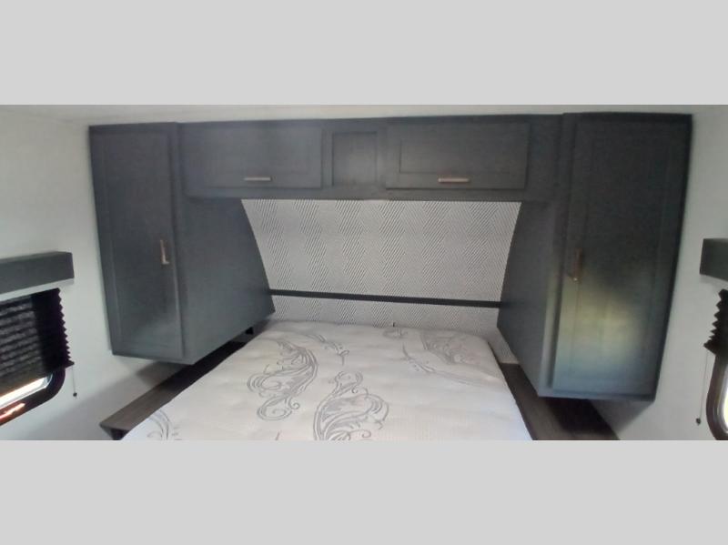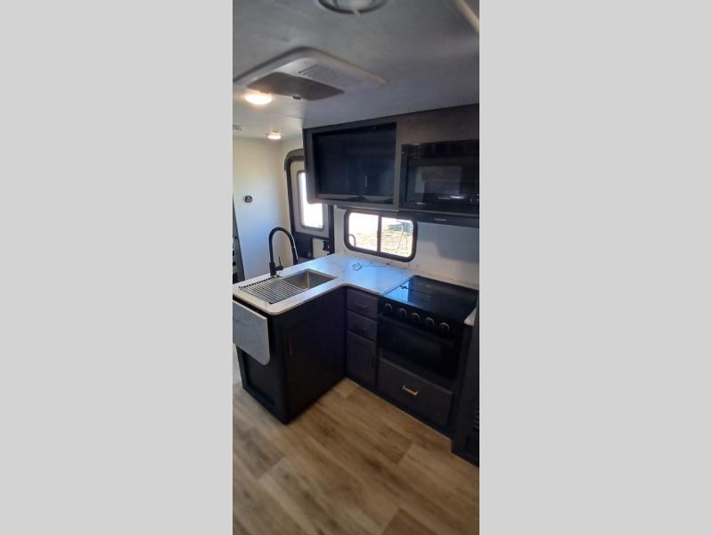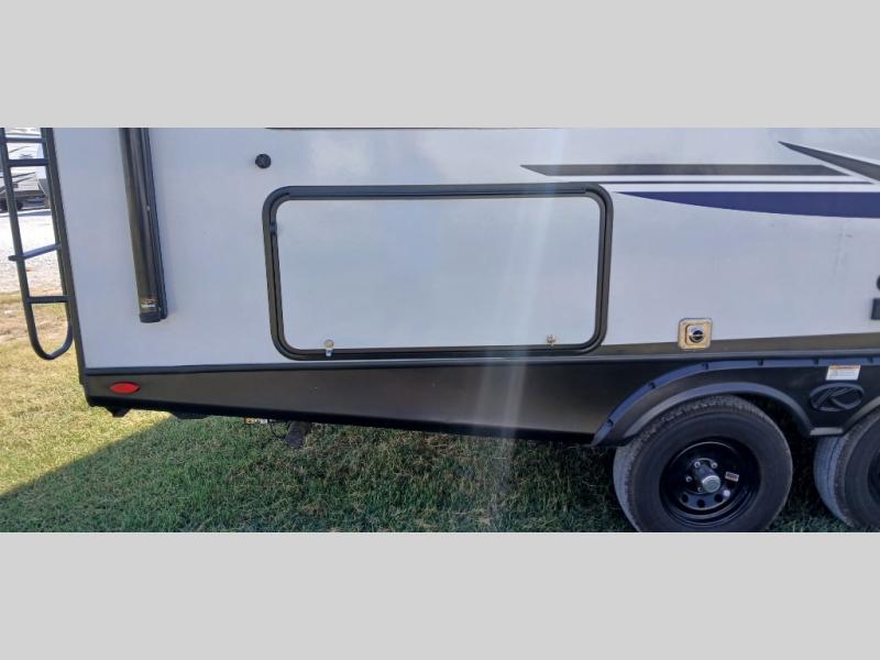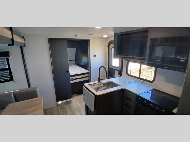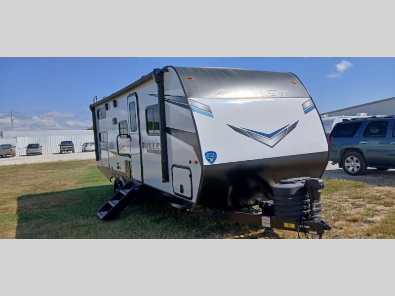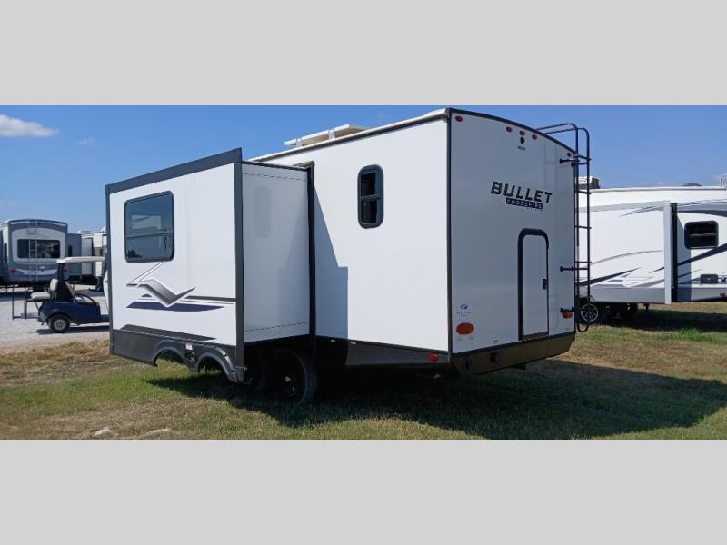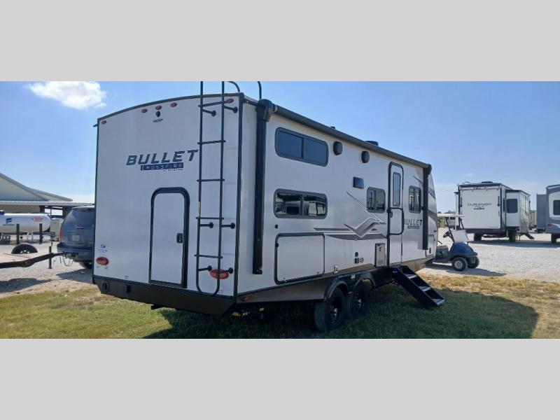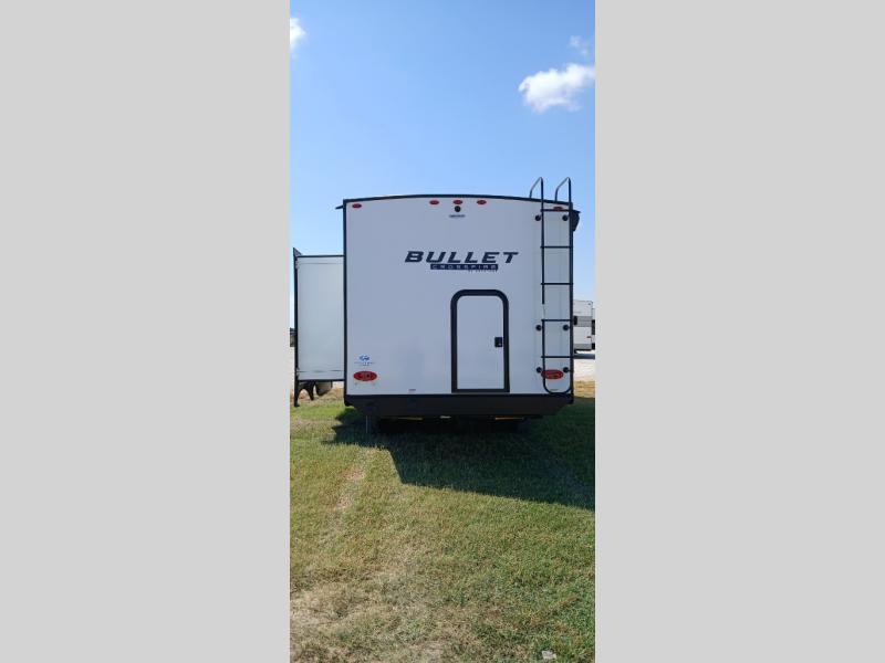 Each Bullet Crossfire Double Axle travel trailer by Keystone is constructed with a NORCO HSLA steel/automotive deposition coated frame assembled with huck bolts for durability. The TORFLEX rubber torsion suspension will provide smooth towing, and the one-piece ABS enclosed underbelly will help extend your camping season. Setting up your trailer will be a breeze with the electric tongue jack and four electric stabilizer jacks, and there is an electric awning with adjustable arms and LED lighting for an inviting outdoor living space. The affordable, high-quality RV solar energy system, SolarFlex Protect 220 comes standard with each model and will allow you to go off-grid when you want, or you can choose the optional SolarFlex Discover 440i for even more off-grid capabilities. Inside, you'll find fabric night shades, Beauflor woven flooring in the slides, full depth cabinets with full extension drawer guides, and many more comforts.