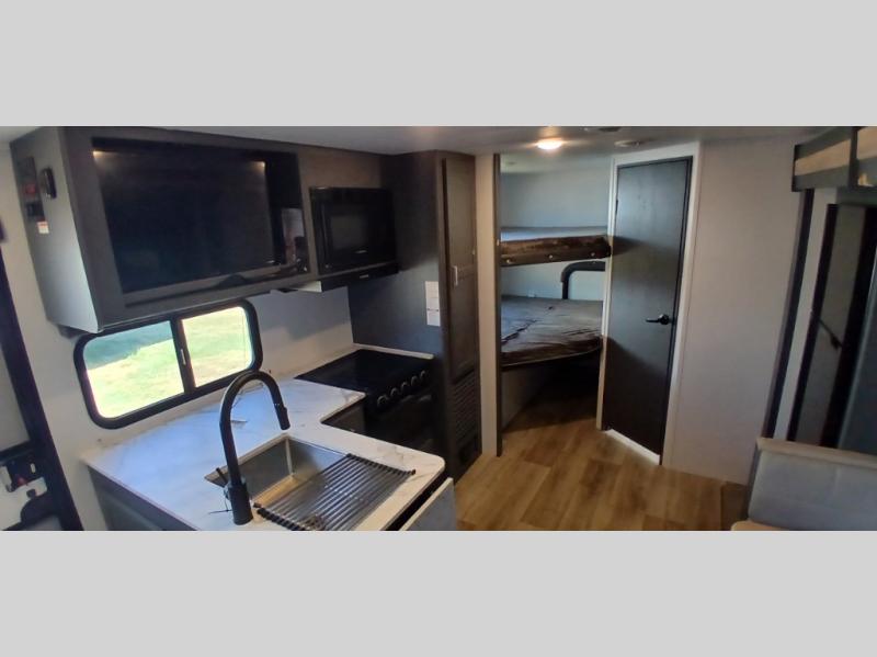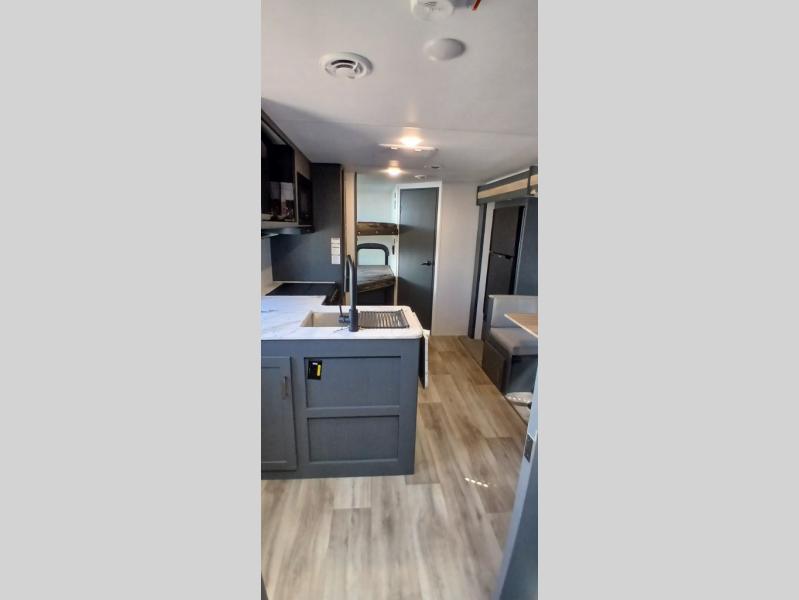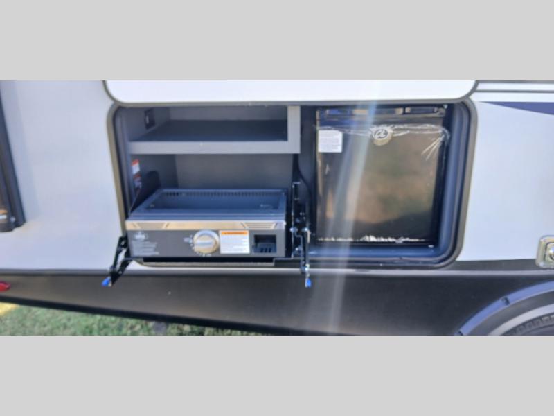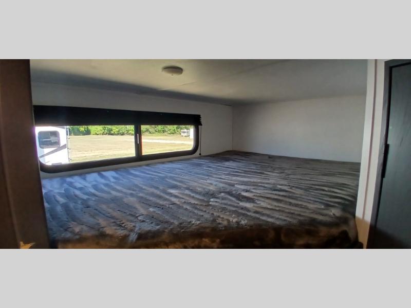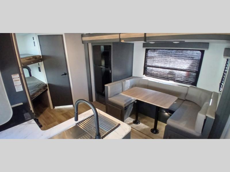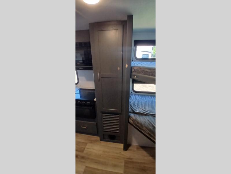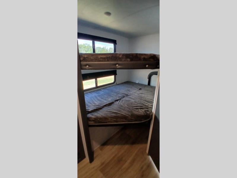 You can easily sleep eight in this travel trailer thanks to the 51" x 74" double-size bunks, the U-shaped Do-More dinette table, and the queen bed in the front bedroom. There is a laundry chute in the bedroom that will go straight to the pass-through storage for convenience. Whip up your best meals on the three burner gas range, or use the Furrion microwave oven. You can dine around the dinette, or take your plate outdoors to sit under the 15' power awning with LED lights, plus there is an outdoor kitchen with a pull-out griddle and refrigerator.