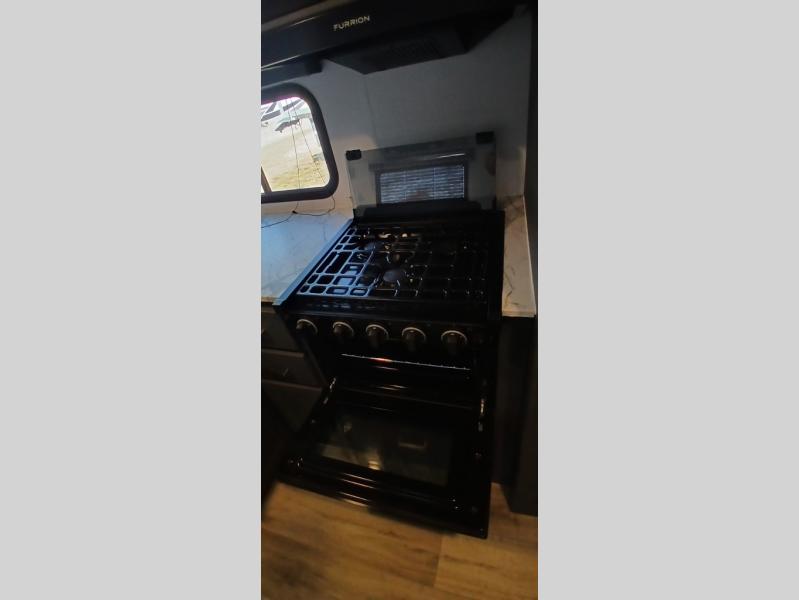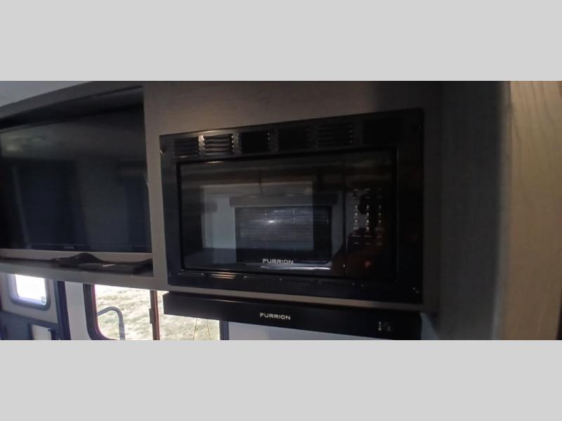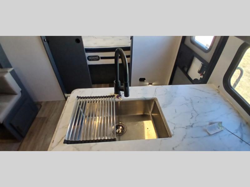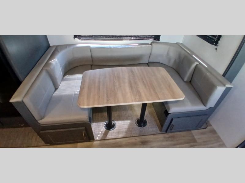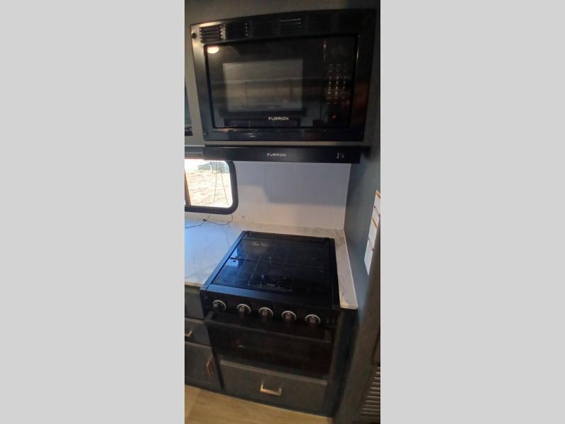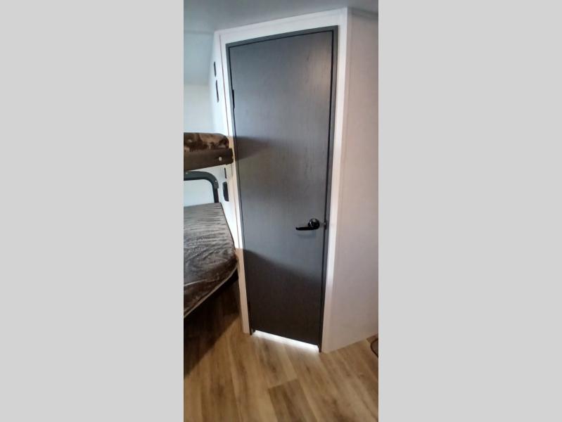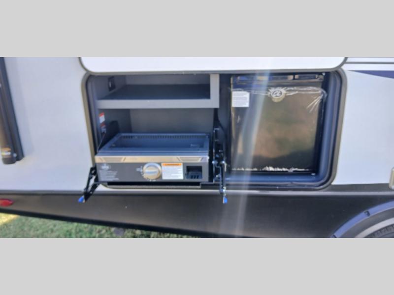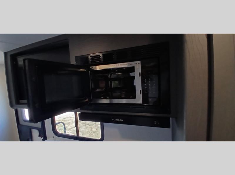 You can easily sleep eight in this travel trailer thanks to the 51" x 74" double-size bunks, the U-shaped Do-More dinette table, and the queen bed in the front bedroom. There is a laundry chute in the bedroom that will go straight to the pass-through storage for convenience. Whip up your best meals on the three burner gas range, or use the Furrion microwave oven. You can dine around the dinette, or take your plate outdoors to sit under the 15' power awning with LED lights, plus there is an outdoor kitchen with a pull-out griddle and refrigerator.
