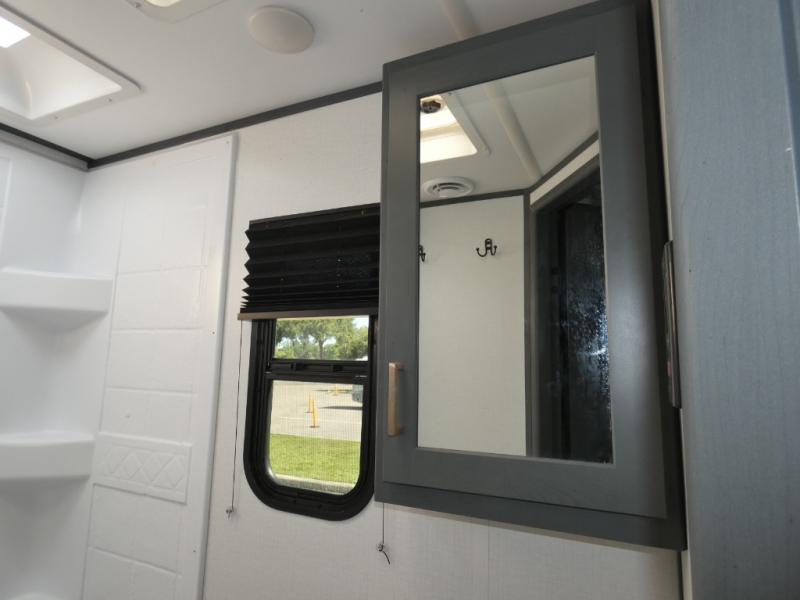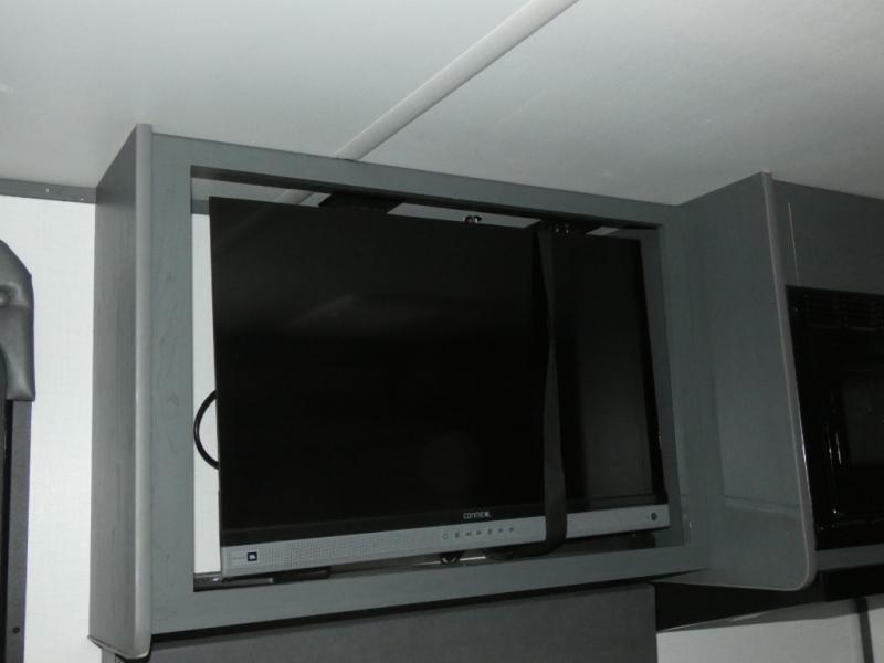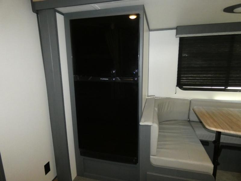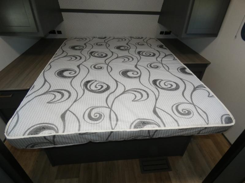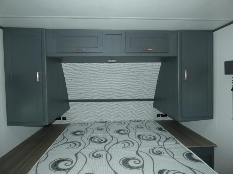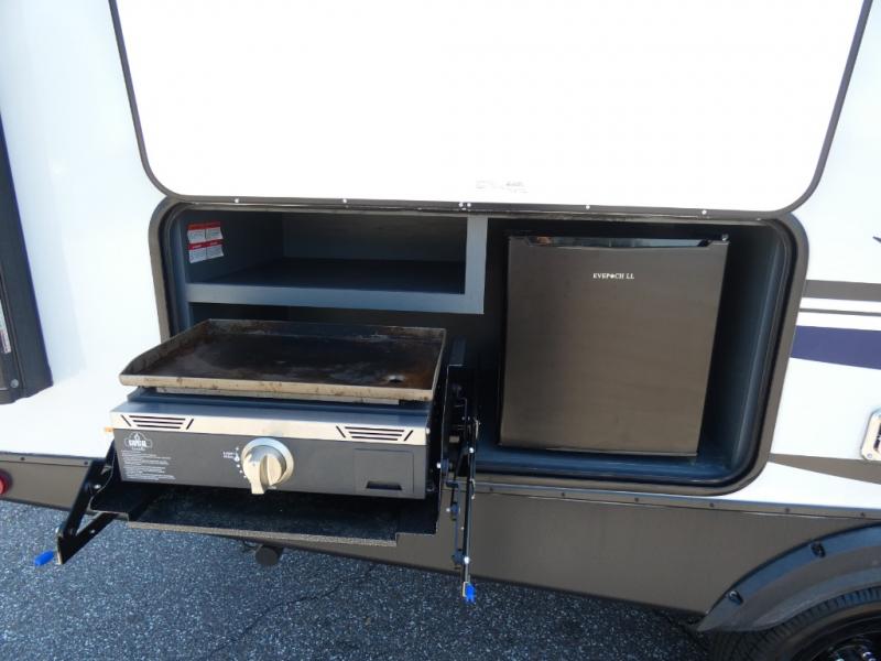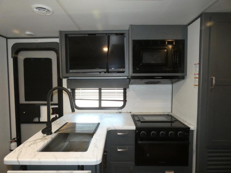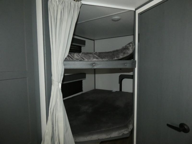 You can easily sleep eight in this travel trailer thanks to the 51" x 74" double-size bunks, the U-shaped Do-More dinette table, and the queen bed in the front bedroom. There is a laundry chute in the bedroom that will go straight to the pass-through storage for convenience. Whip up your best meals on the three burner gas range, or use the Furrion microwave oven. You can dine around the dinette, or take your plate outdoors to sit under the 15' power awning with LED lights, plus there is an outdoor kitchen with a pull-out griddle and refrigerator.