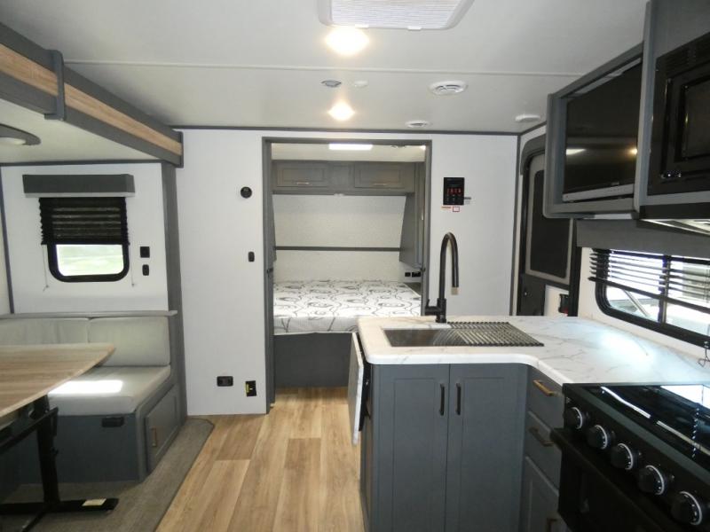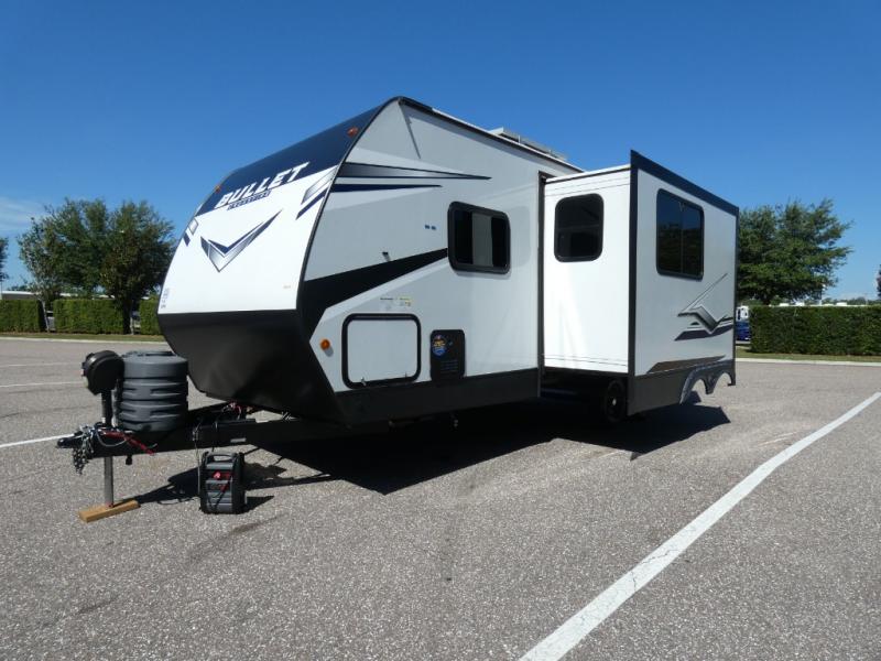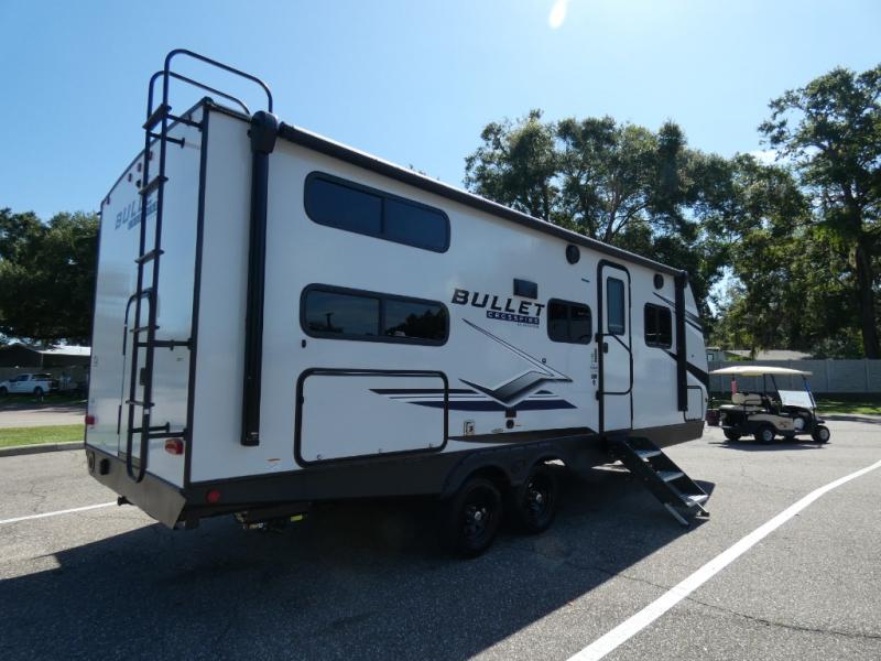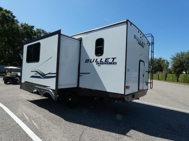 Each Bullet Crossfire Double Axle travel trailer by Keystone is constructed with a NORCO HSLA steel/automotive deposition coated frame assembled with huck bolts for durability. The TORFLEX rubber torsion suspension will provide smooth towing, and the one-piece ABS enclosed underbelly will help extend your camping season. Setting up your trailer will be a breeze with the electric tongue jack and four electric stabilizer jacks, and there is an electric awning with adjustable arms and LED lighting for an inviting outdoor living space. The affordable, high-quality RV solar energy system, SolarFlex Protect 220 comes standard with each model and will allow you to go off-grid when you want. Inside, you'll find fabric night shades, Beauflor woven flooring in the slides, full depth cabinets with full extension drawer guides, and many more comforts.