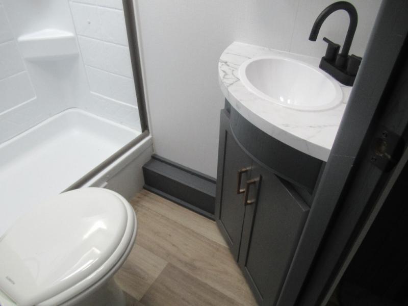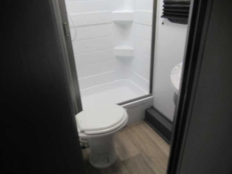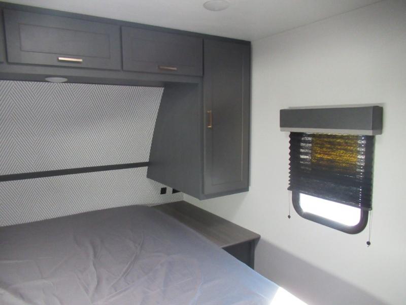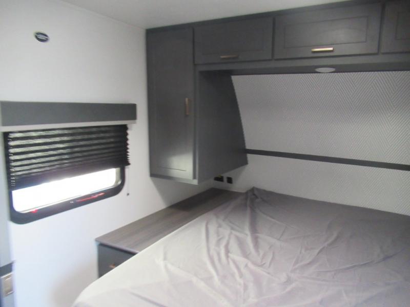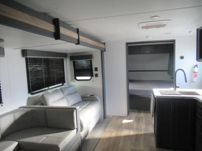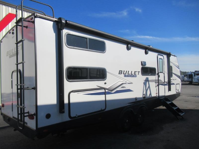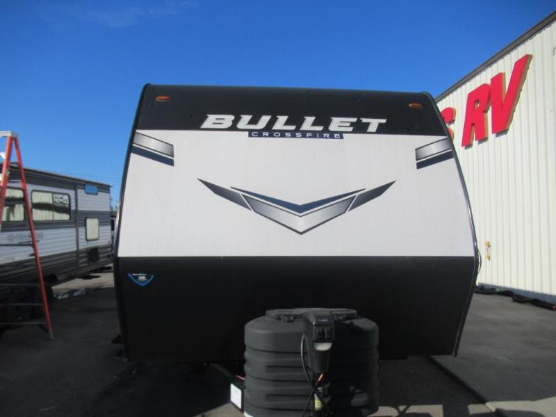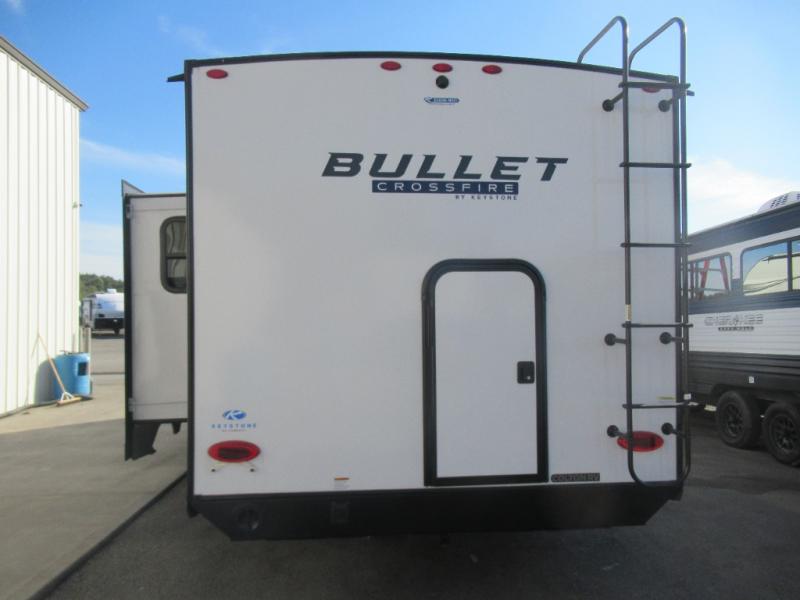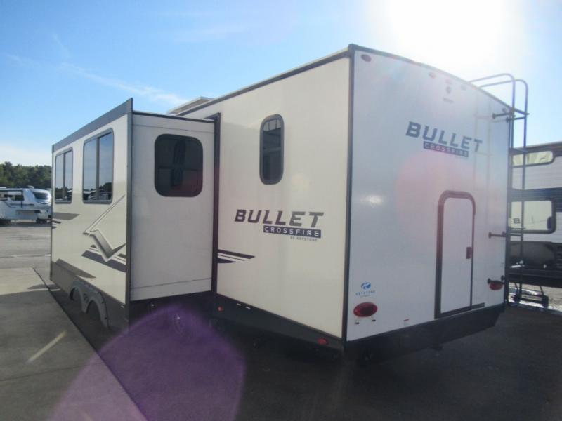 Each Bullet Crossfire Double Axle travel trailer by Keystone is constructed with a NORCO HSLA steel/automotive deposition coated frame assembled with huck bolts for durability. The TORFLEX rubber torsion suspension will provide smooth towing, and the one-piece ABS enclosed underbelly will help extend your camping season. Setting up your trailer will be a breeze with the electric tongue jack and four electric stabilizer jacks, and there is an electric awning with adjustable arms and LED lighting for an inviting outdoor living space. The affordable, high-quality RV solar energy system, SolarFlex Protect 220 comes standard with each model and will allow you to go off-grid when you want, or you can choose the optional SolarFlex Discover 440i for even more off-grid capabilities. Inside, you'll find fabric night shades, Beauflor woven flooring in the slides, full depth cabinets with full extension drawer guides, and many more comforts.