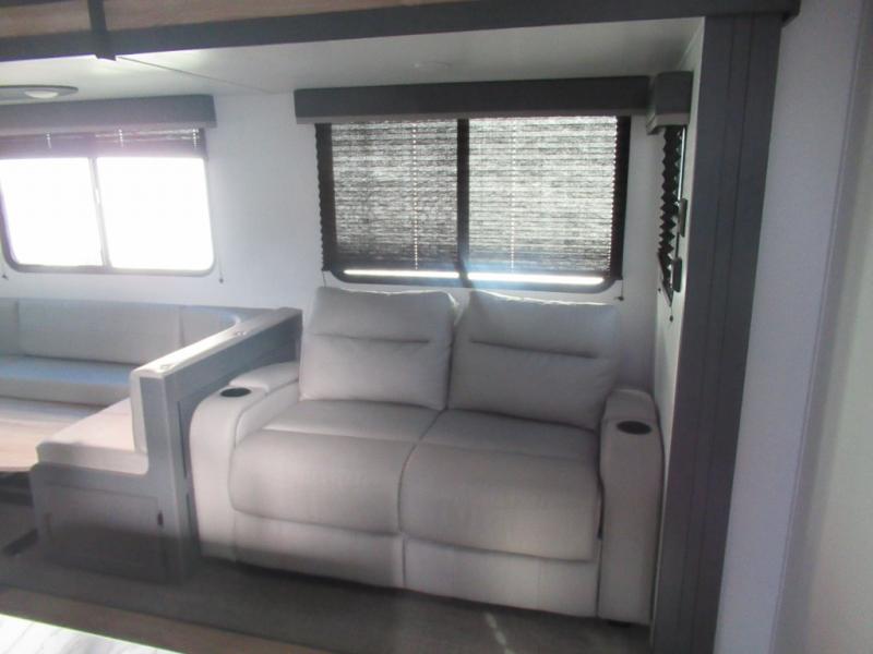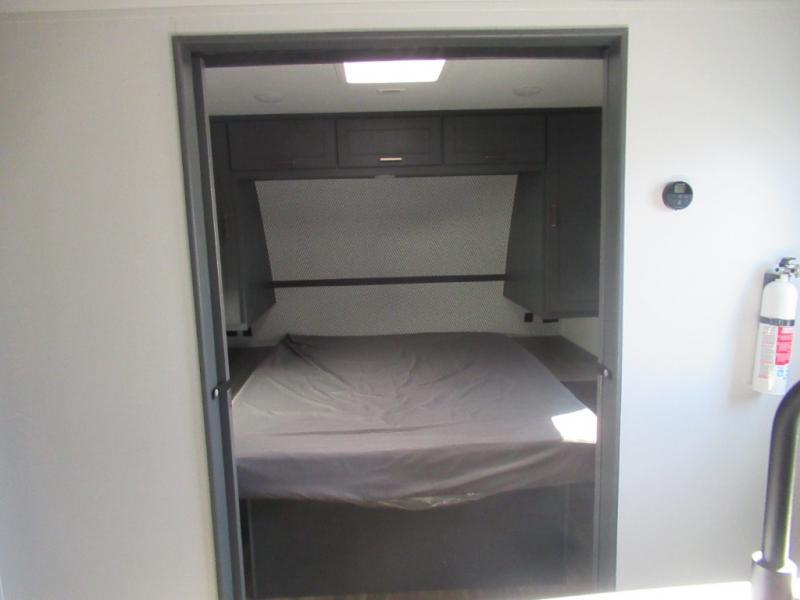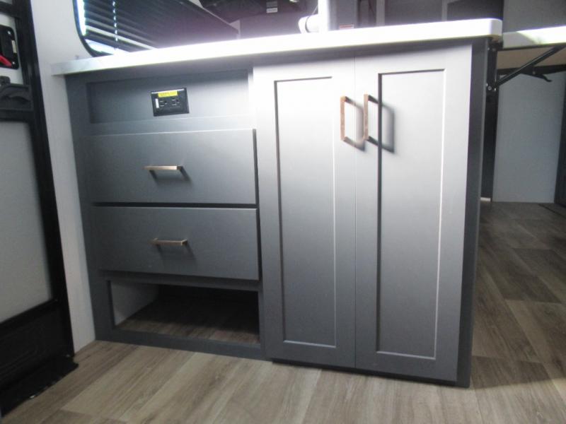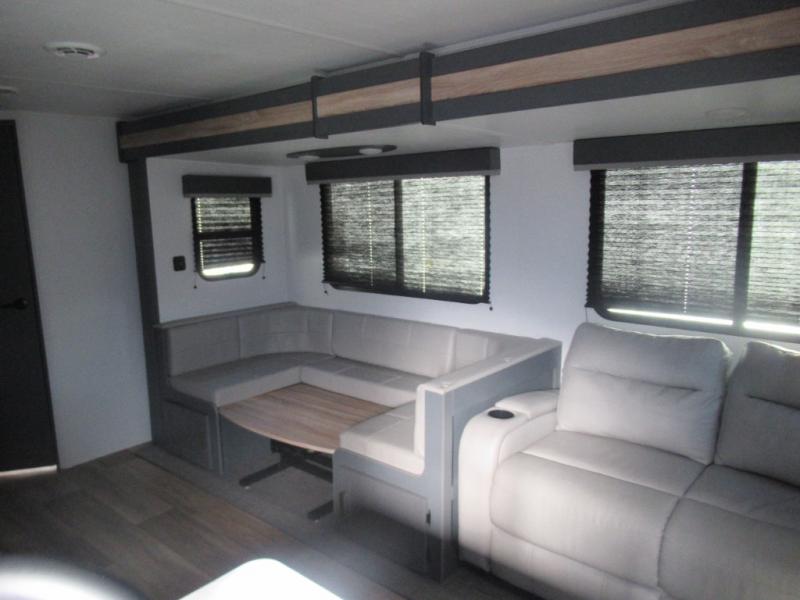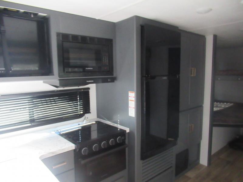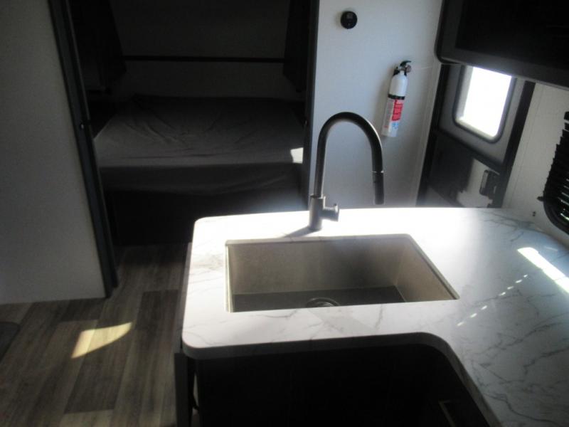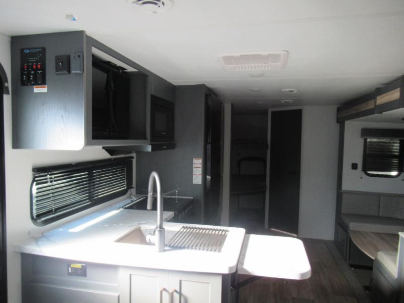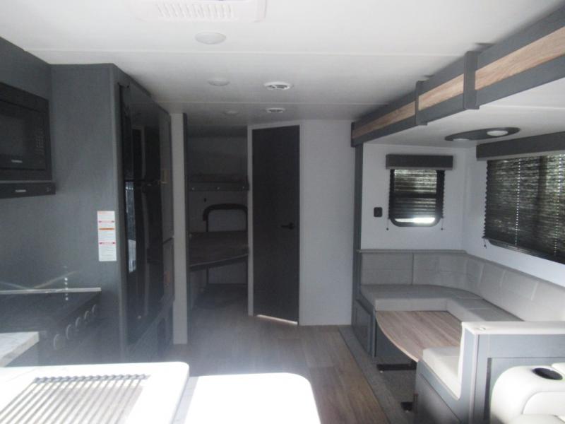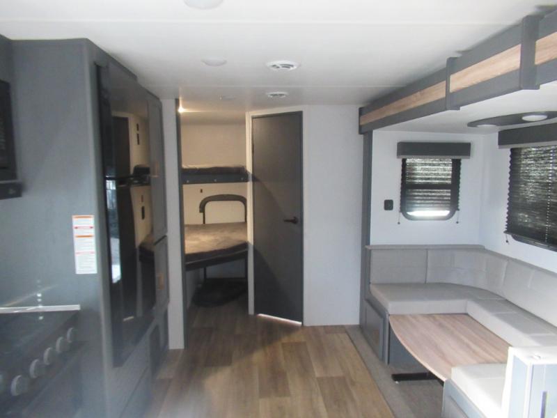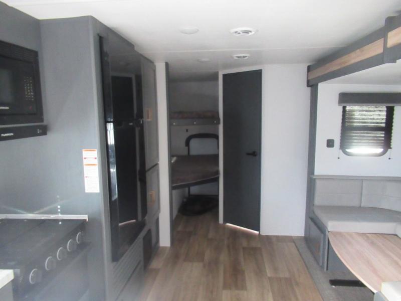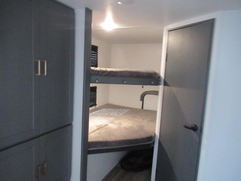 Double-size bunks make this travel trailer fun for all! There is even flip-up bunk for added storage and a rear cargo door where you can quickly unload gear from under the bunks. Whether your crew is playing a game around the U-shaped Do-More dinette table, relaxing on the tri-fold sofa sleeper, or making lunch on the outdoor kitchen, a good time is sure to be had! The chef will also love the interior kitchen with a three burner gas range/oven, a Furrion microwave, an 8 cu. ft. 12V refrigerator, and a flip-up counter for more prep space. And don't overlook the front private bedroom, complete with a walk-around queen bed, plus dual nightstands and dual wardrobes!