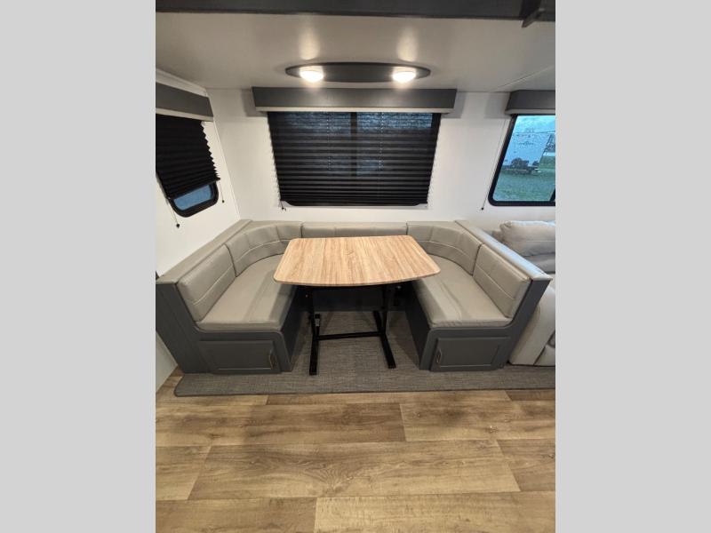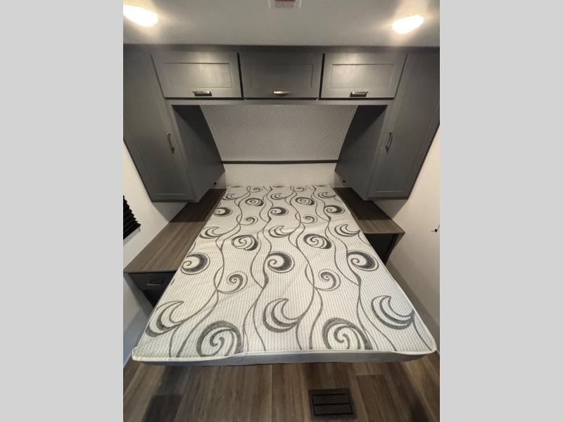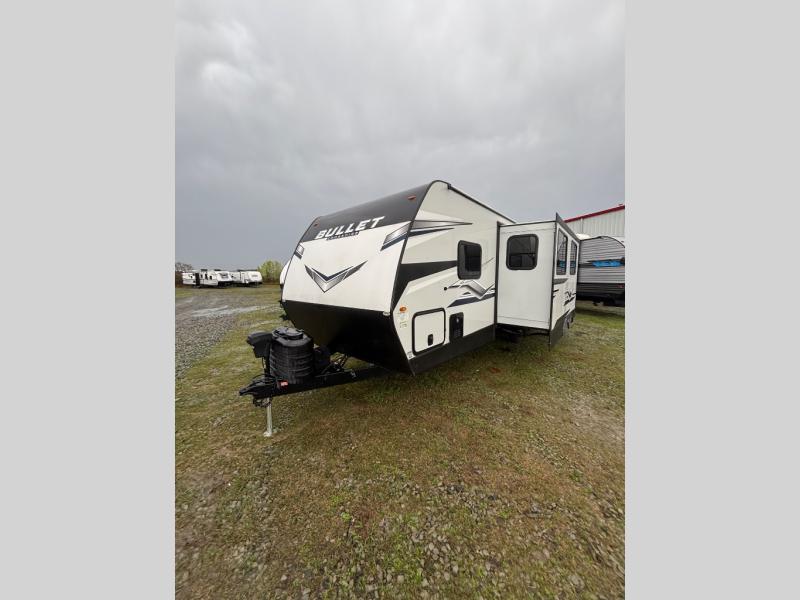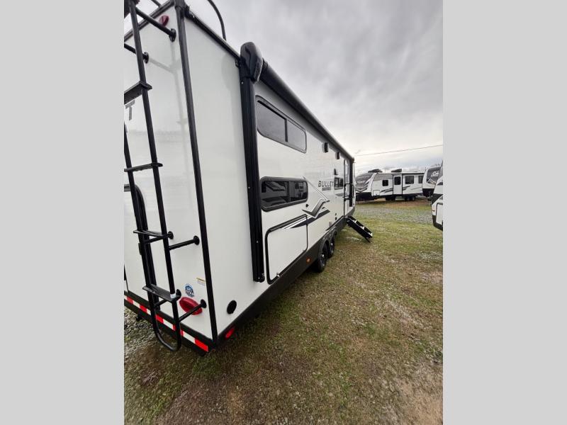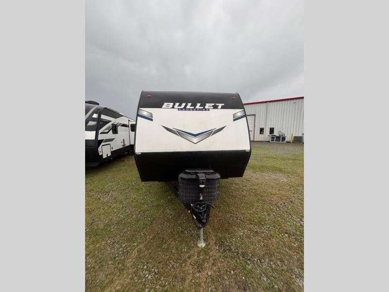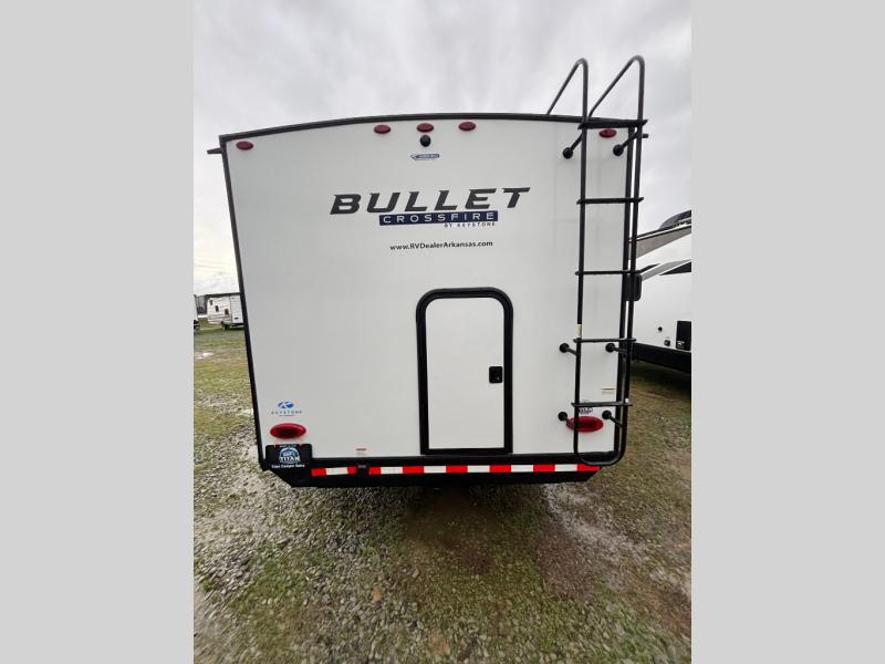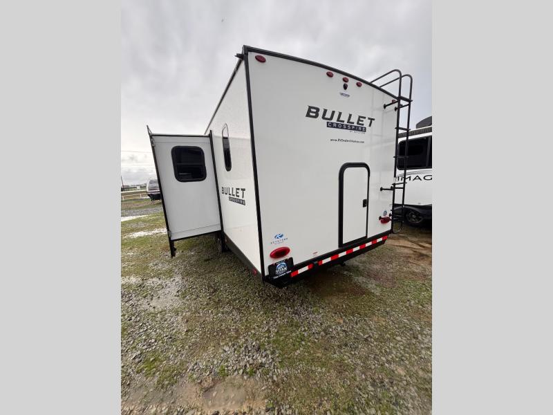 Each Bullet Crossfire Double Axle travel trailer by Keystone is constructed with a NORCO HSLA steel/automotive deposition coated frame assembled with huck bolts for durability. The TORFLEX rubber torsion suspension will provide smooth towing, and the one-piece ABS enclosed underbelly will help extend your camping season. Setting up your trailer will be a breeze with the electric tongue jack and four electric stabilizer jacks, and there is an electric awning with adjustable arms and LED lighting for an inviting outdoor living space. The affordable, high-quality RV solar energy system, SolarFlex Protect 220 comes standard with each model and will allow you to go off-grid when you want, or you can choose the optional SolarFlex Discover 440i for even more off-grid capabilities. Inside, you'll find fabric night shades, Beauflor woven flooring in the slides, full depth cabinets with full extension drawer guides, and many more comforts.