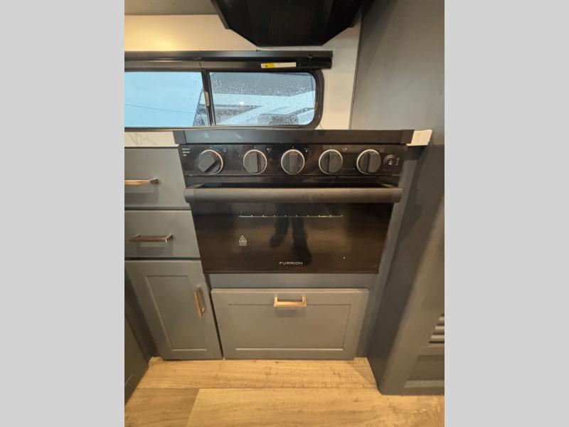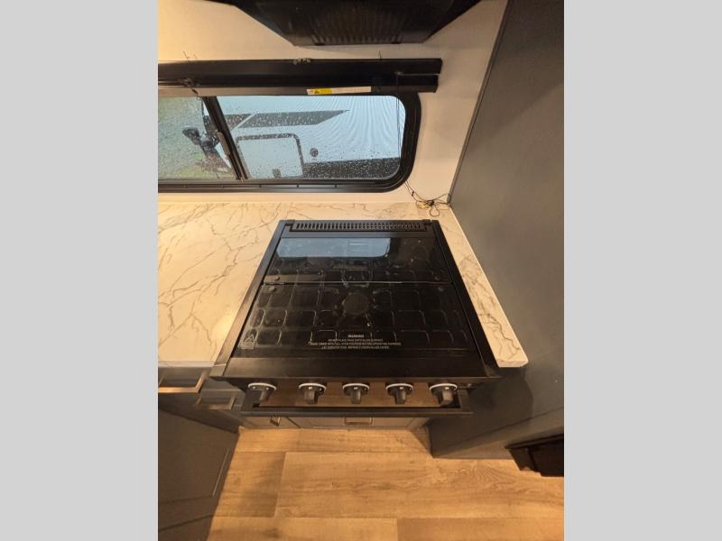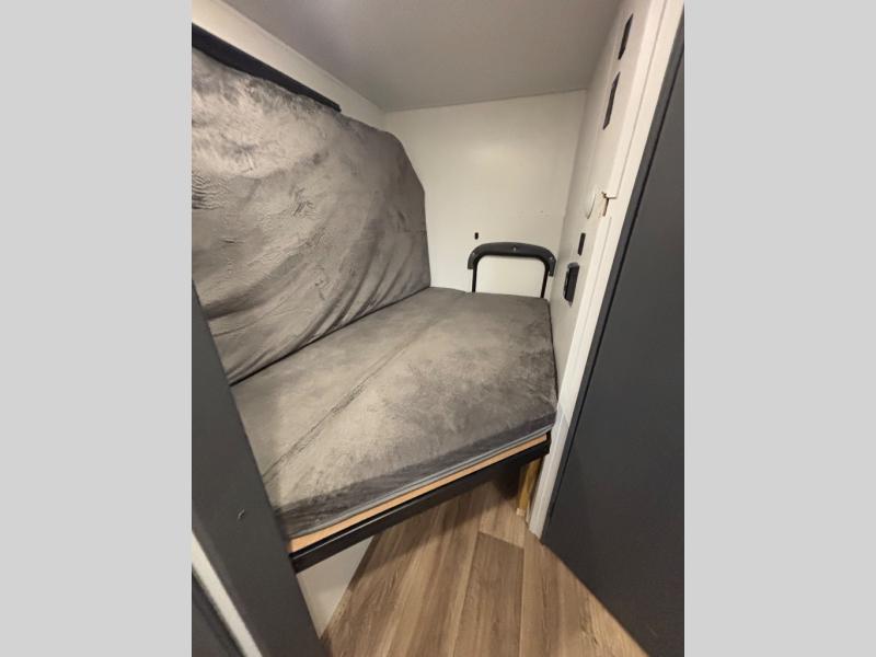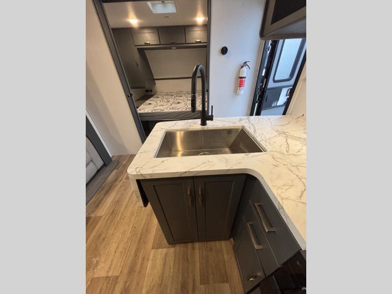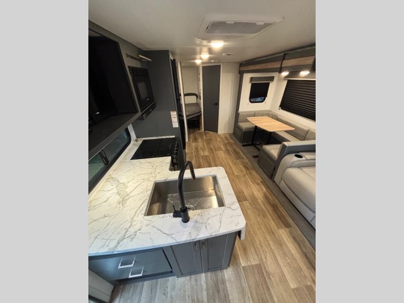 Double-size bunks make this travel trailer fun for all! There is even flip-up bunk for added storage and a rear cargo door where you can quickly unload gear from under the bunks. Whether your crew is playing a game around the U-shaped Do-More dinette table, relaxing on the tri-fold sofa sleeper, or making lunch on the outdoor kitchen, a good time is sure to be had! The chef will also love the interior kitchen with a three burner gas range/oven, a Furrion microwave, an 8 cu. ft. 12V refrigerator, and a flip-up counter for more prep space. And don't overlook the front private bedroom, complete with a walk-around queen bed, plus dual nightstands and dual wardrobes!