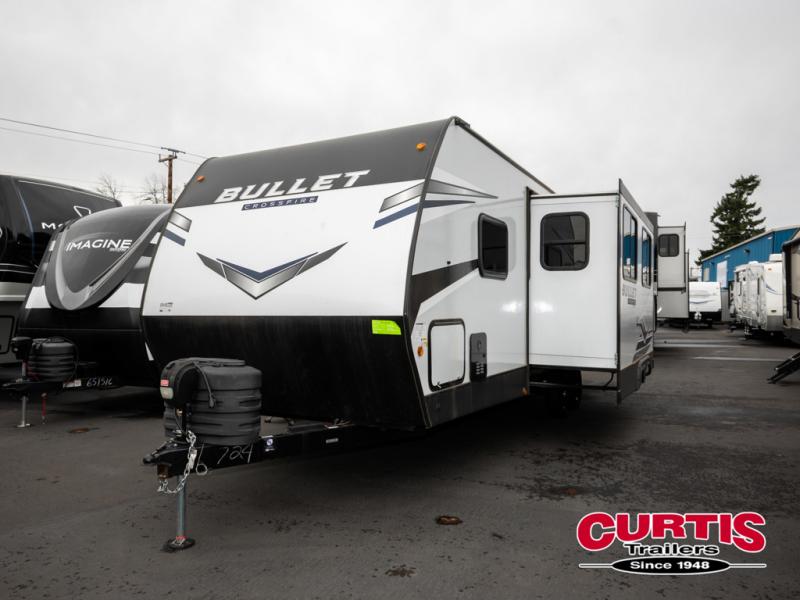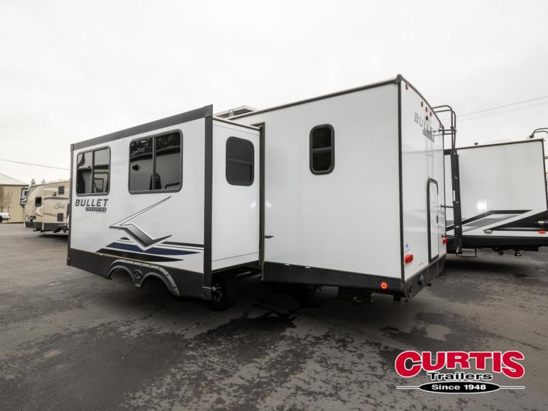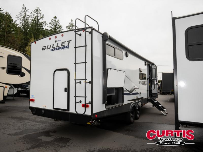 Each Bullet Crossfire Double Axle travel trailer by Keystone is constructed with a NORCO HSLA steel/automotive deposition coated frame assembled with huck bolts for durability. The TORFLEX rubber torsion suspension will provide smooth towing, and the one-piece ABS enclosed underbelly will help extend your camping season. Setting up your trailer will be a breeze with the electric tongue jack and four electric stabilizer jacks, and there is an electric awning with adjustable arms and LED lighting for an inviting outdoor living space. The affordable, high-quality RV solar energy system, SolarFlex Protect 220 comes standard with each model and will allow you to go off-grid when you want, or you can choose the optional SolarFlex Discover 440i for even more off-grid capabilities. Inside, you'll find fabric night shades, Beauflor woven flooring in the slides, full depth cabinets with full extension drawer guides, and many more comforts.