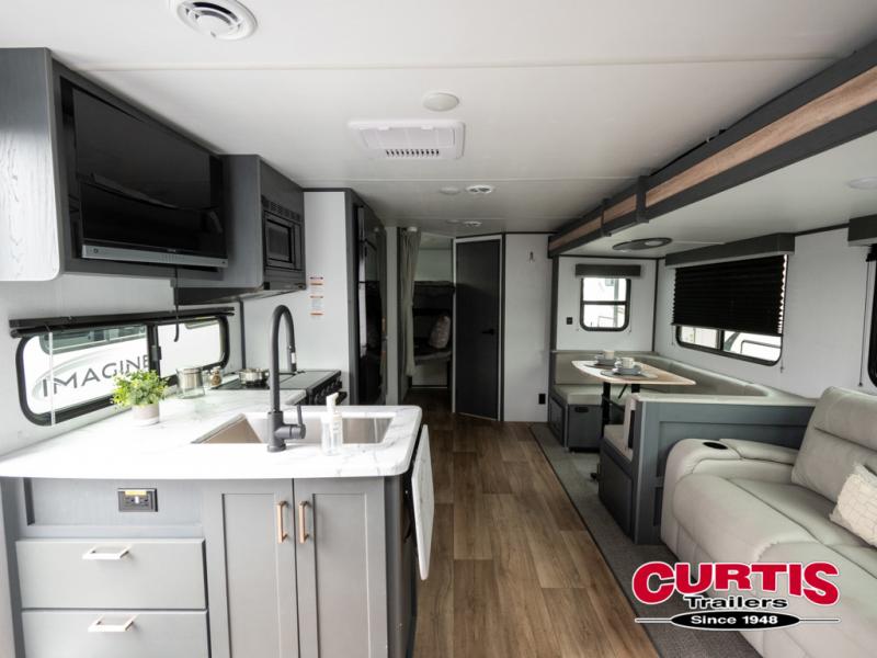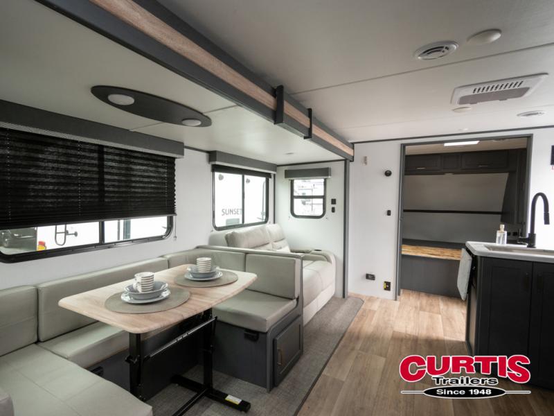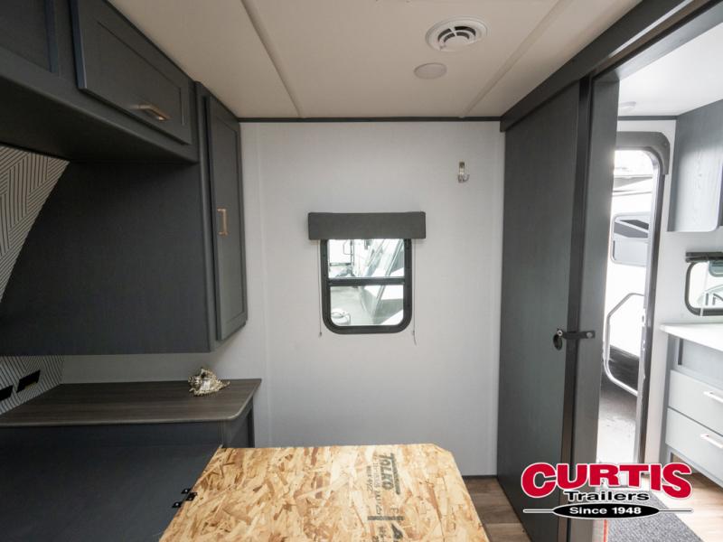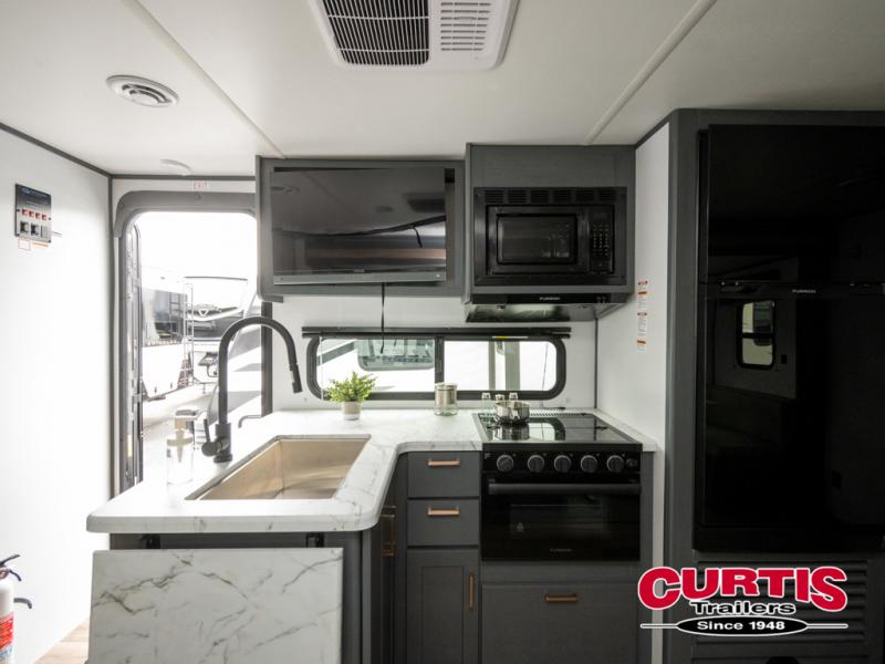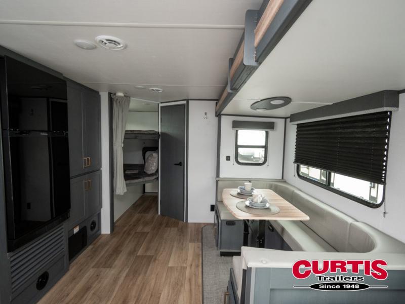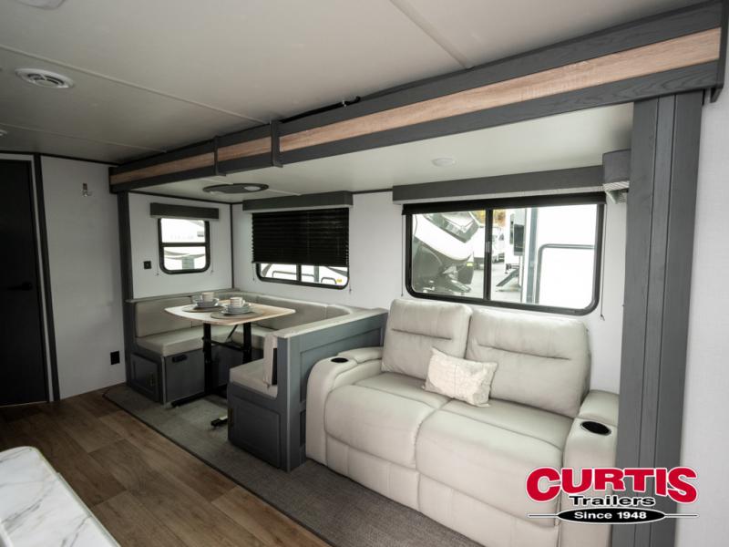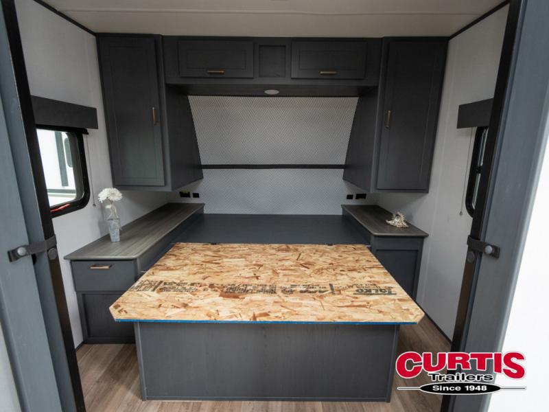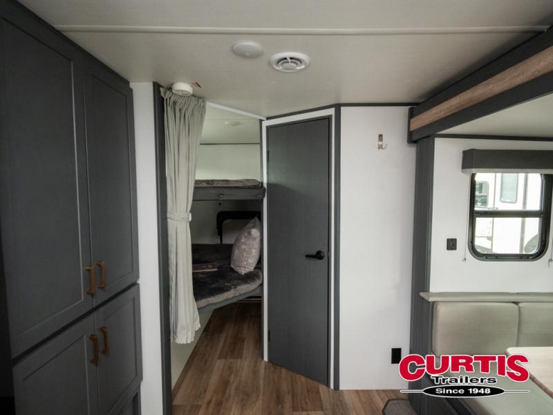 Double-size bunks make this travel trailer fun for all! There is even flip-up bunk for added storage and a rear cargo door where you can quickly unload gear from under the bunks. Whether your crew is playing a game around the Do-More dinette table, relaxing on the tri-fold sofa sleeper, or making lunch on the outdoor kitchen, a good time is sure to be had! The chef will also love the interior kitchen with a three burner gas range/oven, a Furrion microwave, an 8 cu. ft. 12V refrigerator, and a flip-up counter for more prep space. And don't overlook the front private bedroom, complete with a walk-around queen bed, plus dual nightstands and dual wardrobes!